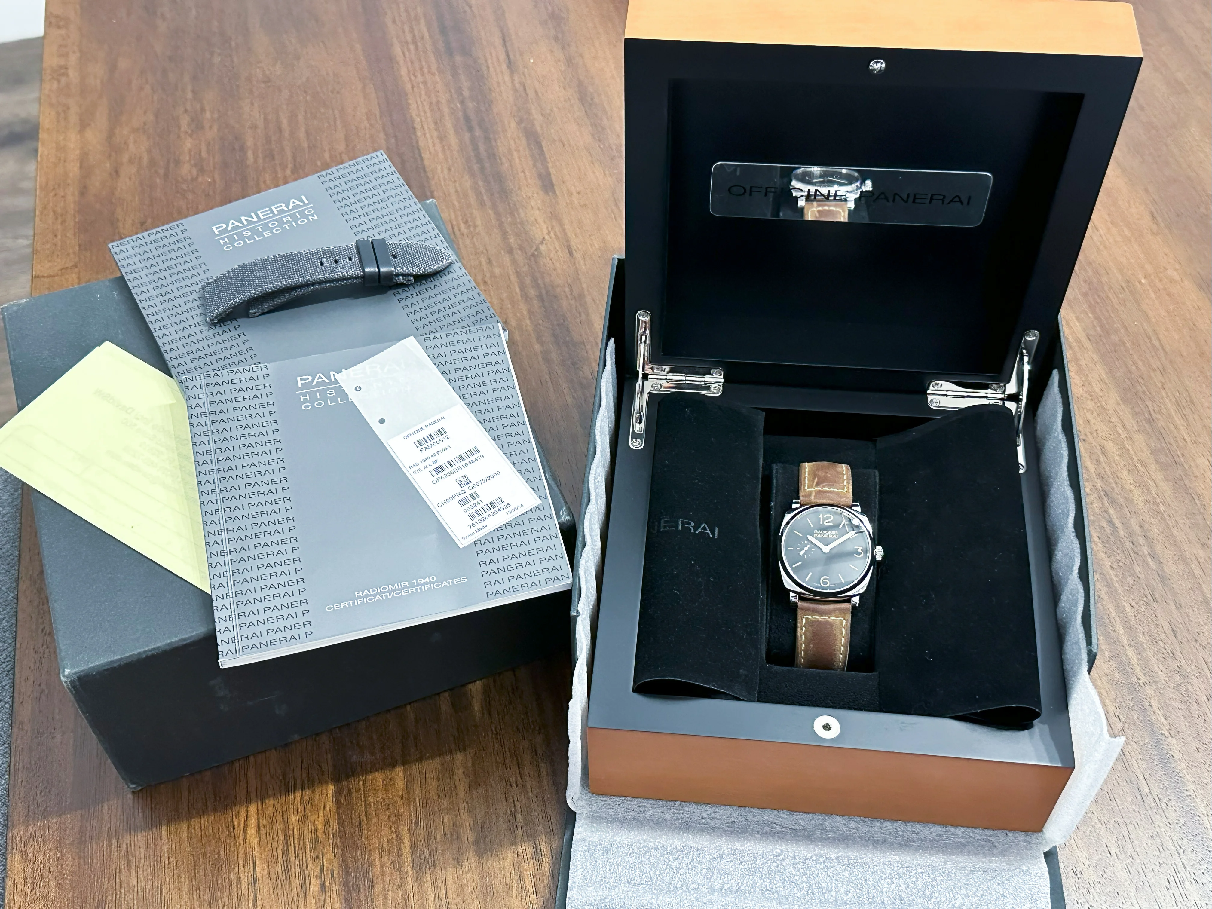 Includes the full kit. Boxes, manual, warranty manual, brown Panerai leather strap in near new condition.