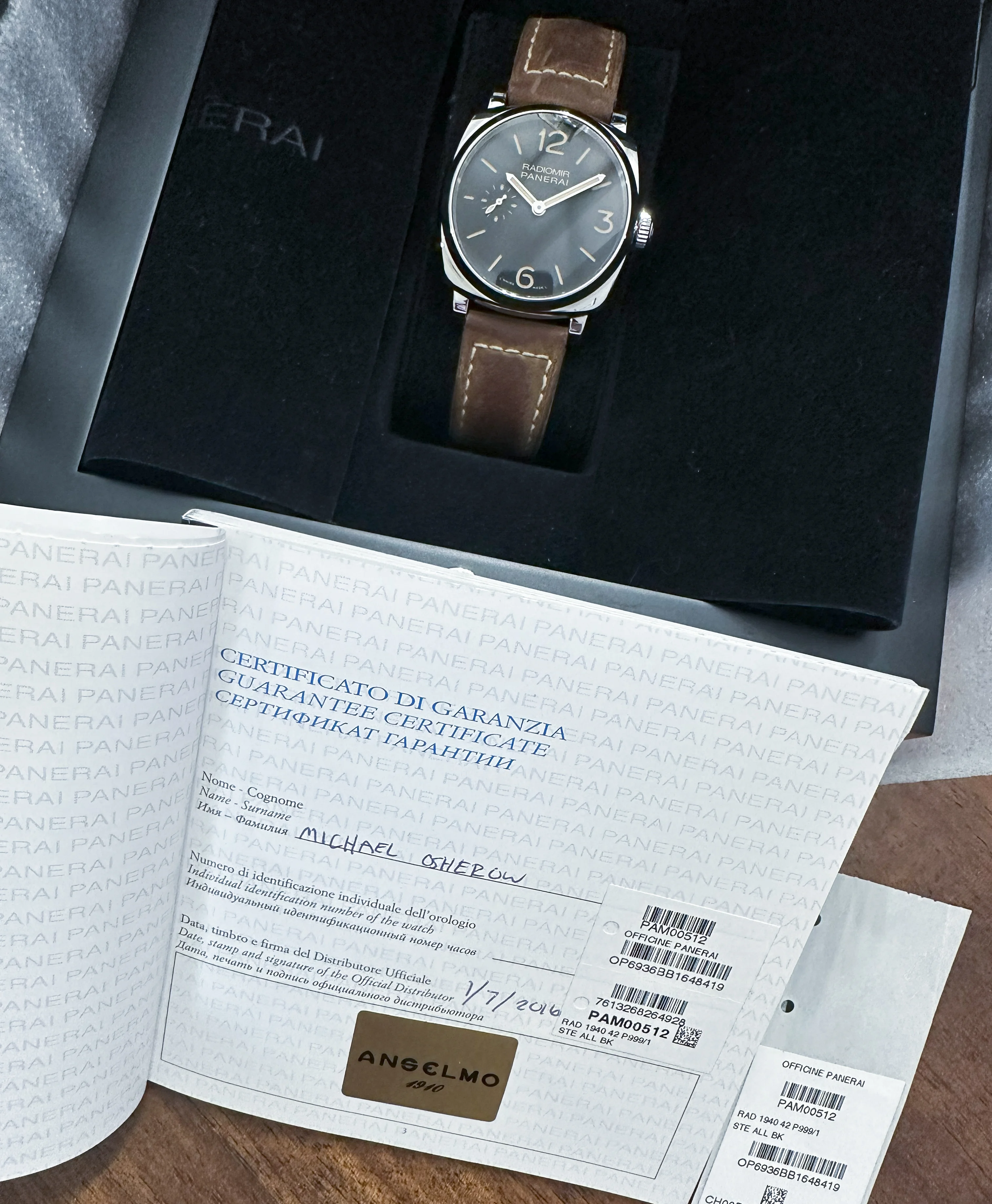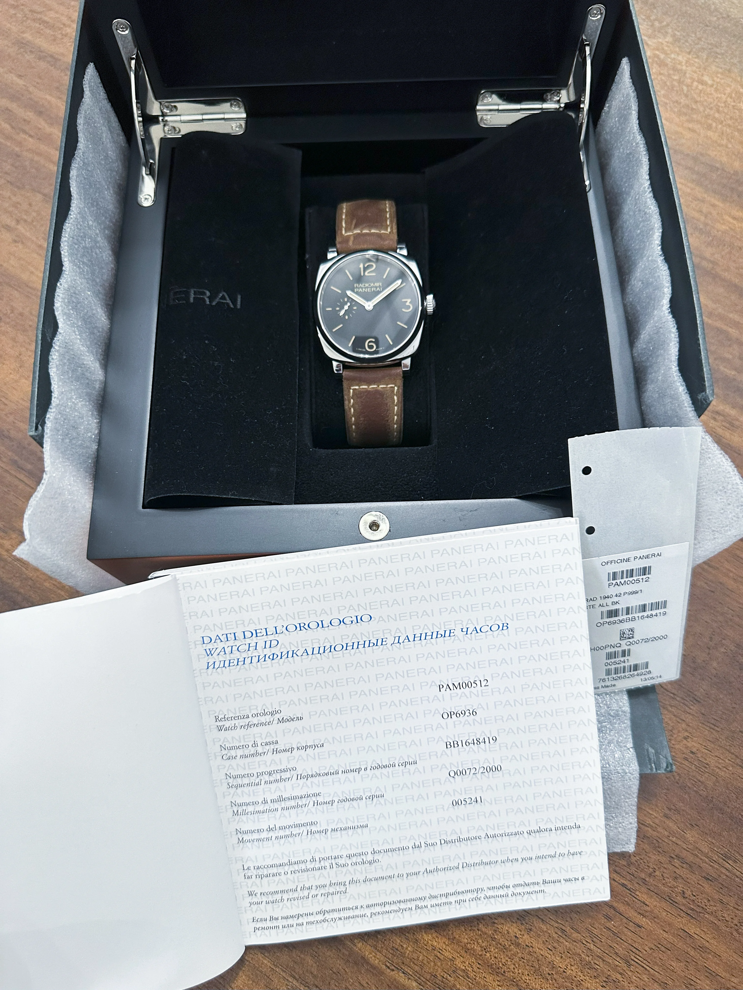 ·Hello Omega Forums! Today I am parting with a very desirable Panerai PAM00512 PAM512 Radiomir 1940 in 42mm. This watch was in production in 2013 and 2014 and this one is from 2014. It is in excellent condition, with minor surface marks from very light wear but nothing major. There are a light strap changing marks on the reverse. The crystal and dial are free from any marks and flawless. This is a perfect every day Panerai, with its great size and thinness, increasingly hard to come by. It is powered by the manual wind P.999/1 movement with a 60 hour power reserve.