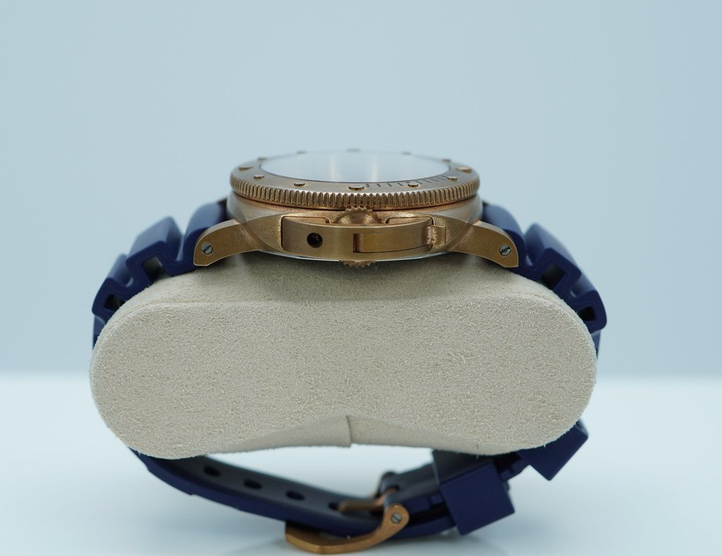 An Excellent, Unpolished Condition & Very Cool 2023 42mm Panerai PAM01074 Submersible Bronze Blu Abisso, 3 Days Power Reserve Automatic Movement, on Scamosciato Blue Leather Strap with Bronze Tang Buckle. Purchased from Officine Panerai Authorized Dealer in 01.2023. Watch running perfect with Non Issues. Full Set & Under 8 Years Factory Warranty.
