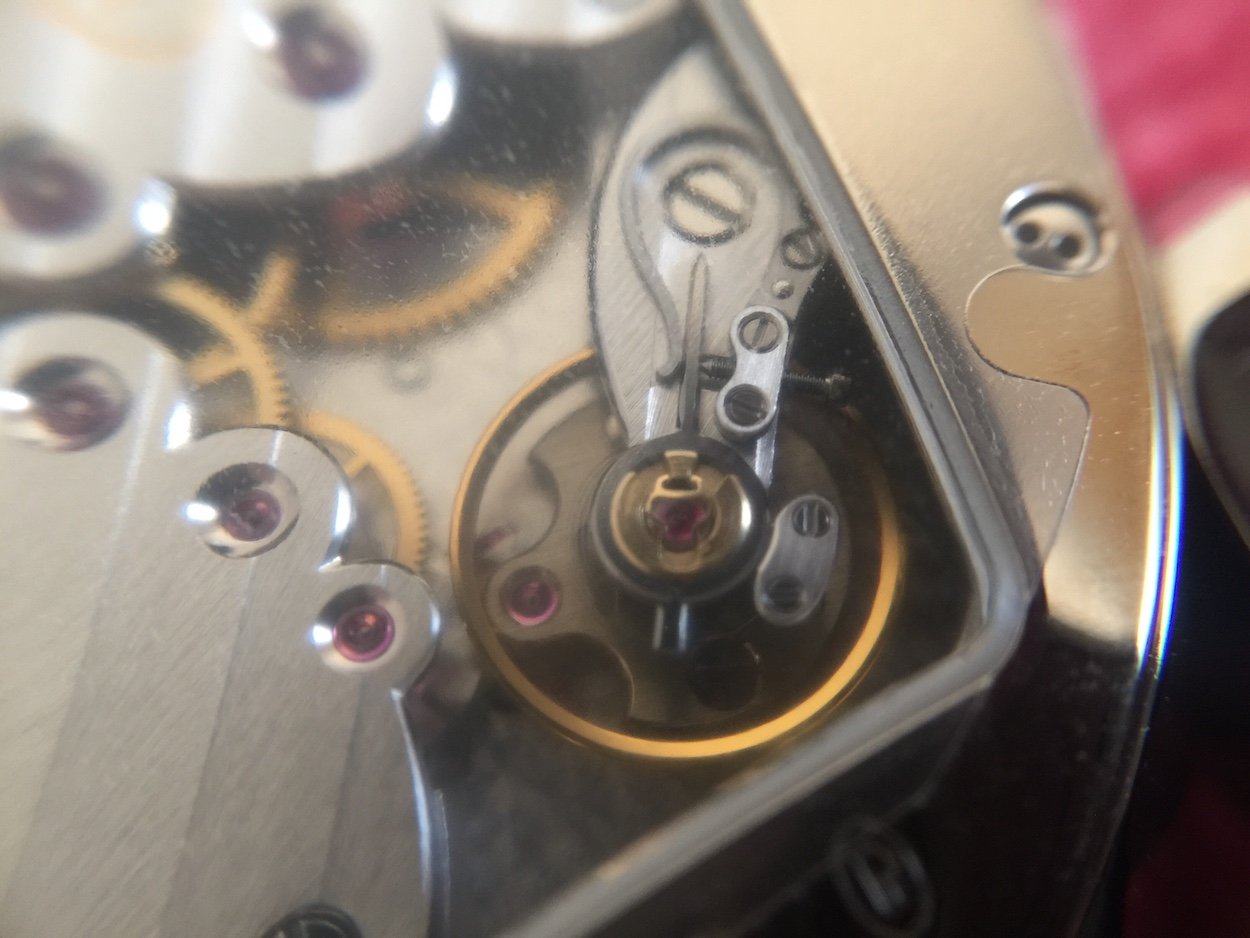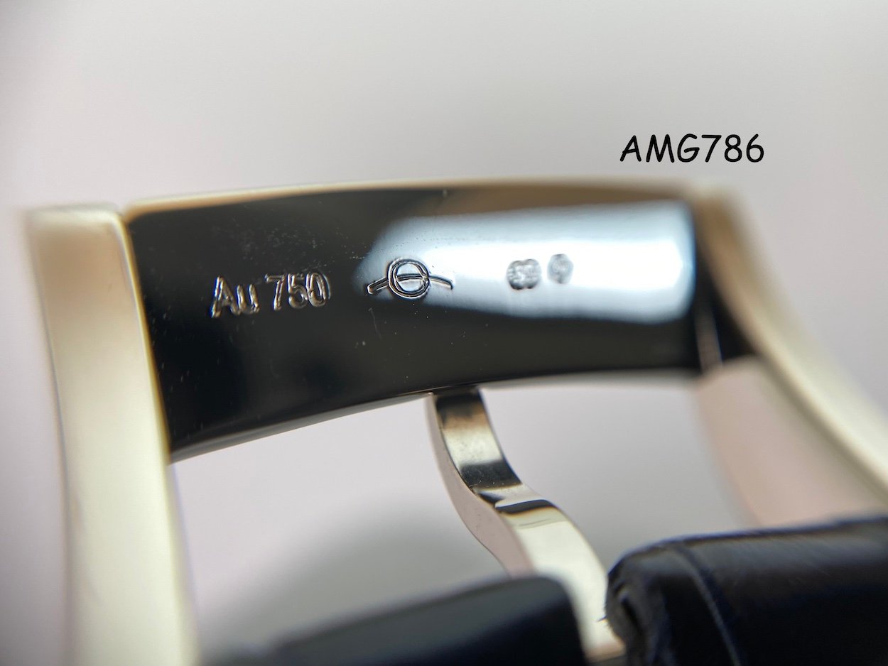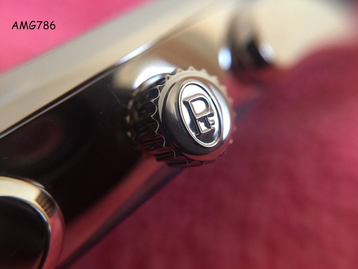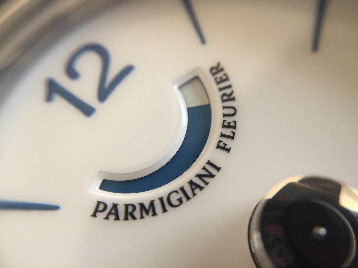 The hands themselves are made of blued aluminum; the unique design of the hands provide legibility against the white lacquered dial. Blue-colored hour markers in distinctive Parmigiani style complete a classic, handsome, and very readable dial design.