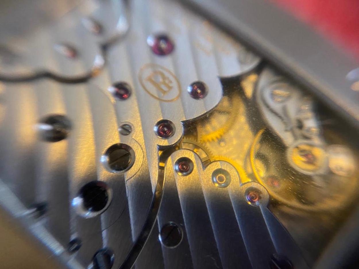 The in-house PF111 movement has two barrels, running in series, giving a lengthy eight-day power reserve. Geneva stripes going diagonally across the movement with the use of a swan neck fine adjustment system. The vaguely floral lines of the bridges give it a slightly ornate feel.