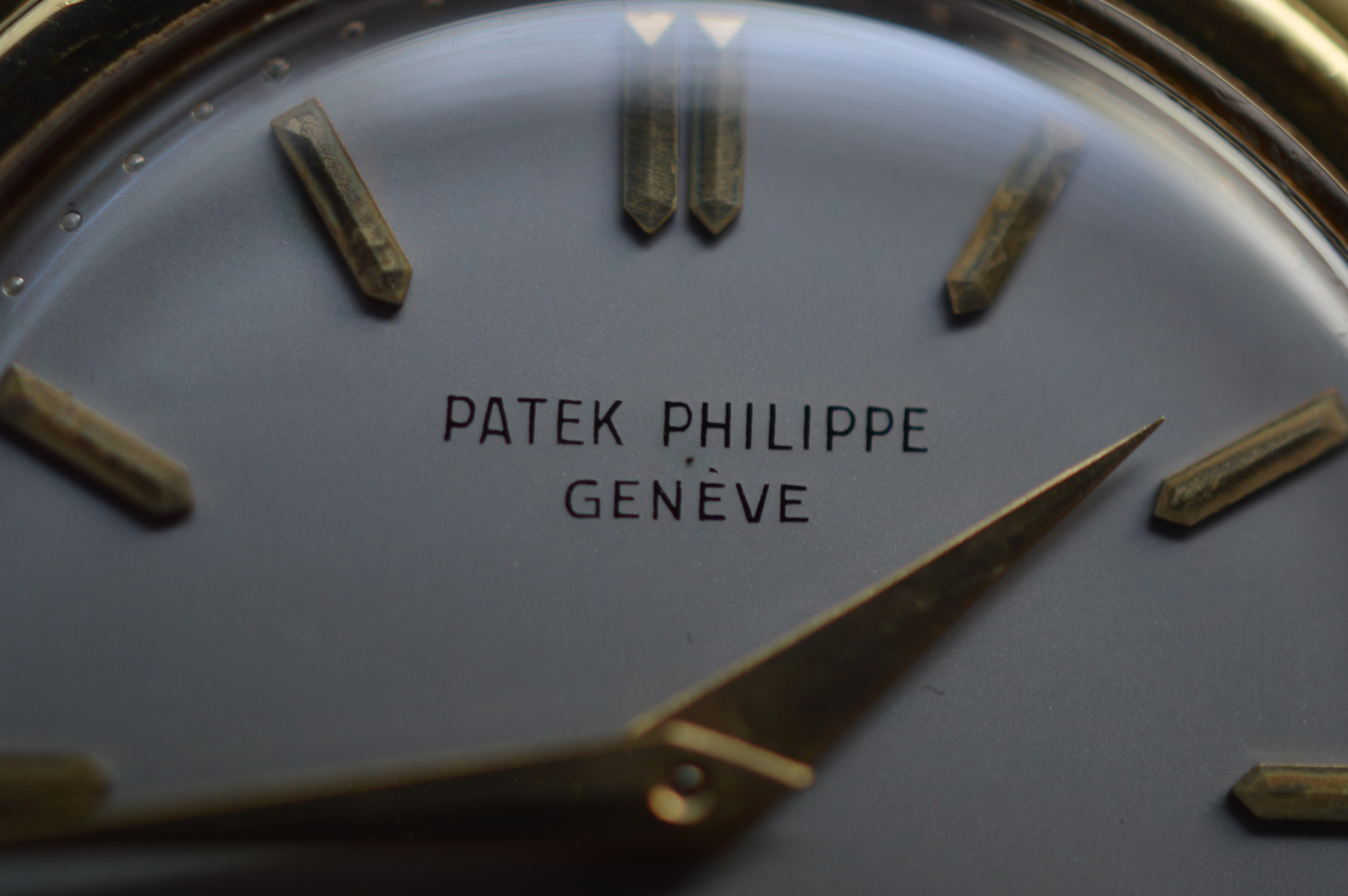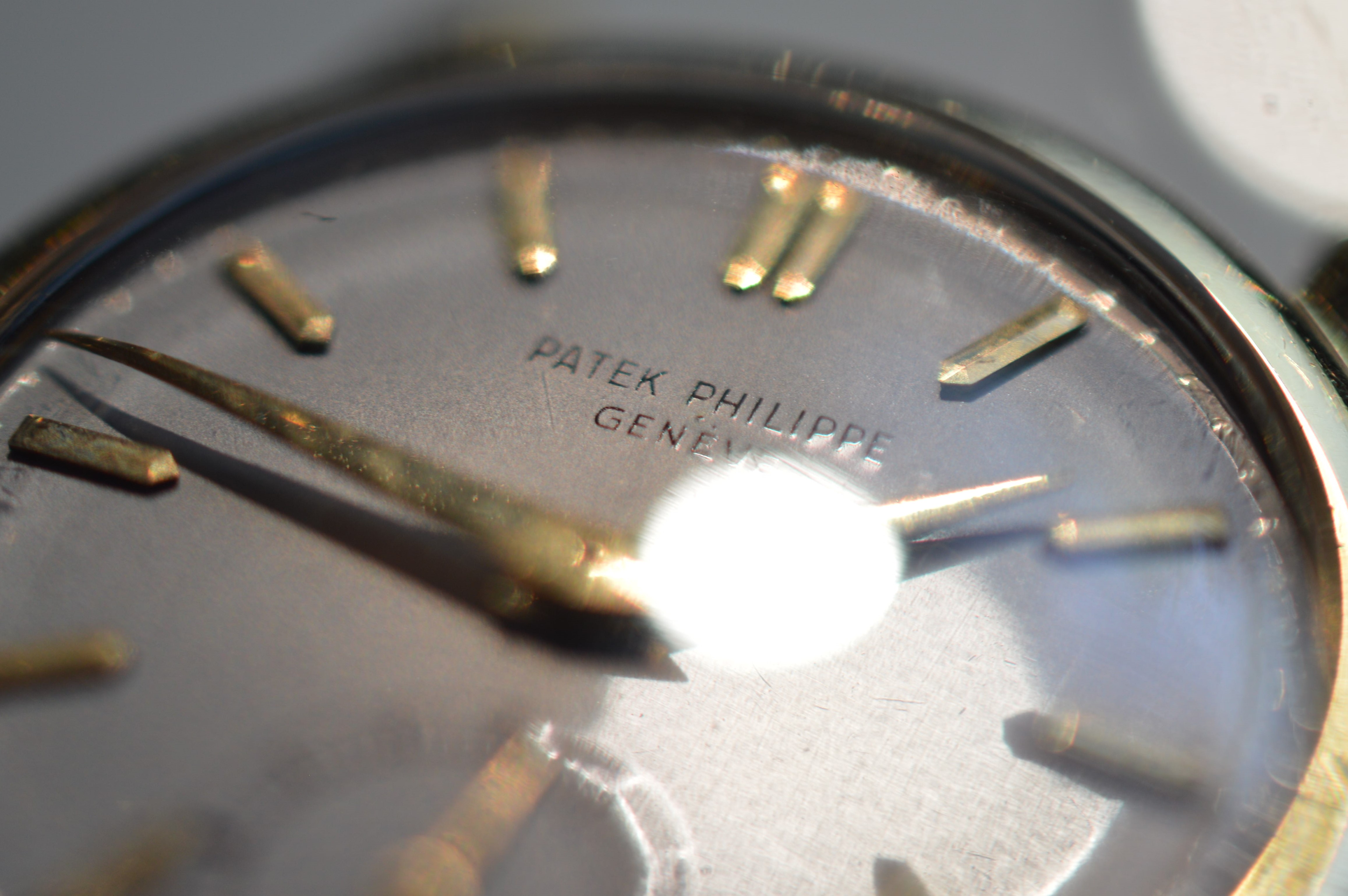 From what research I've done, the dial 'printing' is not actually printing. Instead of the standard use of tampography on a flat surface, vintage Patek Philippe dials used a process called 'champlevé,' where the script was first engraved, then filled in with vitreous enamel. This is why the script lacks serifs, and why it appears slightly raised.