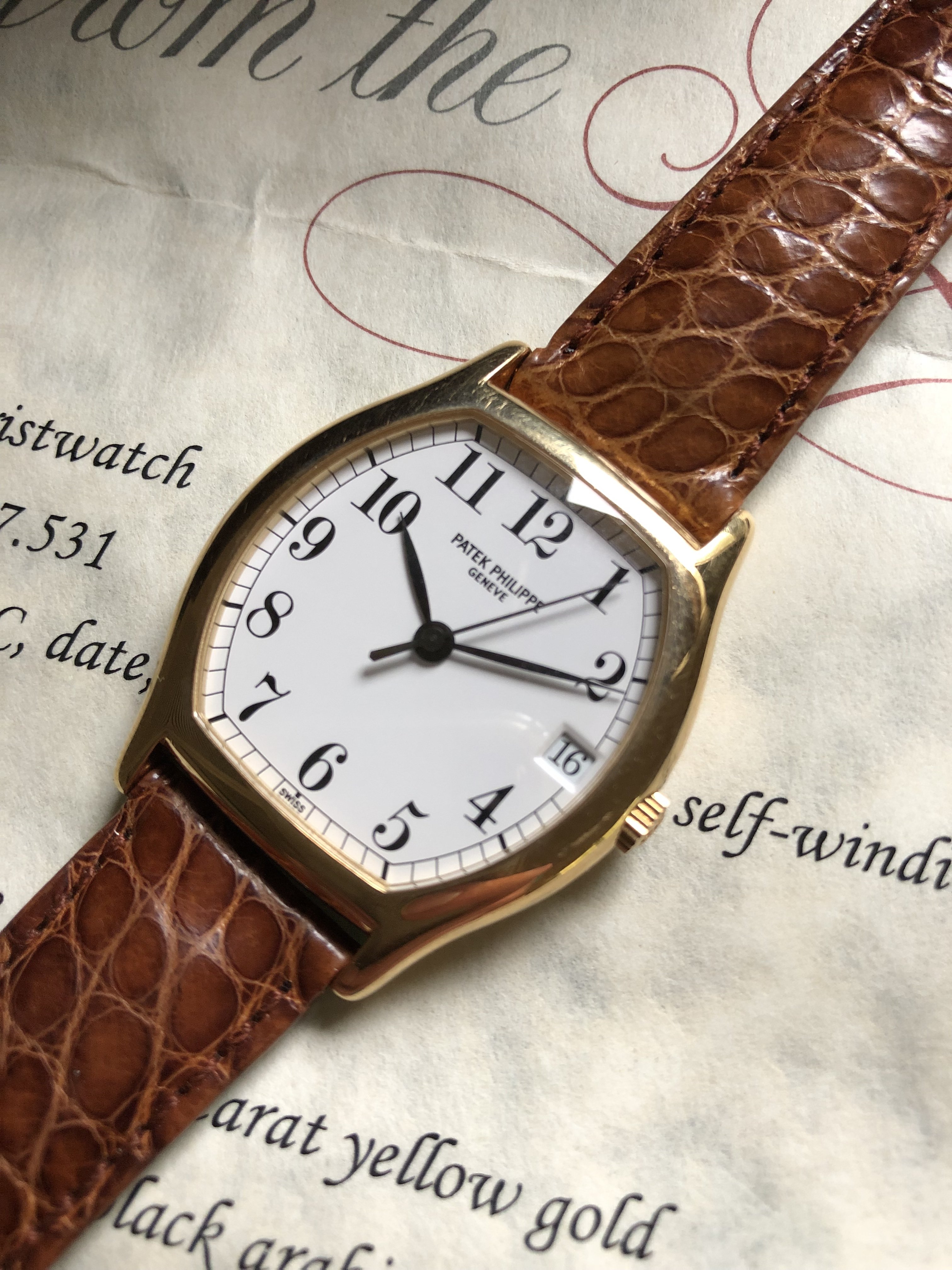·18kt ref. 5030 Gondolo with 34mm tonneau case, 1999, 30j movement, signed strap and buckle, extract, inner/outer boxes.