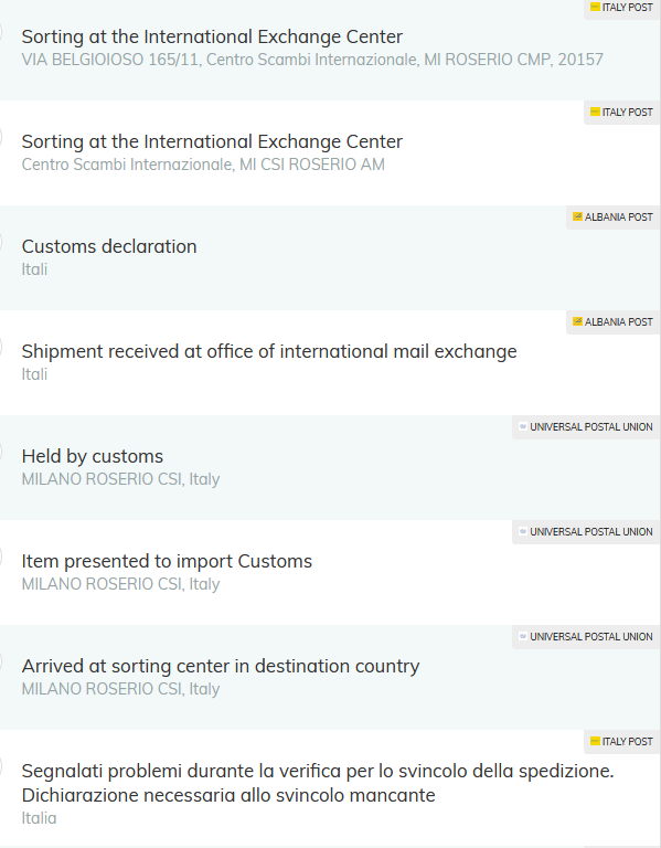 Tue 5th Sep - Item received at "Italy"