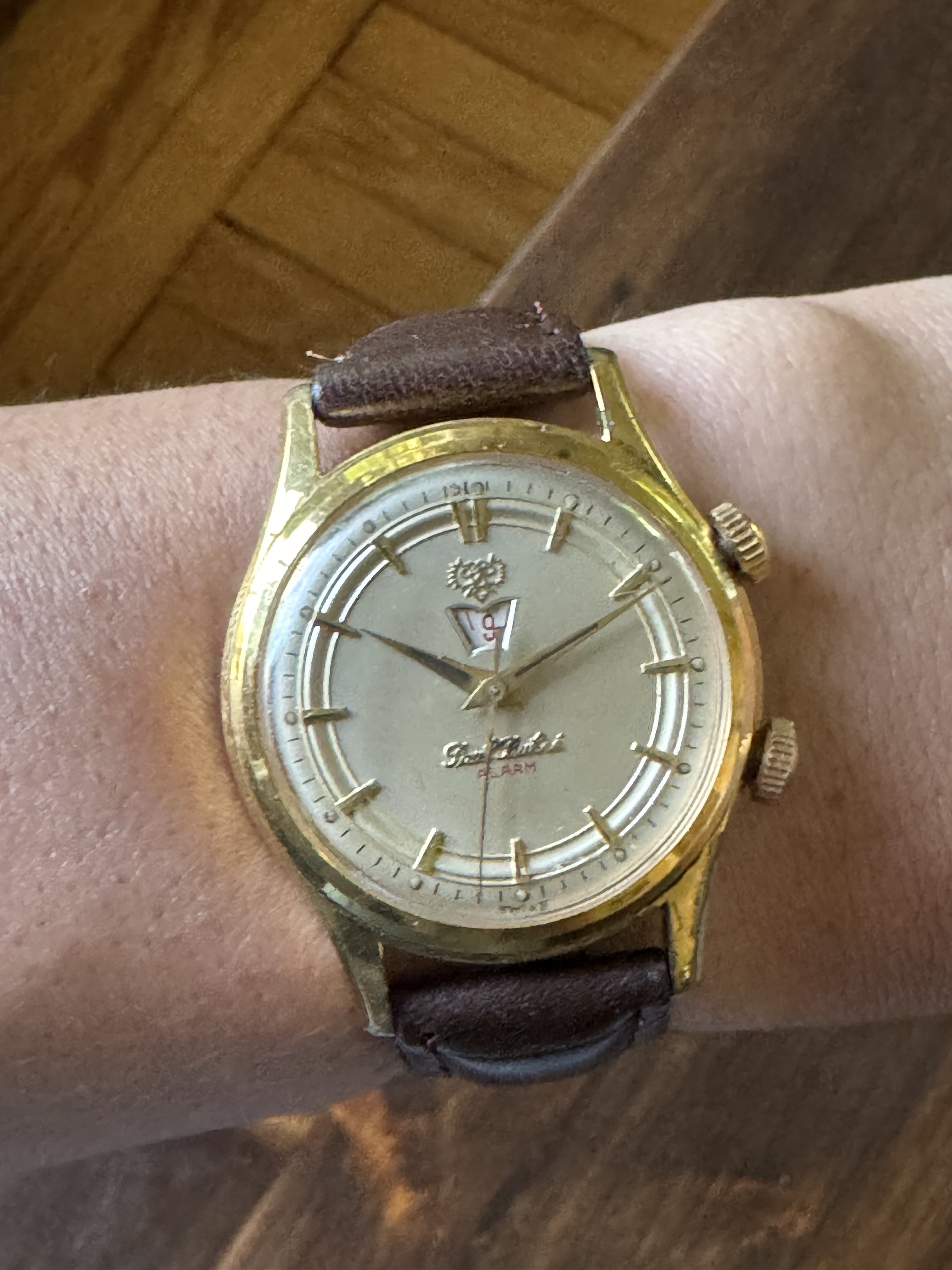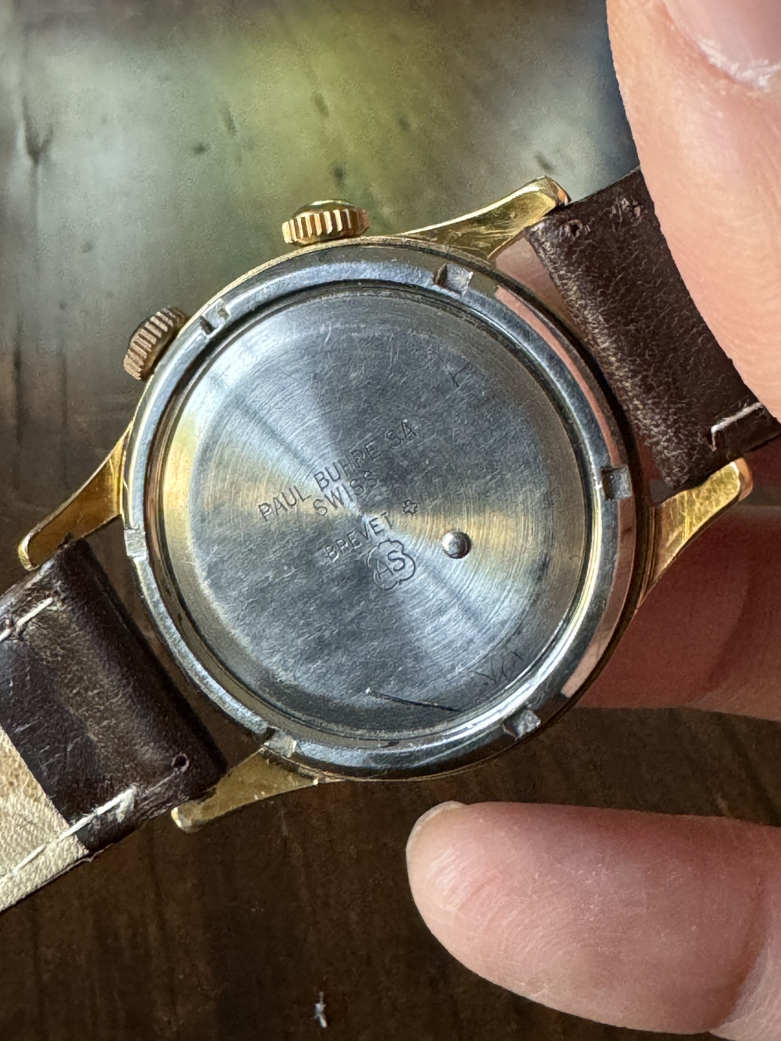 Paul Buhre vintage alarm watch. Gold plated, stainless steel back, nice sharp case. It has an interesting dial with applied markers and an inner ring.