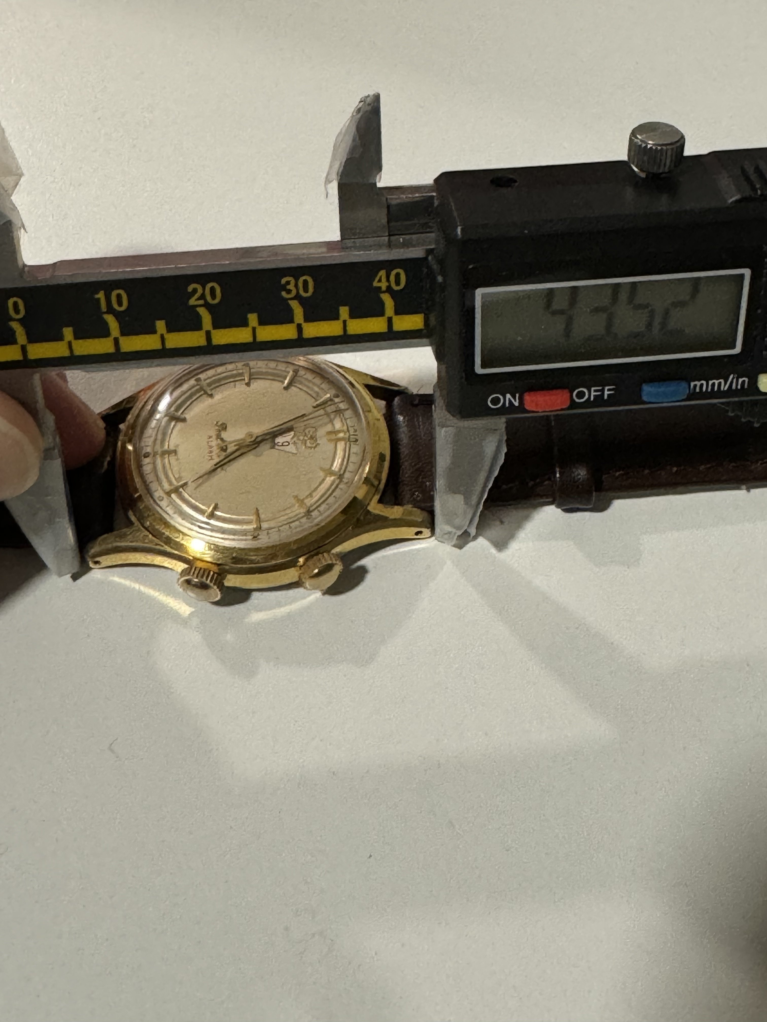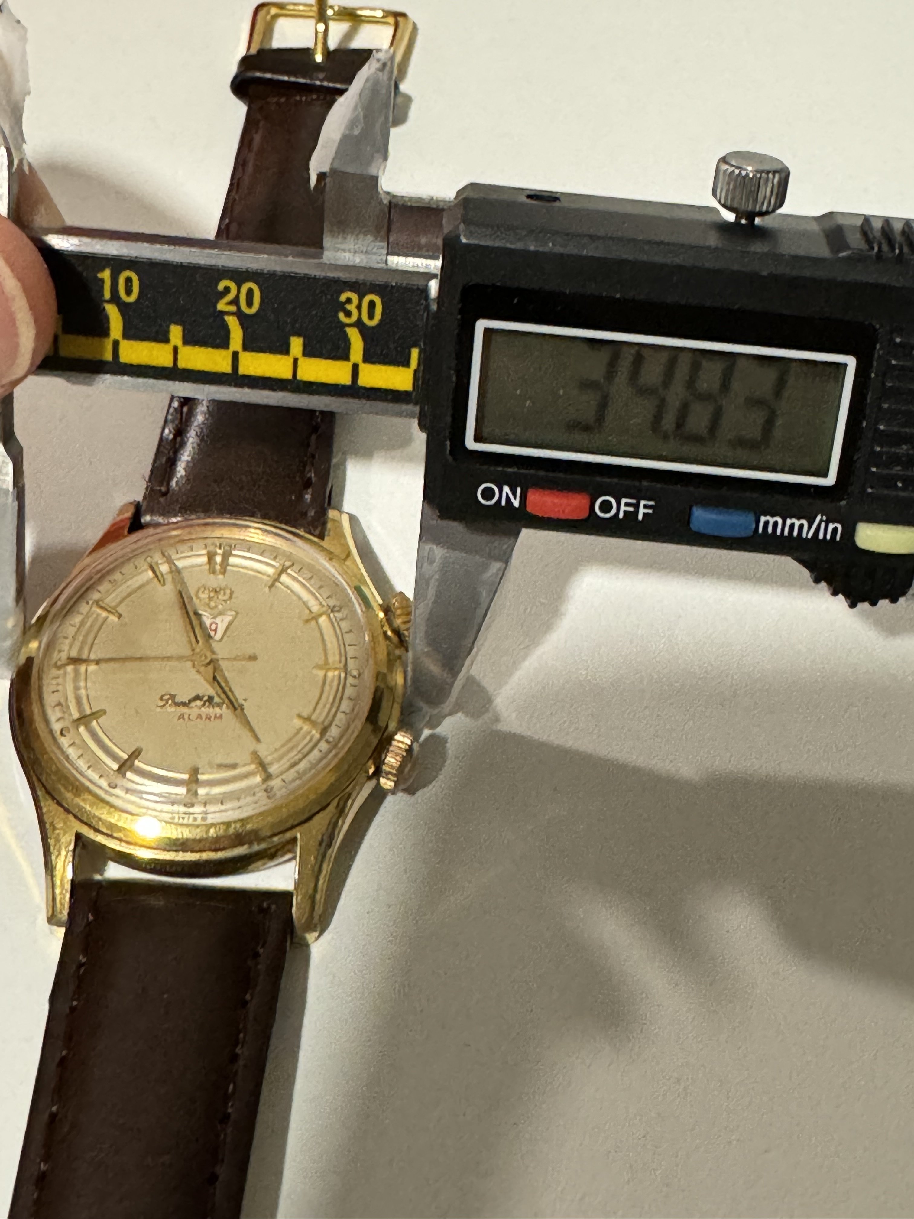 The mechanism seems to be a modified AS1475 type alarm based on the caseback style and the AS marking on caseback. AS1475 was the most widely used third party alarm movement. The modification is that there is a window for the alarm set time at 12 o’clock, which I have not seen elsewhere. Girard Perregaux had a similar modified AS1475 but the window was at 6.