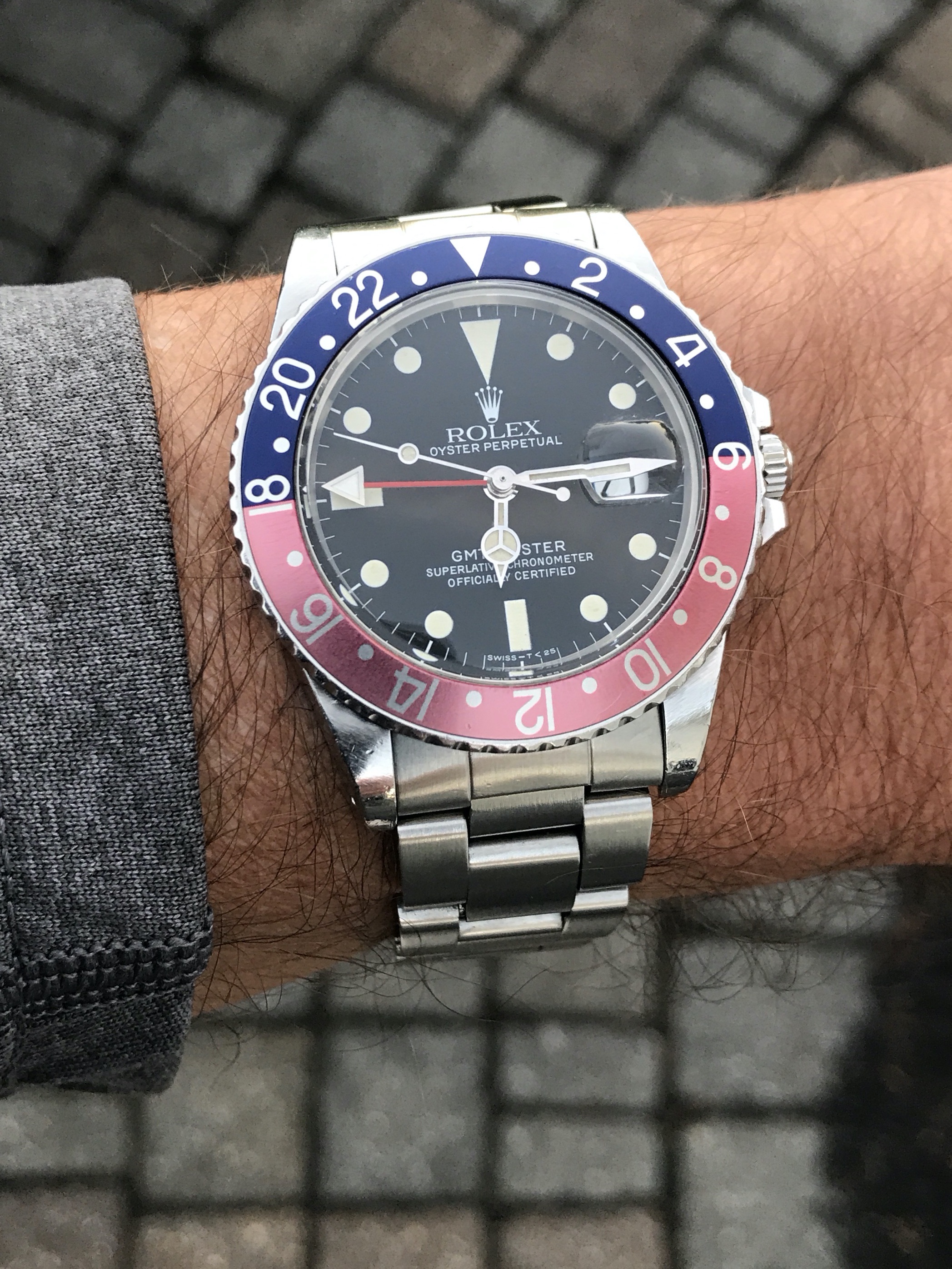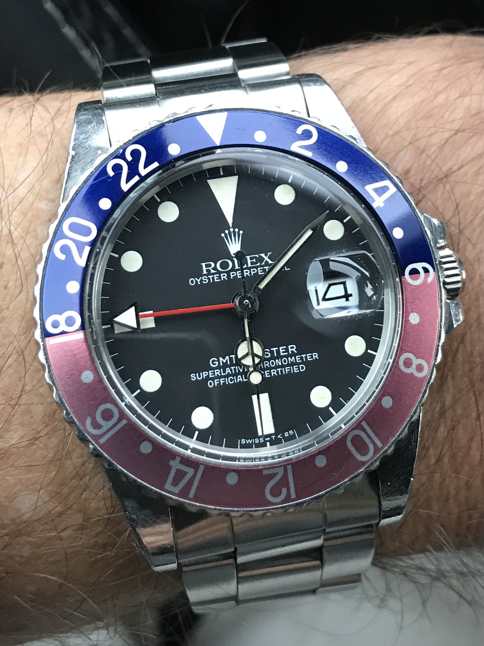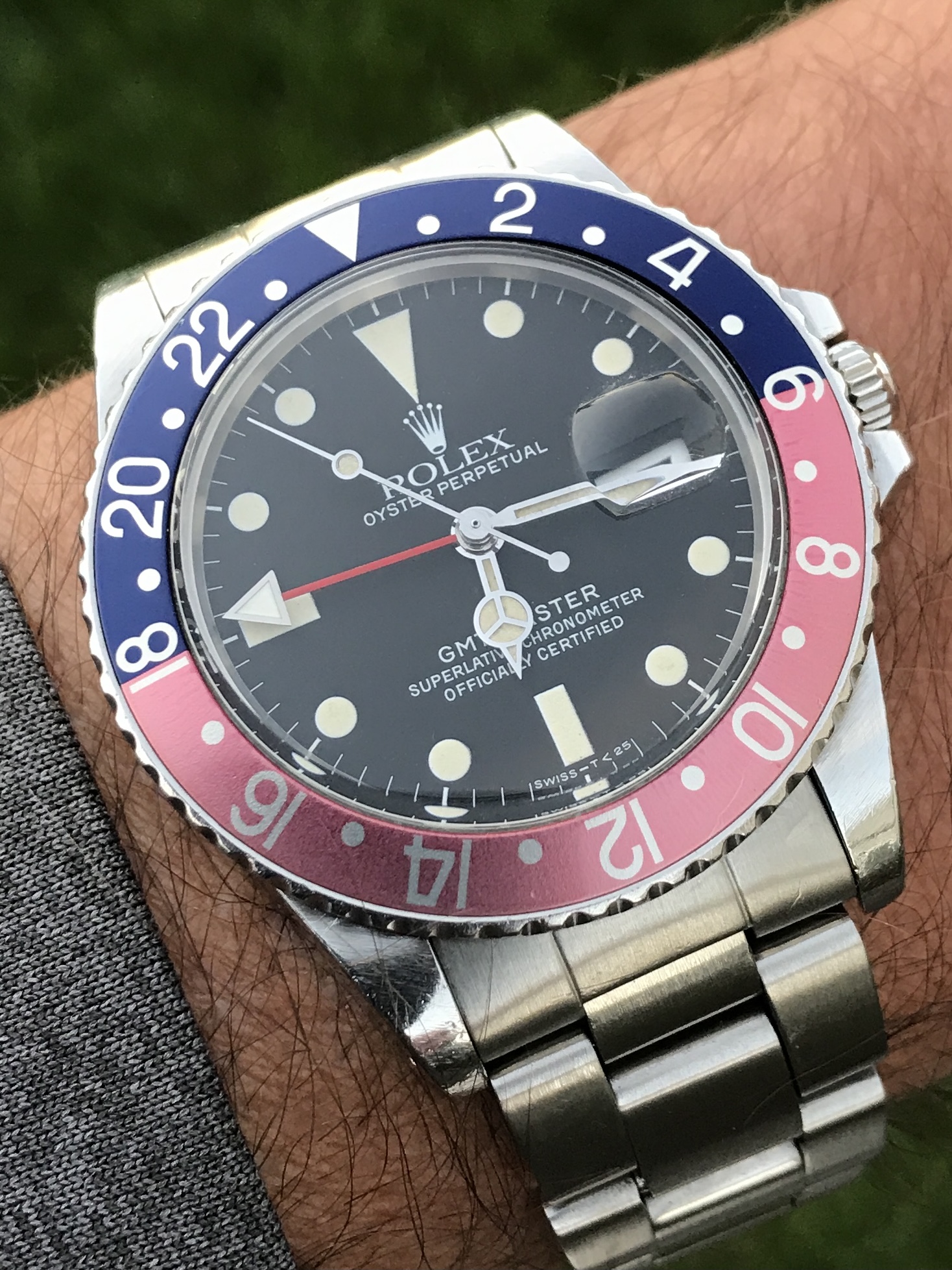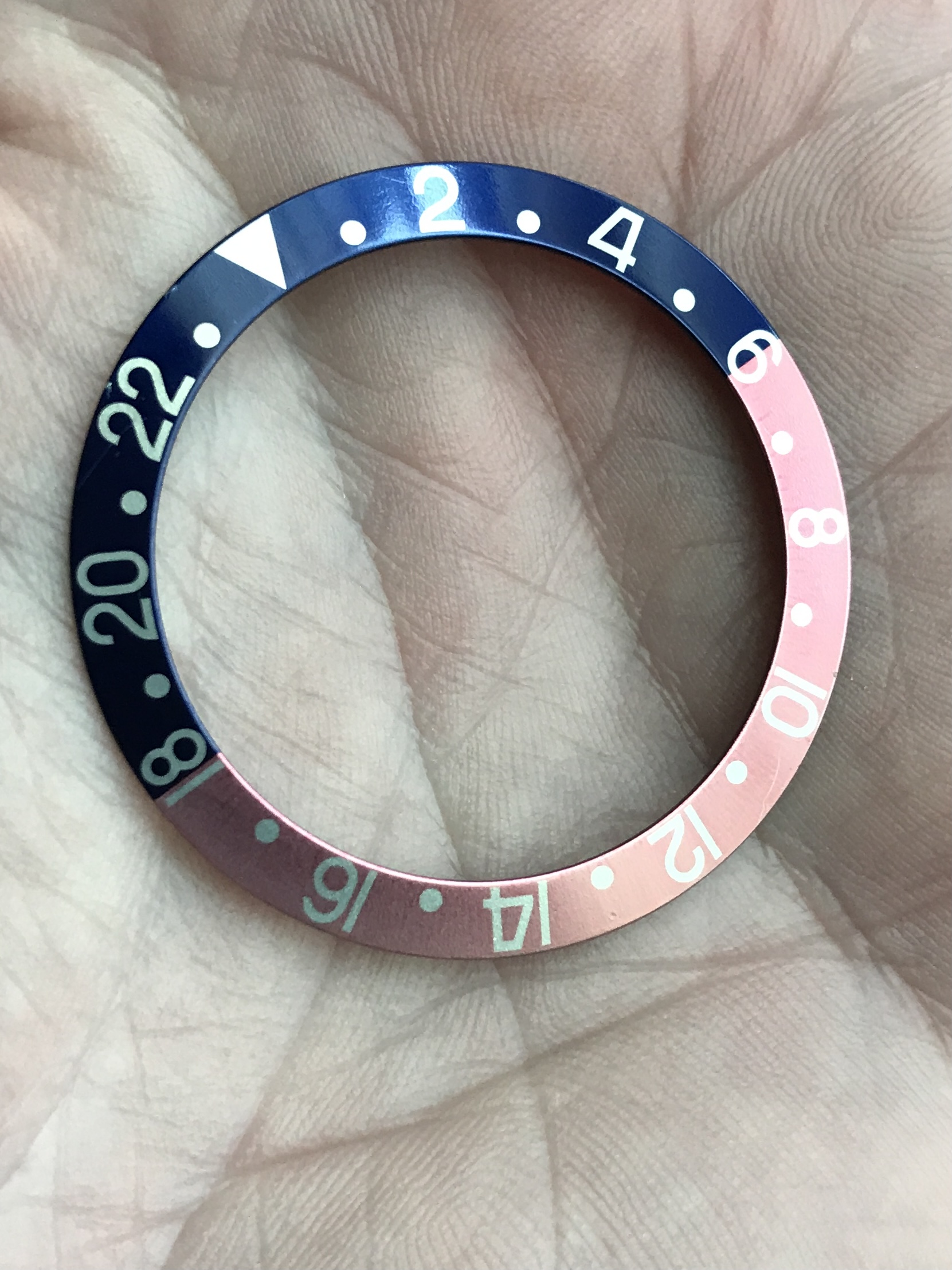 ·Up for sale is this genuine Rolex bezel “Pepsi” insert for a GMT Master 1675 or 16750 with an acrylic crystal. It’s in fantastic condition, with very little sign of wear at all (fits *extremely* tightly into the steel bezel - took my watchmaker some effort to pop it in!). The blue is vibrant and the red has faded to a gorgeous pink as shown in these pictures, which are not color filtered or adjusted in any way. It shows a few very light marks as one would expect for its age, but is really near near mint to the naked eye. The back of the insert is blue. My understanding is that blue is entirely period correct for my 1984 era GMT 16750 shown in the photos (obviously, the watch is NOT included in this sale, and neither is the steel bezel - just the aluminum insert itself). And let’s face it, even if you have an older 1675, it will look ridiculously good on your watch for a fraction of the price of a red back insert in this condition that would easily cost a couple thousand dollars. 😉