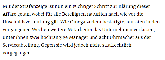 According to the Swiss Newspaper "Neue Zürcher Zeitung" Omega also fired two high level managers and eight (8) watchmakers working in the service department. But these will not be sued by Omega according to NZZ.