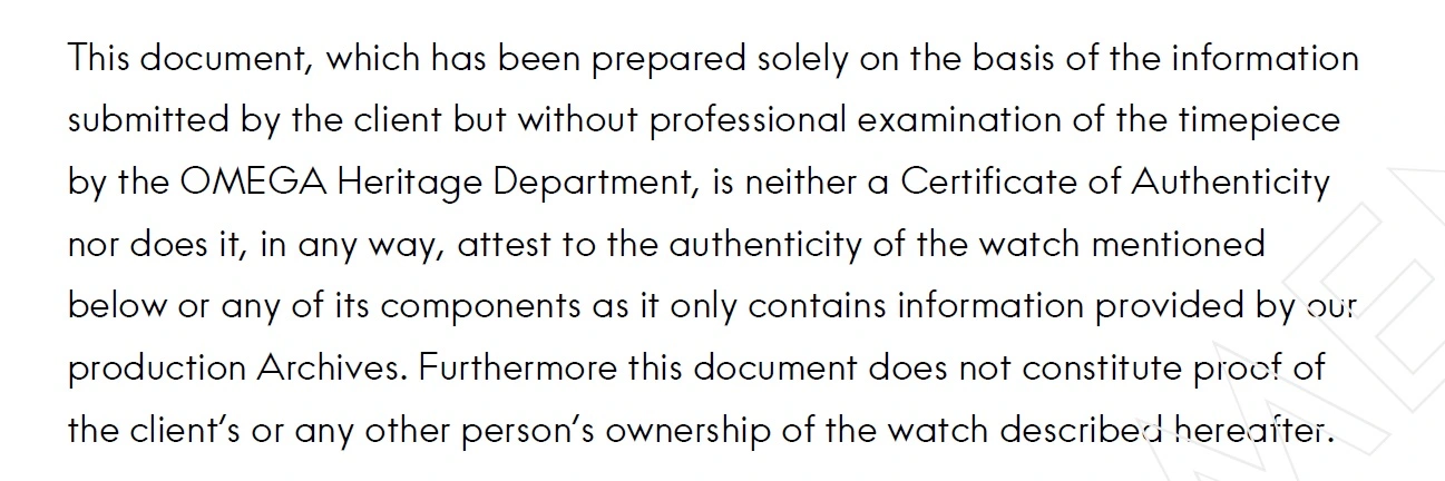 It specifically says this is no guarantee of authenticity. As noted some dealers tricked the gullible into thinking it was something more than it is, but that's not really Omega's fault. They make it quite clear right there on your extract...