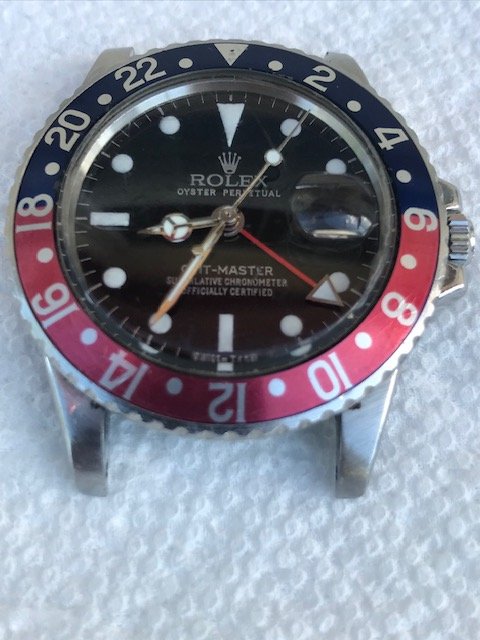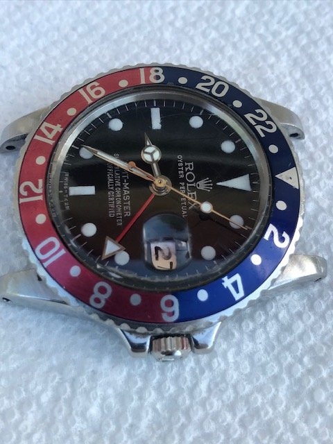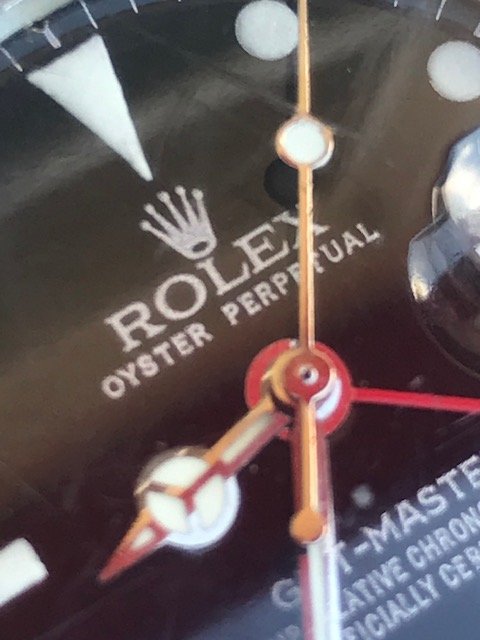 Picked up this sad sack of a non-runner GMT yesterday and though I would post some pics in case anyone here could help out identifying the dial. The watch is a 3.3 serial which should be well past the gilt era but is sporting this glossy dial with unusual silver-ish script. So, it's gotta be either a redial or a wrong dial for the watch. Has anyone ever seen a glossy dial with silver script and no white gold surrounds? I hesitate to call it gilt as I haven't taken the thing apart yet to verify if the script is actually below the dial finish surface. However when angling the watch and examining with a loop the script does not stand proud of the dial surface.