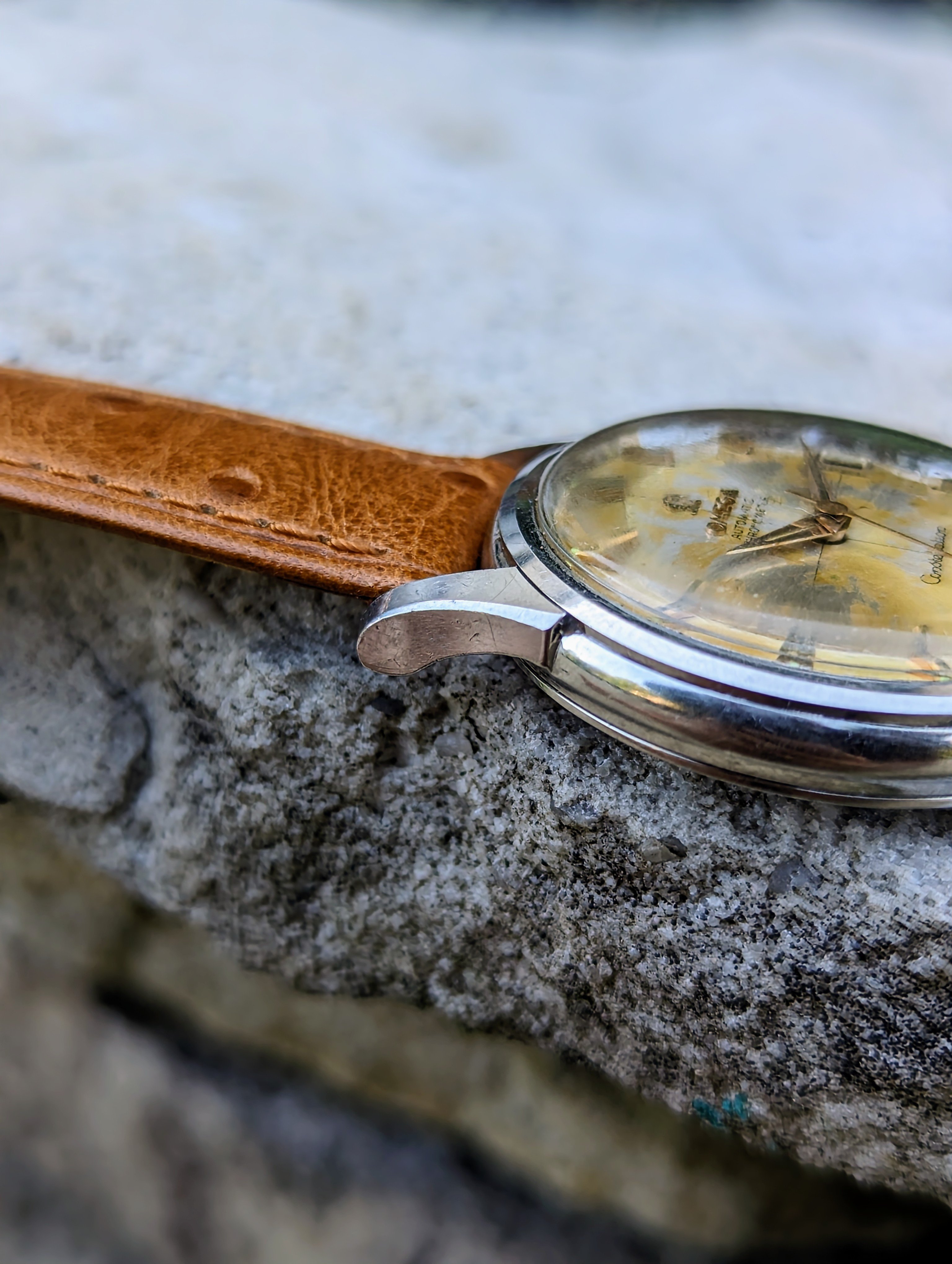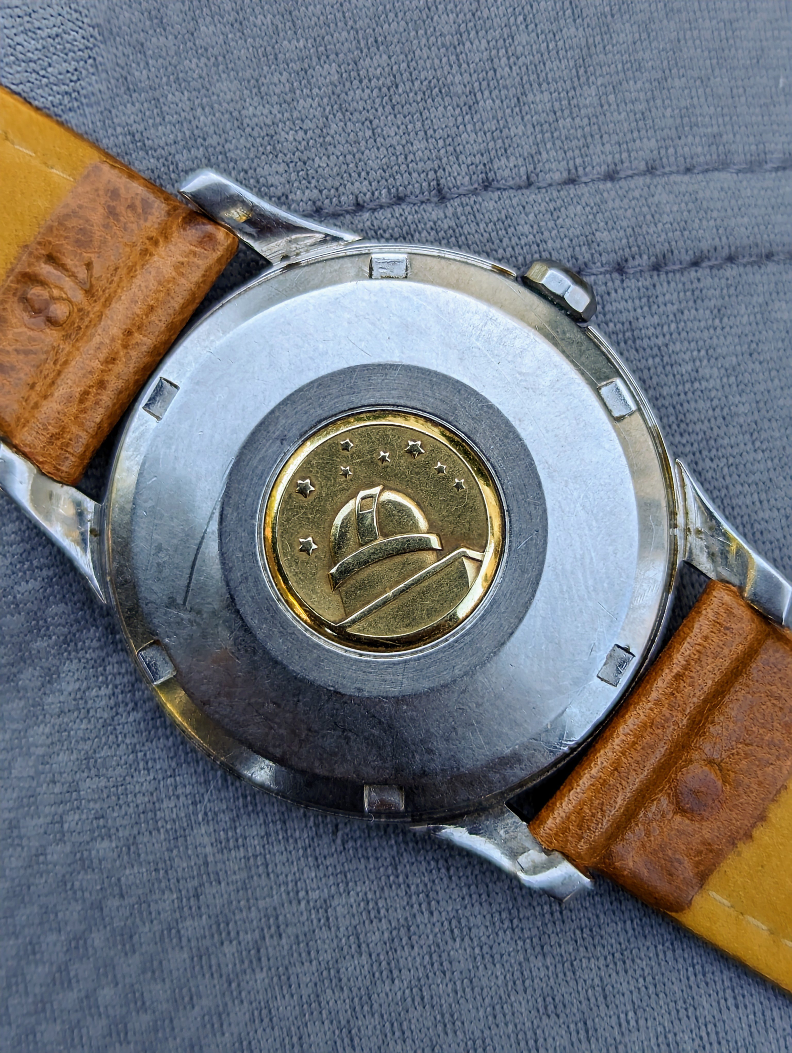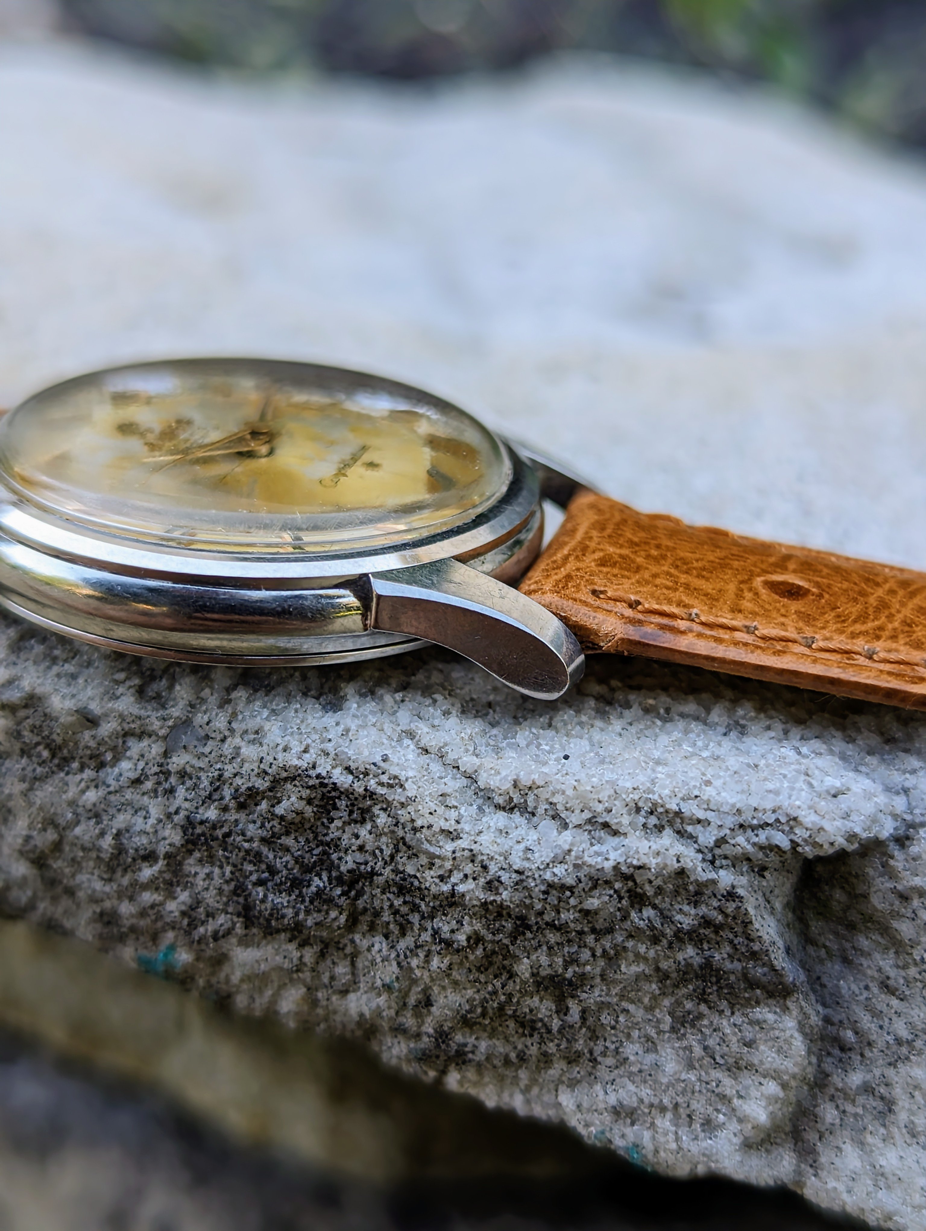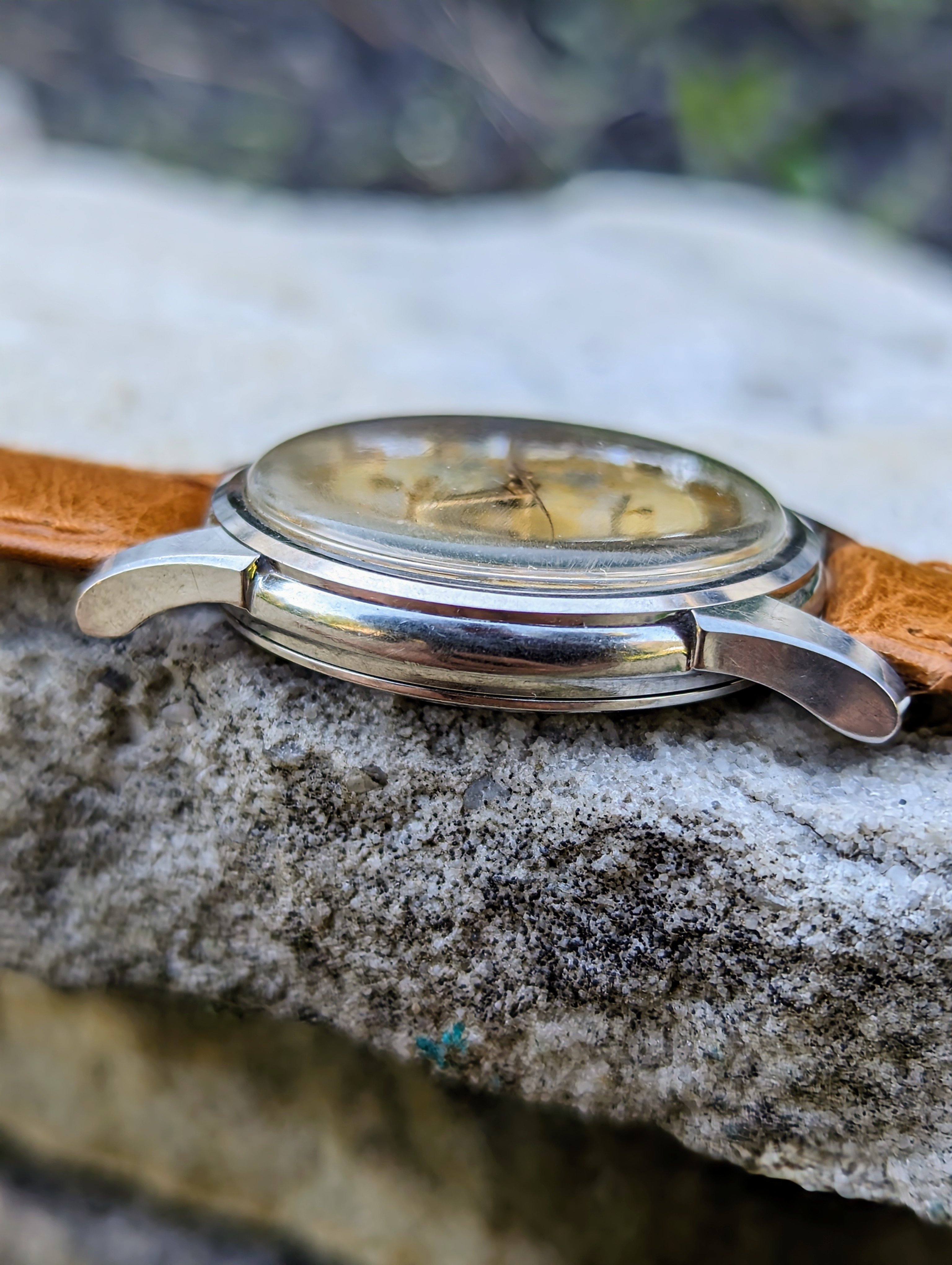 CASE: The 34mm stainless steel case appears to me to be unpolished. The bevel on the bezel is extremely sharp. The bevels on all 4 lugs remain crisp with original factory lines present. The case presents with light wear throughout commensurate with its 61 years of age. The gold observatory medallion is well defined with its original matte background still present. The case is completed by the watches original, thin decagonal crown.
