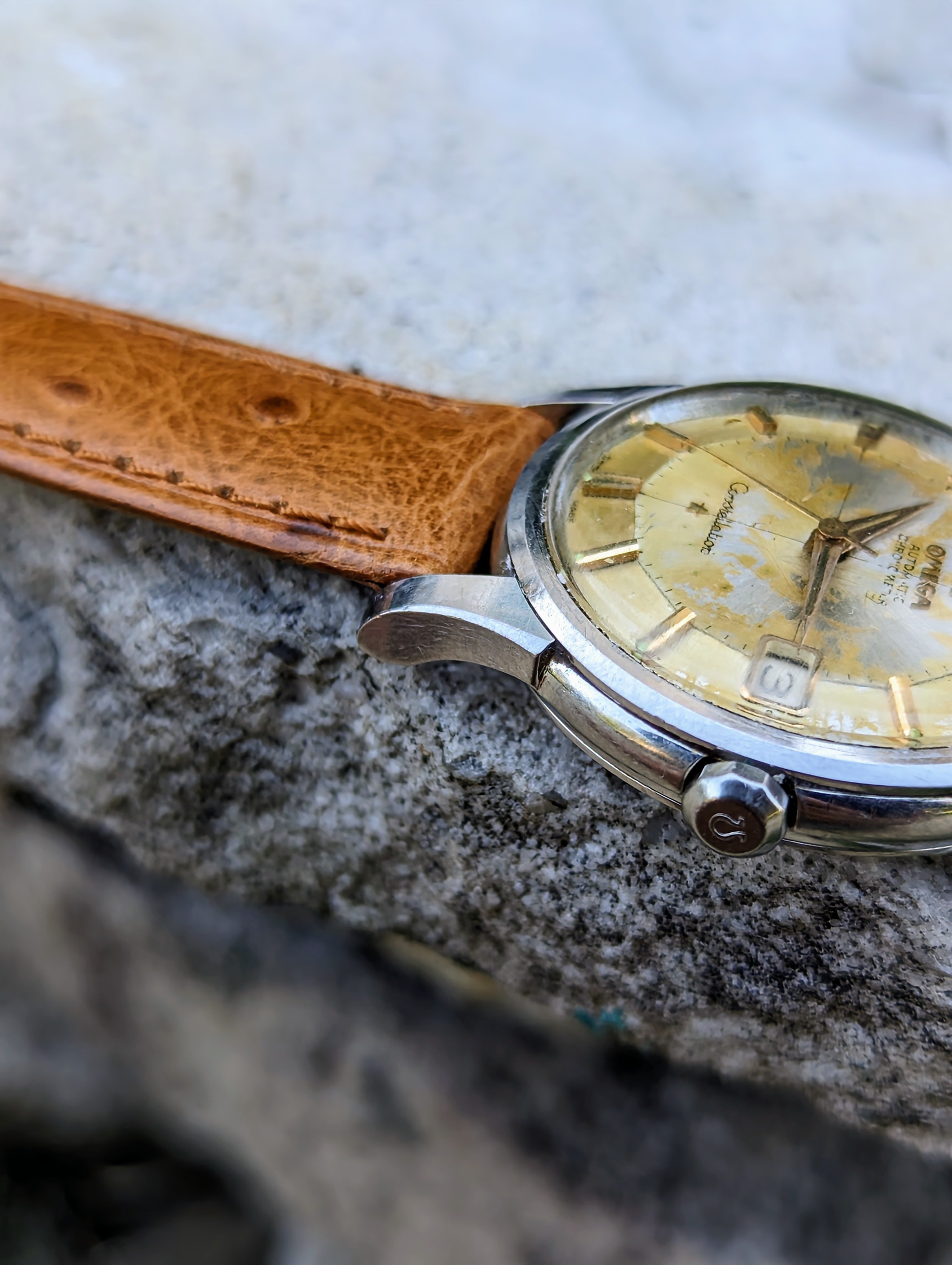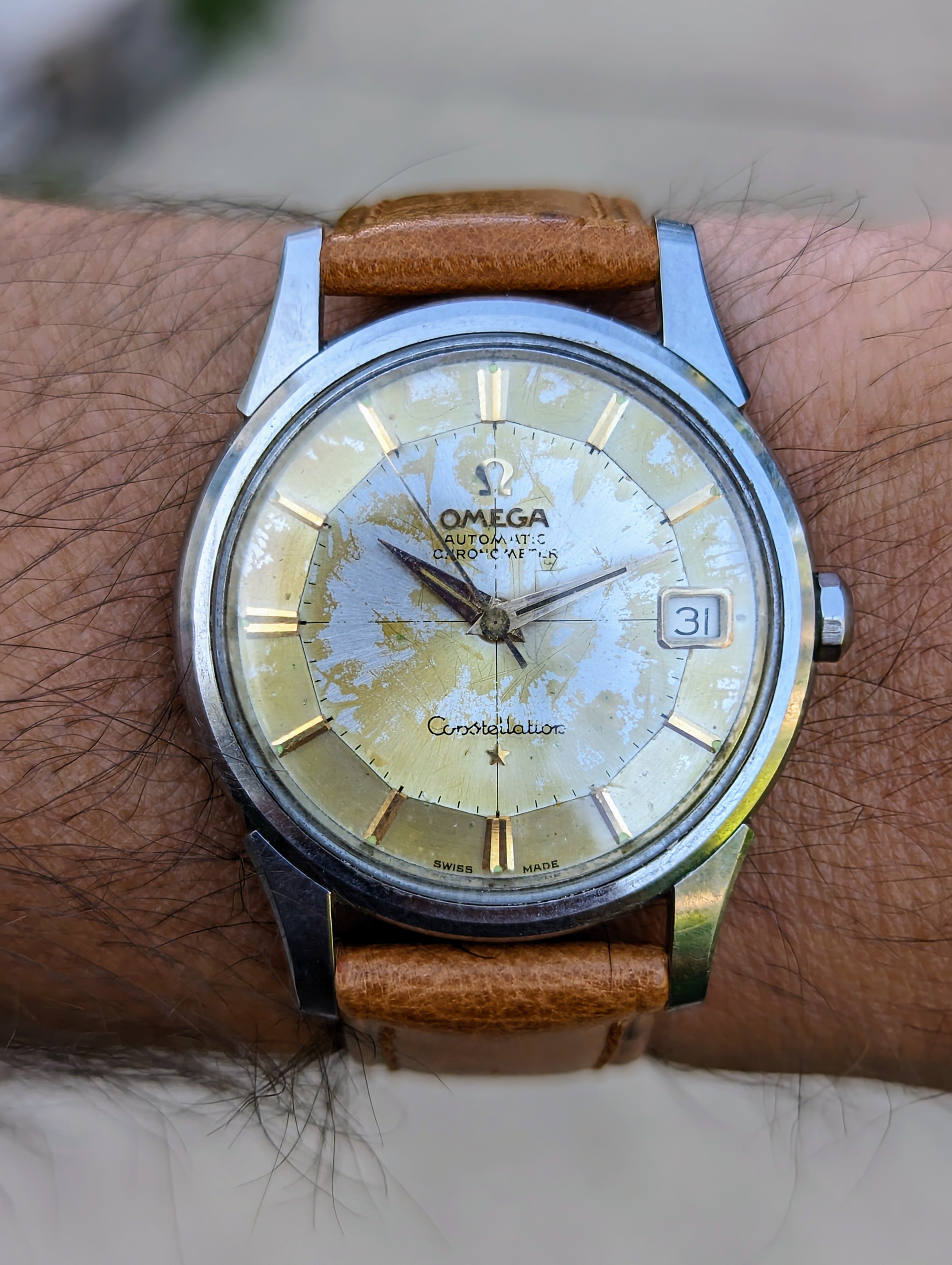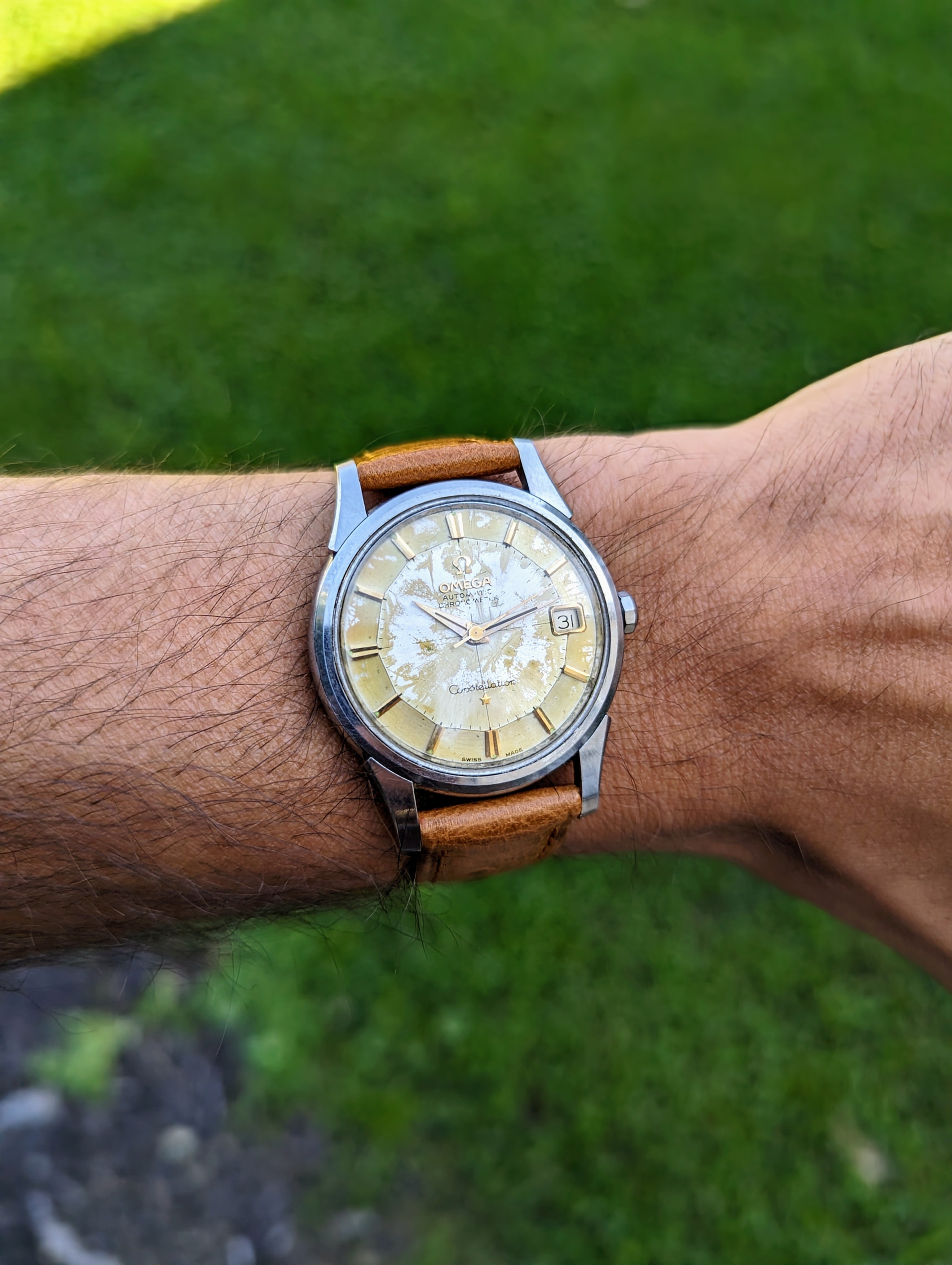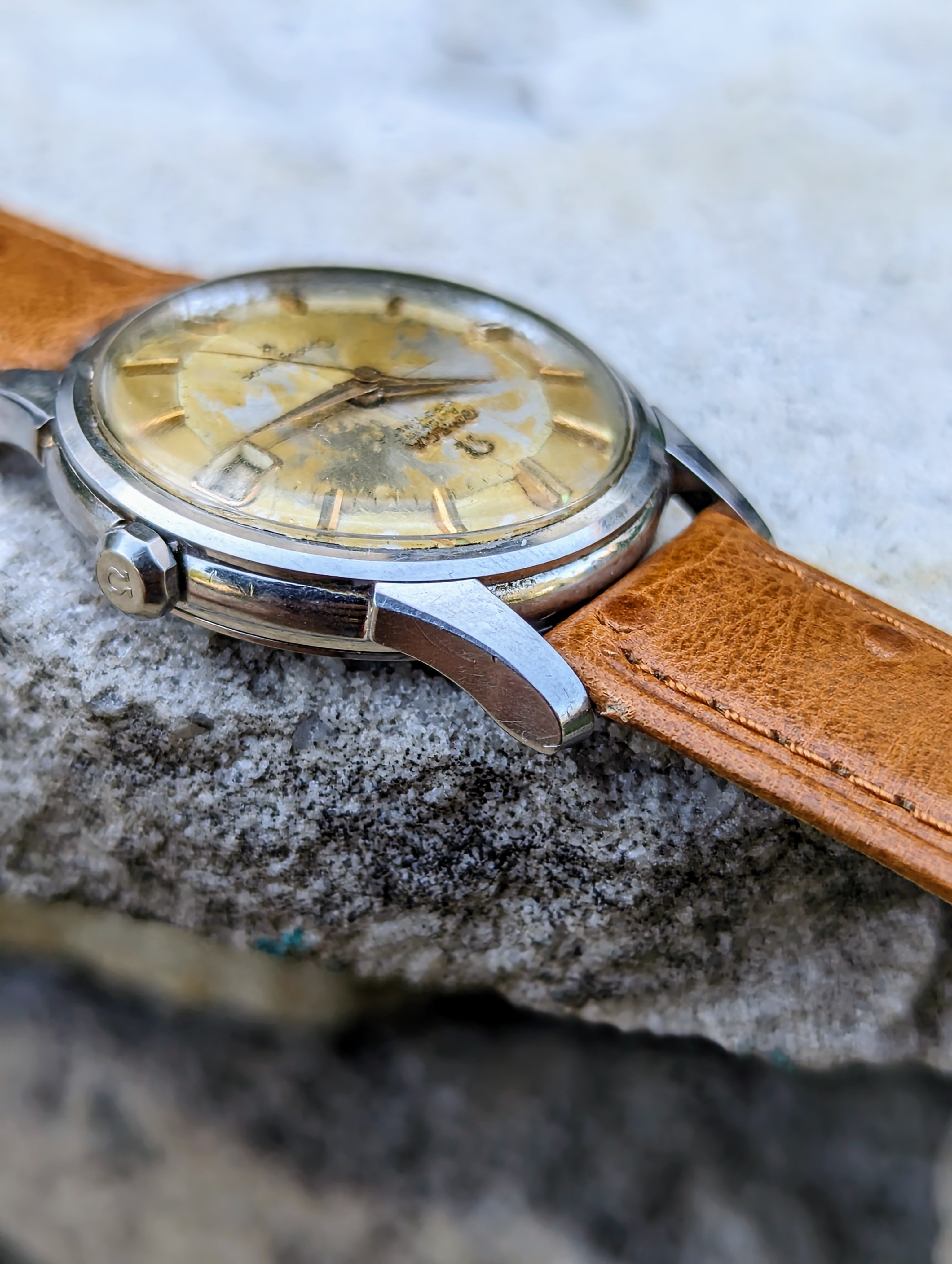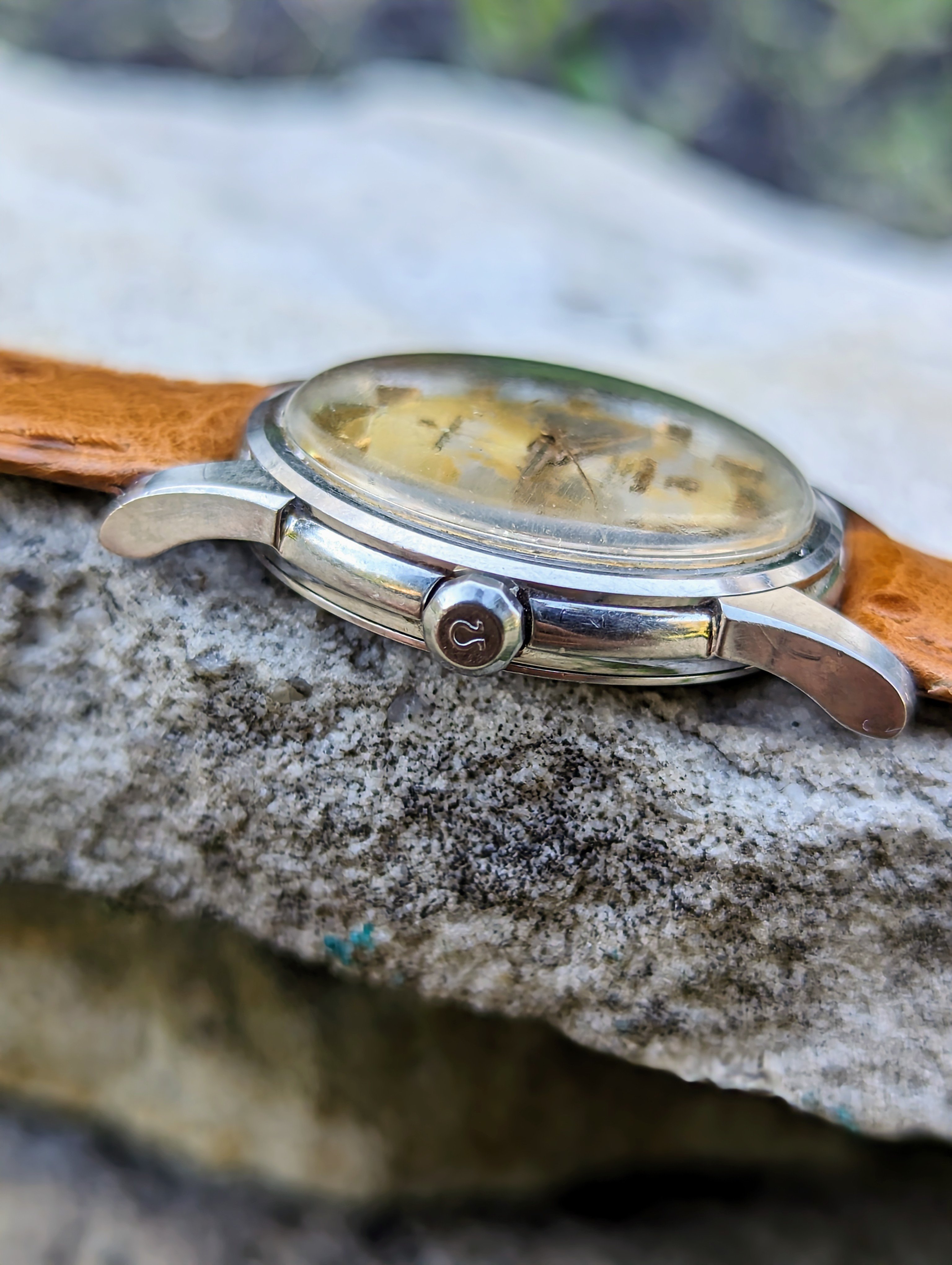 DIAL: An original, Omega, piepan dial. The dial has "patina". It's "tropical". Very "tropical" call it whatever you want lol.