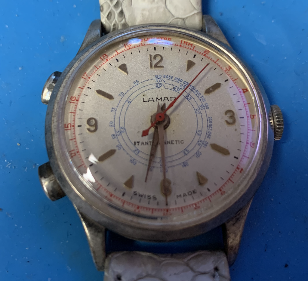 ·This one gets me every time. Has one of the nicer dials. But when you press the button the whole watch stops. Press the other button and it runs.