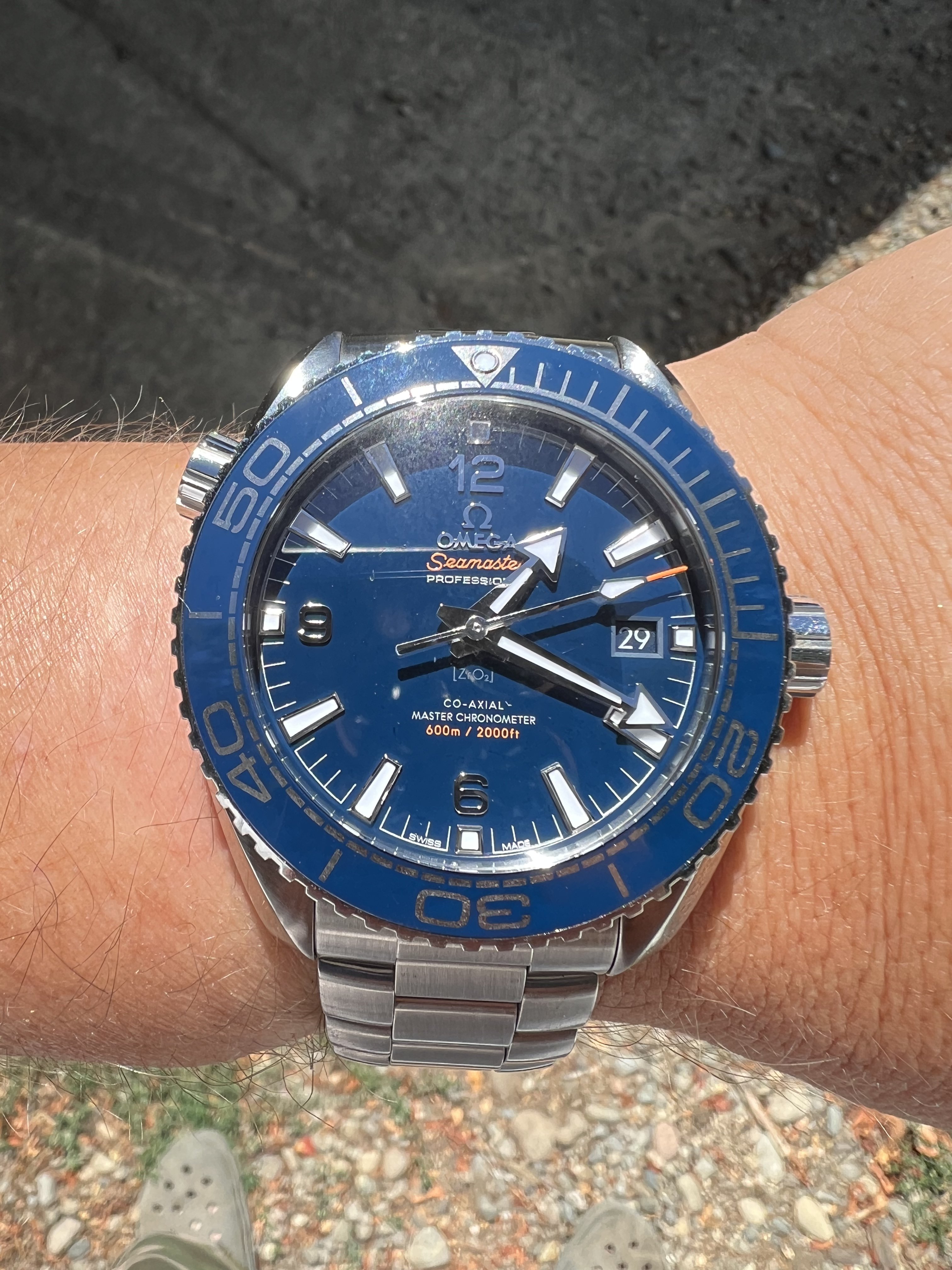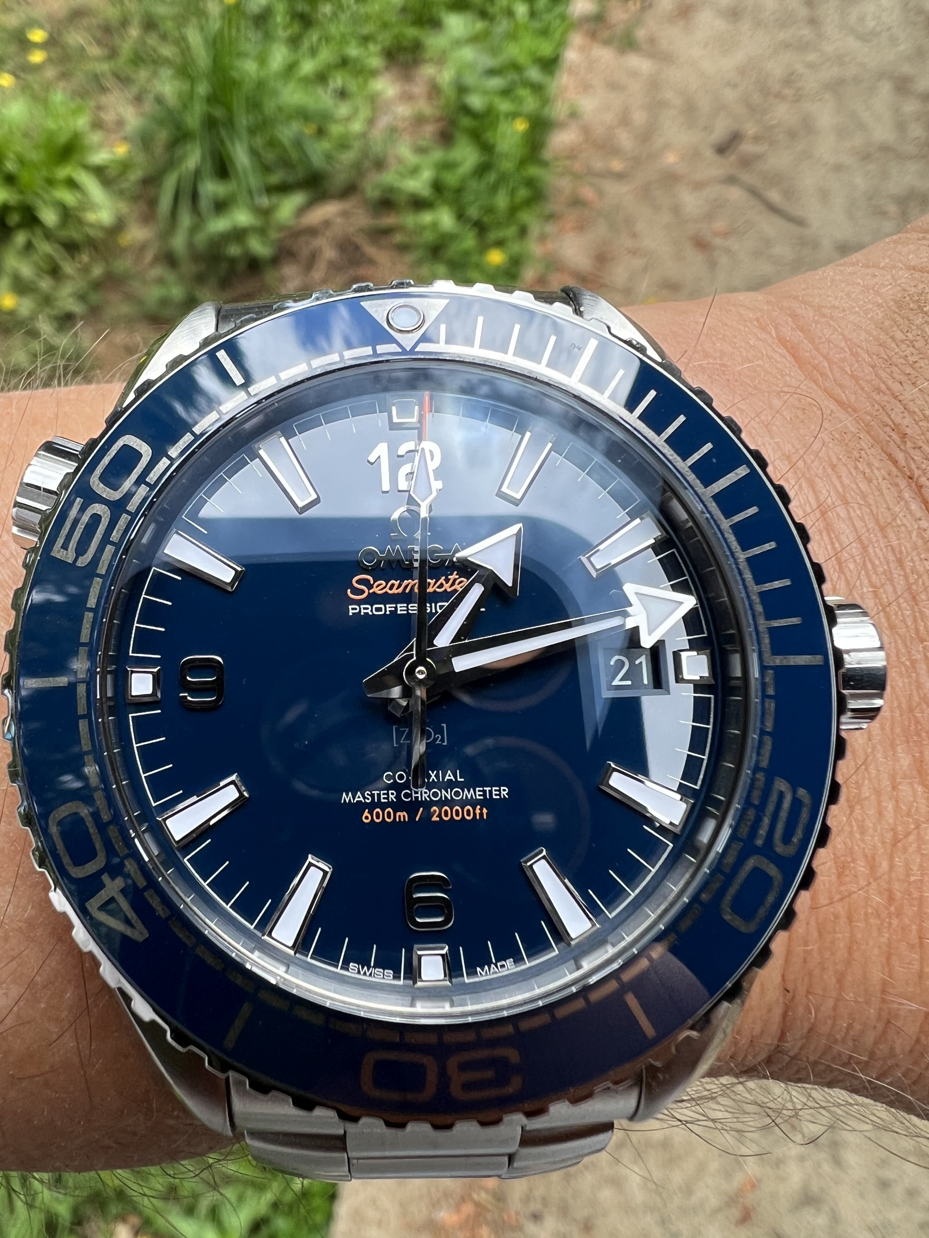 One month ago I bought my first luxury watch: an Omega Planet Ocean 43,5mm in blue, a gorgeous watch, really love it. Before I bought it I was worried because everywhere I read that it is a huge and flashy watch. When I went to the OB and tried it on, I didn麓t find that it was so big, heavy yes but confortable enough. The rest of my family didn麓t know I was buying a new watch (I already have a Tissot PRX in blue) and I decided not to tell them and see how much time it took them to realize I had a new watch. Well, no one saw it, in fact I had to tell my wife after three weeks that I had a new watch and she told me she thought it was my Tissot that I was wearing!!
