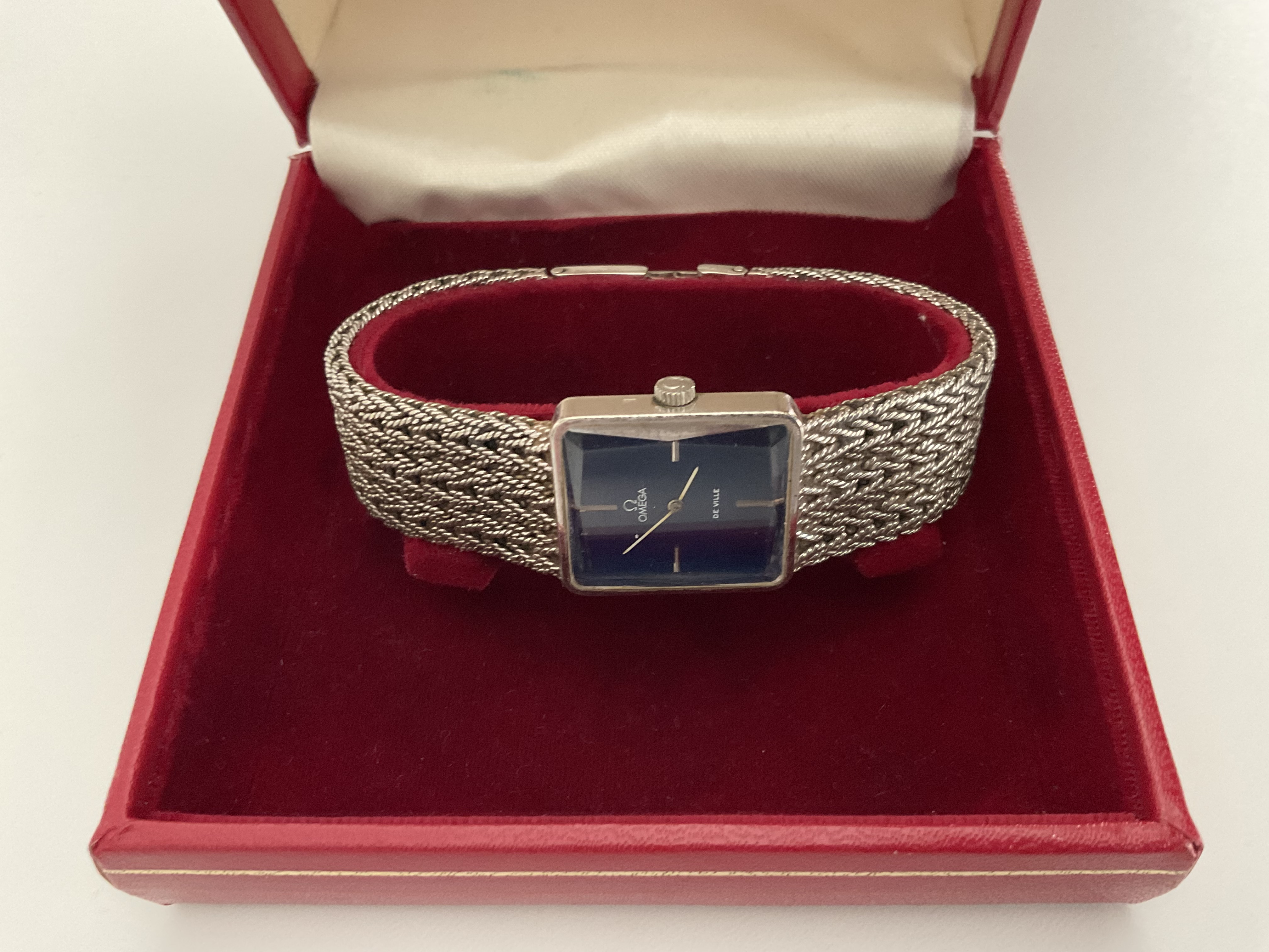 I have a platinum (strap I guess) blue faced ladies De Ville with faceted glass. My Dad bought it for my Mom’s birthday in 1977. I have the original box, instructions and international guarantee which is dated.