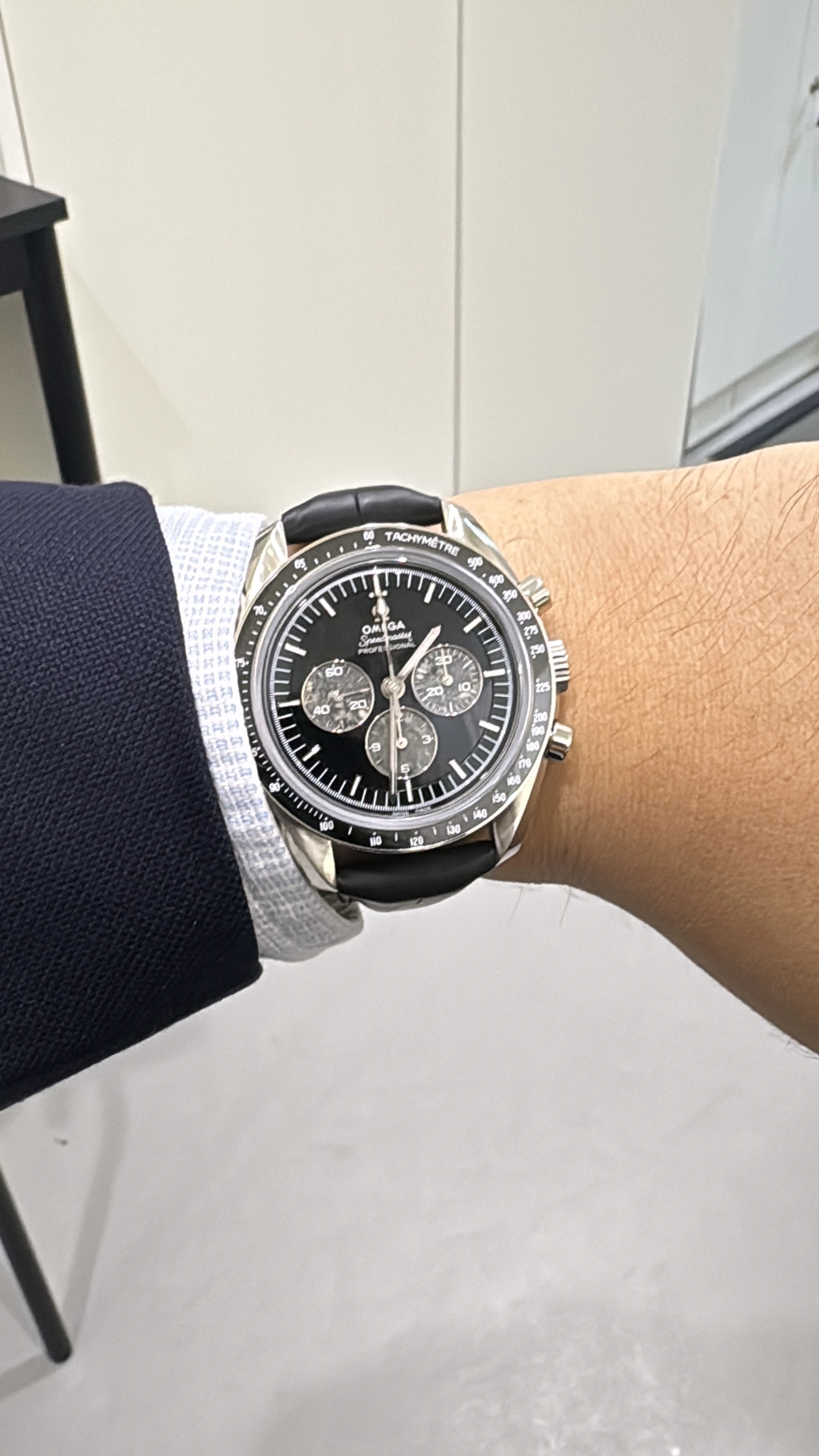 At the time, I had the Omega Speedmaster Calibre 321 Platinum on a leather strap.