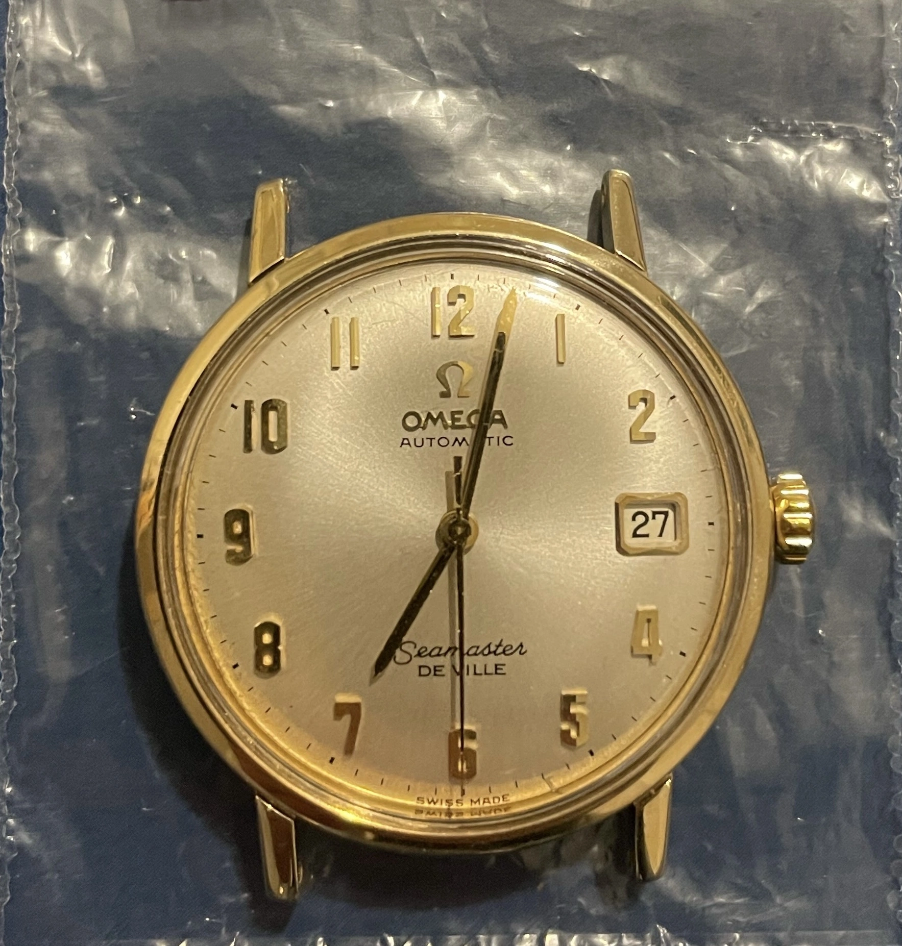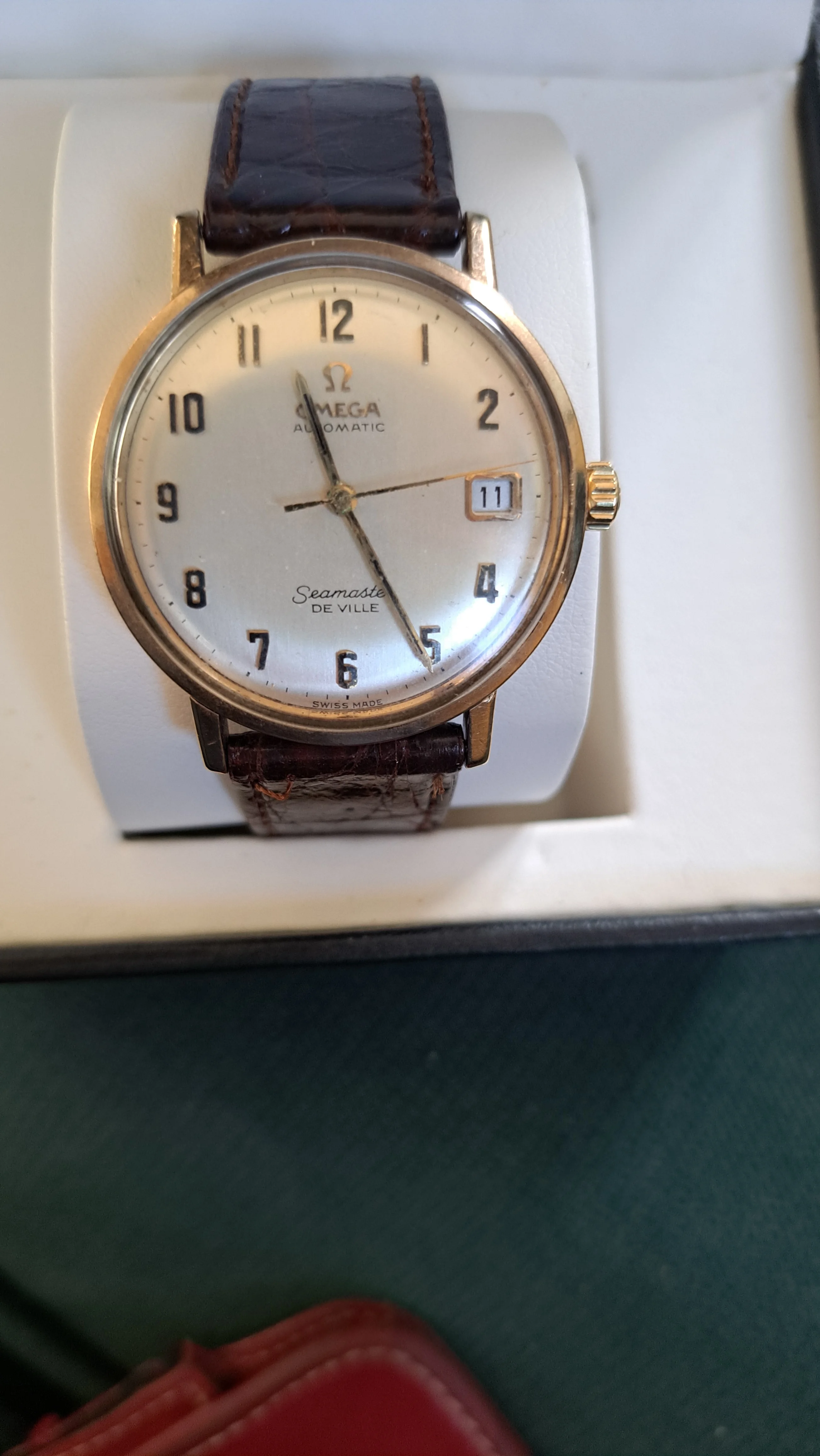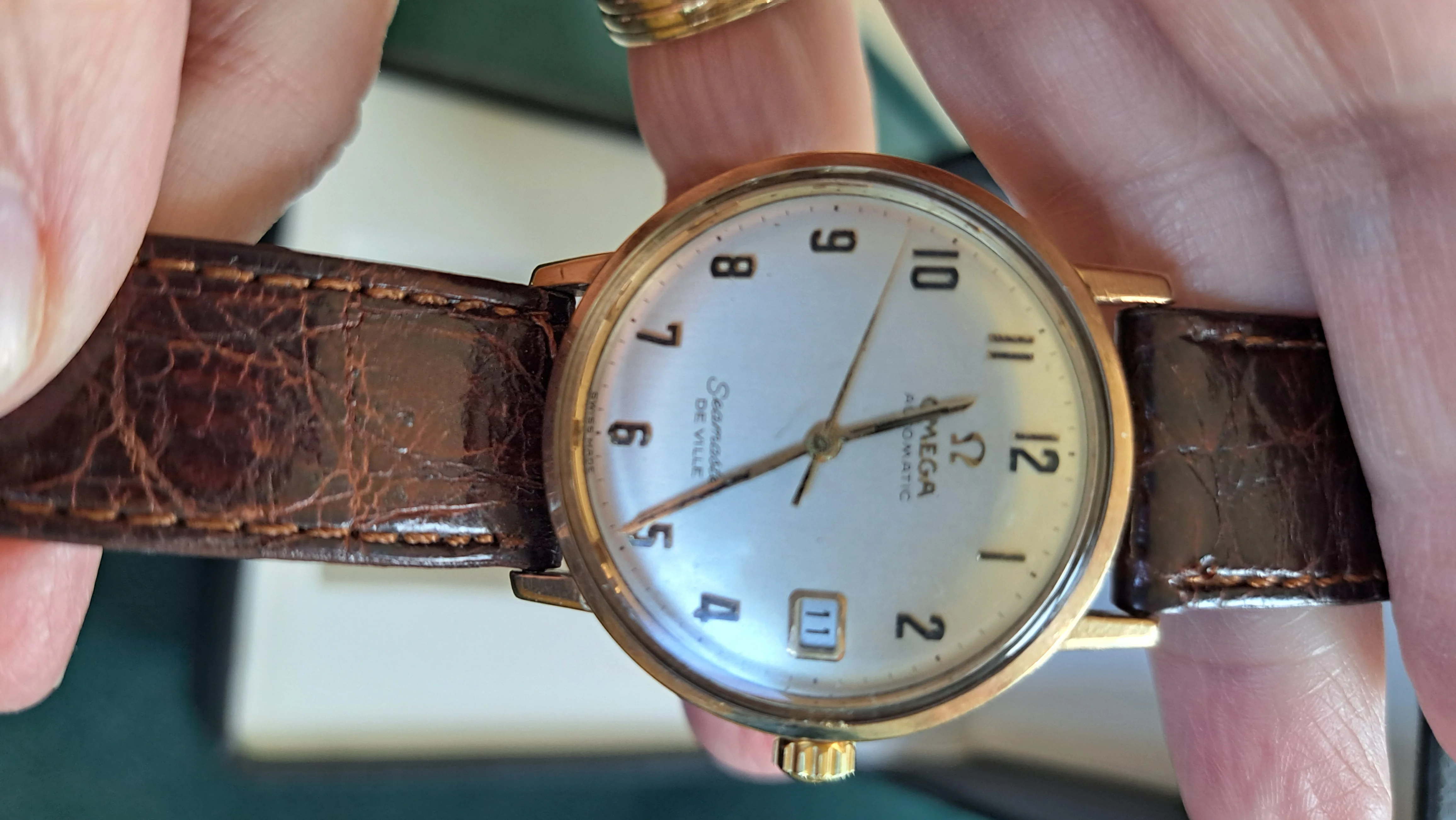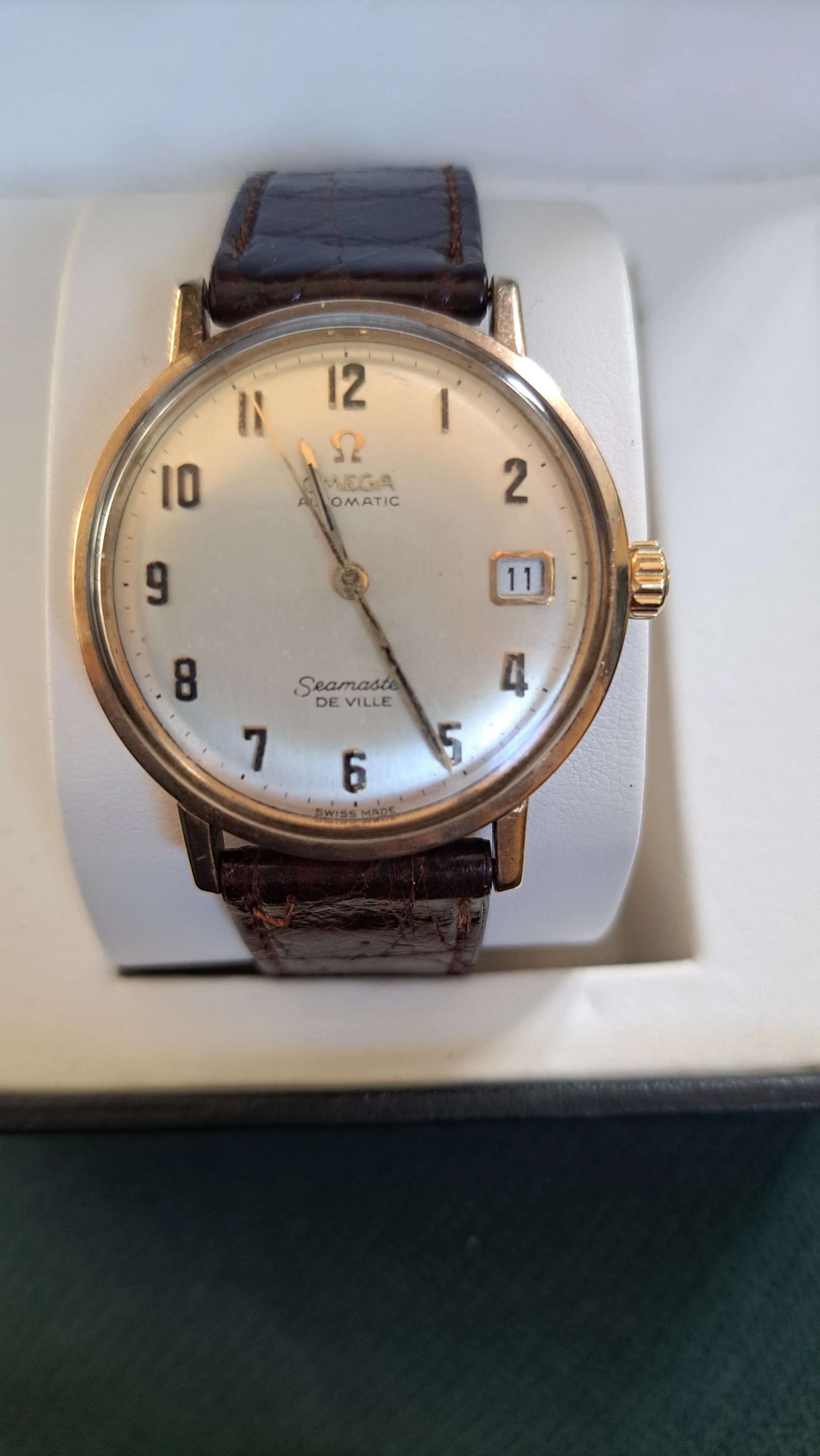 路Hi, I'd really appreciate you giving me some pointers as to whether this looks like a genuine Seamaster DeVille please? It's been left to my husband, but when I've been researching it I've not been able to find a similar one with both the Arabic numerals and the date on the face. I think it may be possibly a 1960's watch but really have no idea so any guidance would be really appreciated- thankyou!