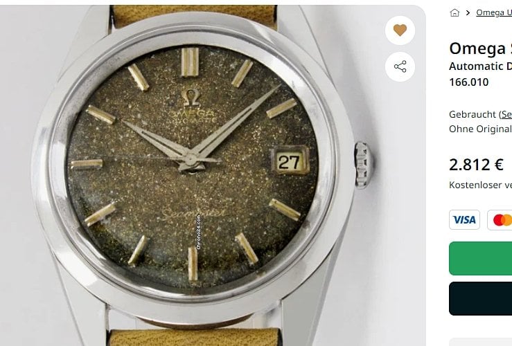 Posts 7,635 Likes 21,906 Syrte ·Mar 9, 2024 Fallout Boy https://www.chrono24.de/omega/omega...33126025.htm?searchHash=7d0eaf57_Q0J3Xv&pos=1 patina-version Even that might be considered damage frankly. And yes the price is ridiculous, as often the case on Chrono24.