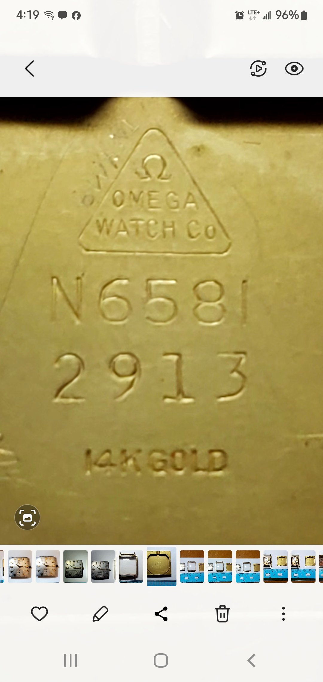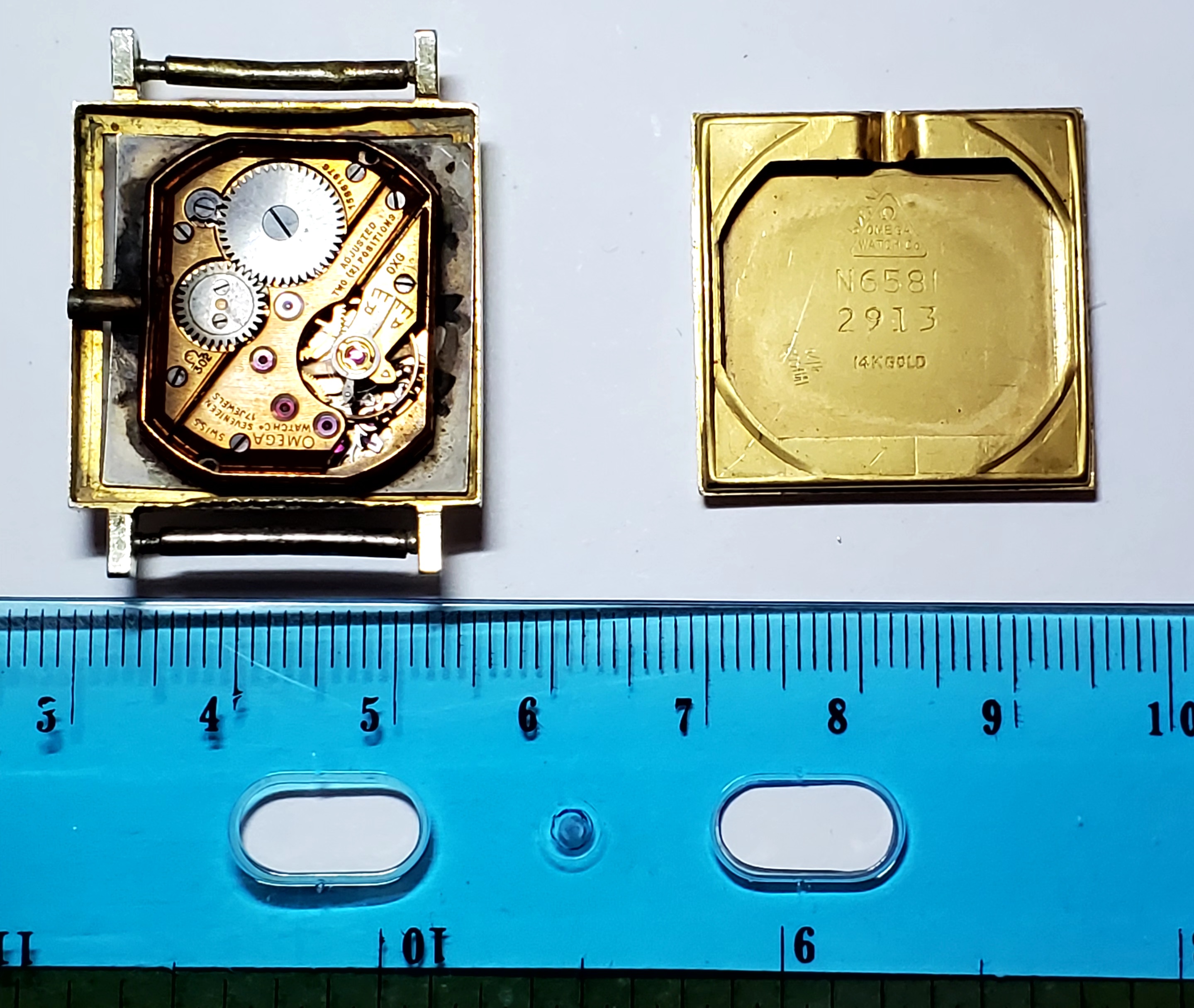 Nationally cased rectangular gents Omega watch in 14k case with cal 302 hand-winding movement from ca. 1957. Without photos of the dial, we can't say much about condition.