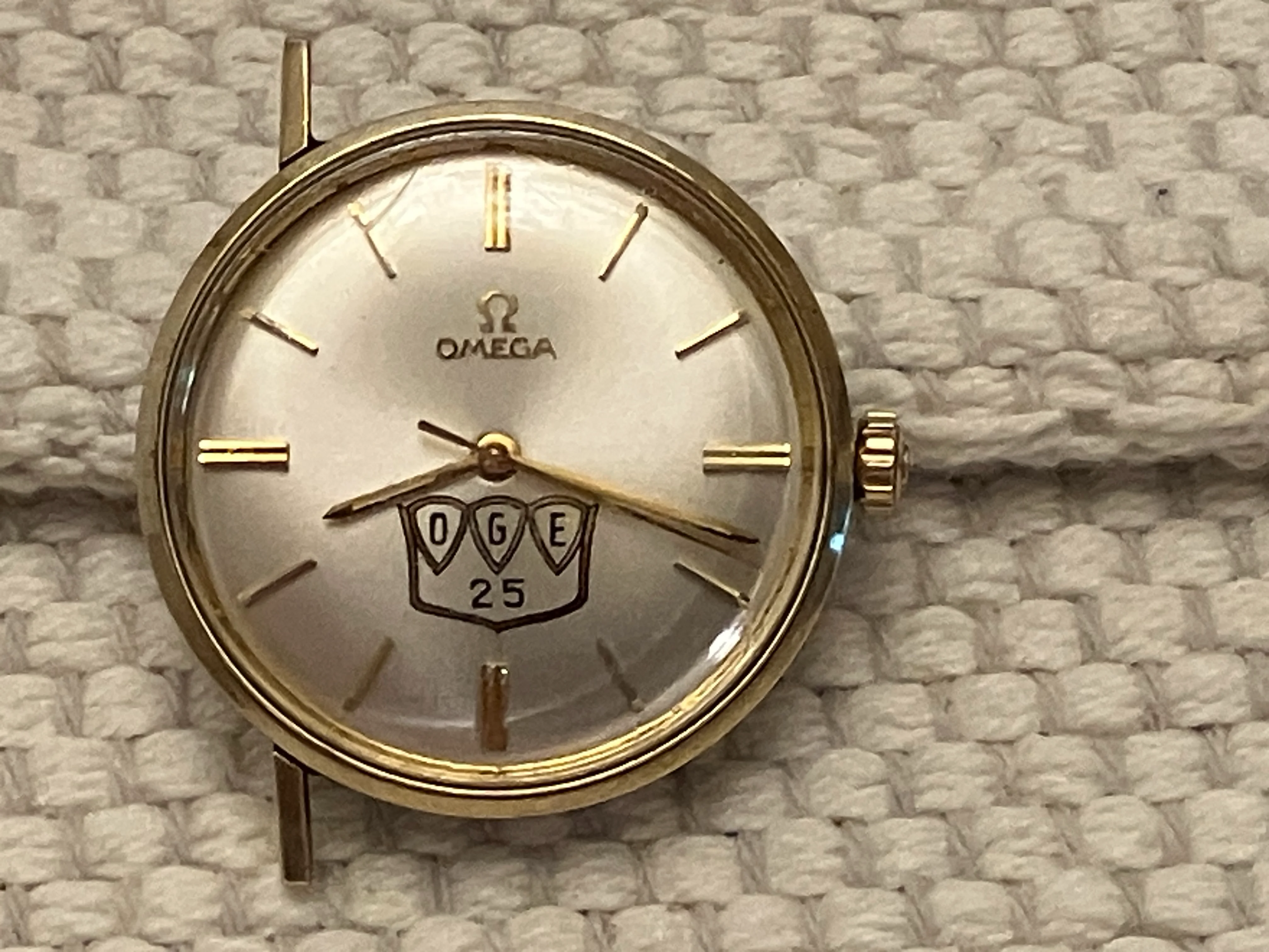 ·Hi - thanks in advance for your help. Picked up this Omega watch from a Goodwill bin store (in a bag with a couple of other watches) and not sure what I have. I hope the pictures will help you identify it. It appears to be an anniversary/service watch with a company logo "OGE" and "25" on the dial and the employee's name "C. Ray Hoover 1970" engraved on the back. It has two broken lugs, crystal has some scratches, and the movement works/keeps time.