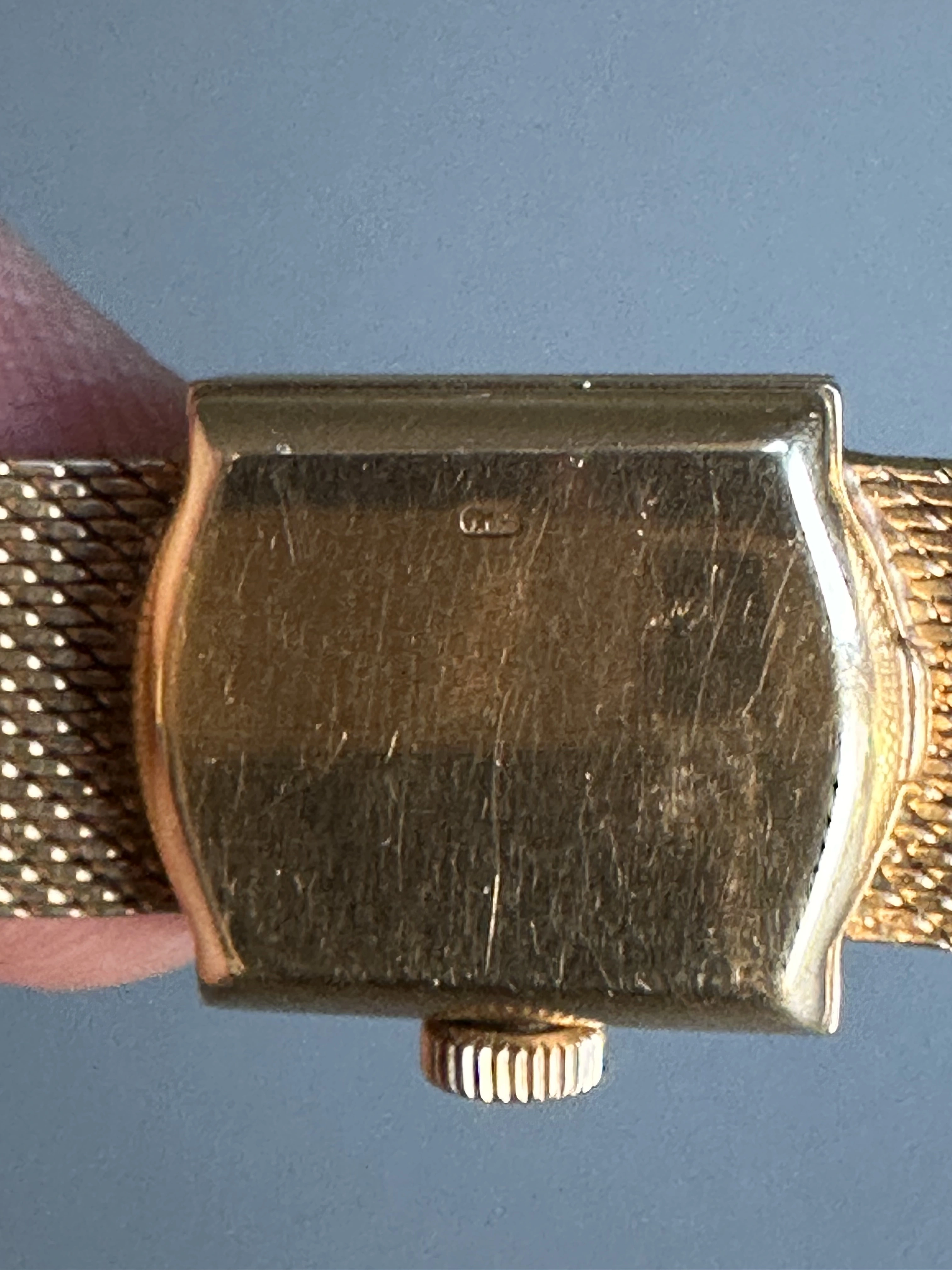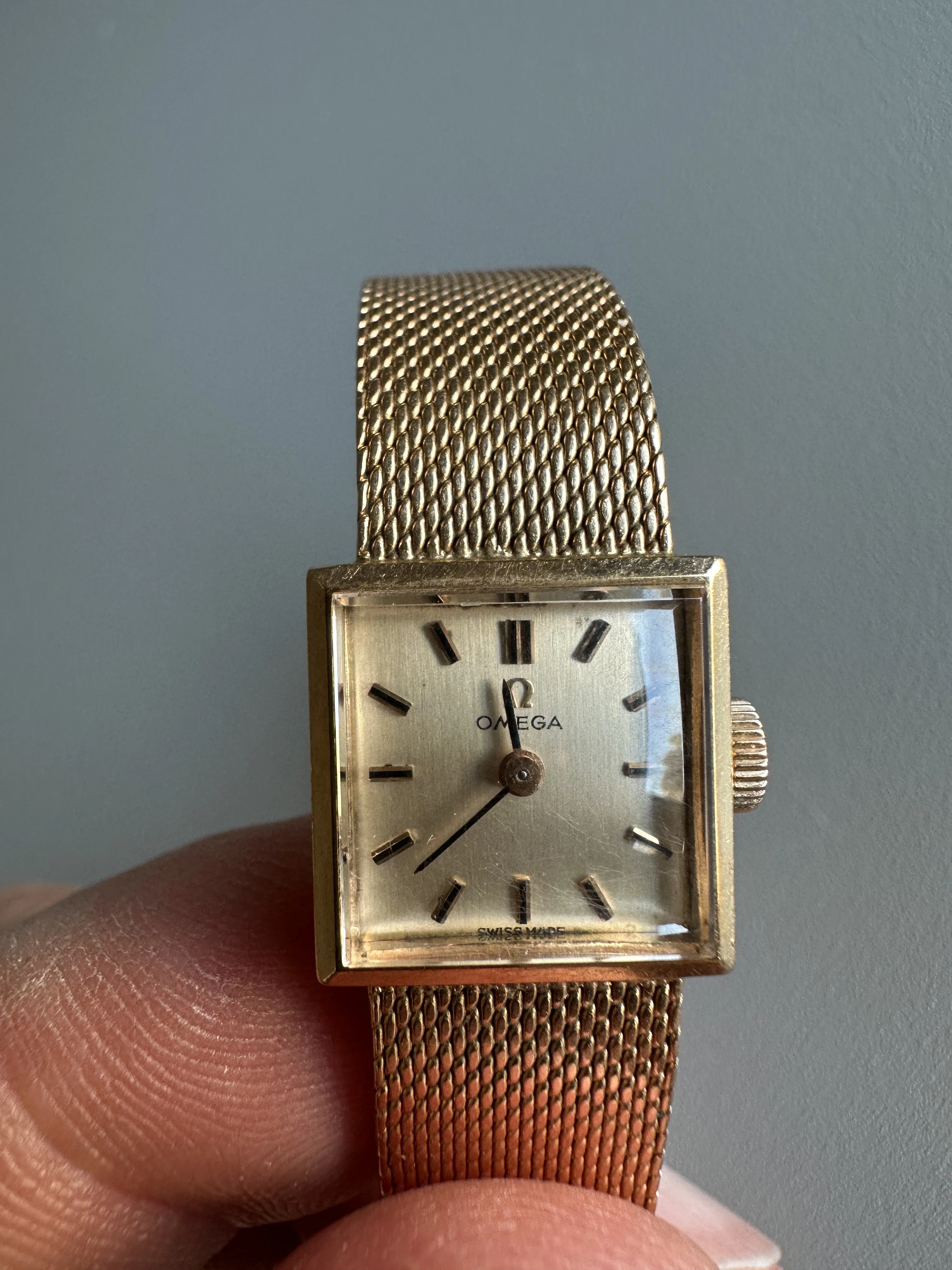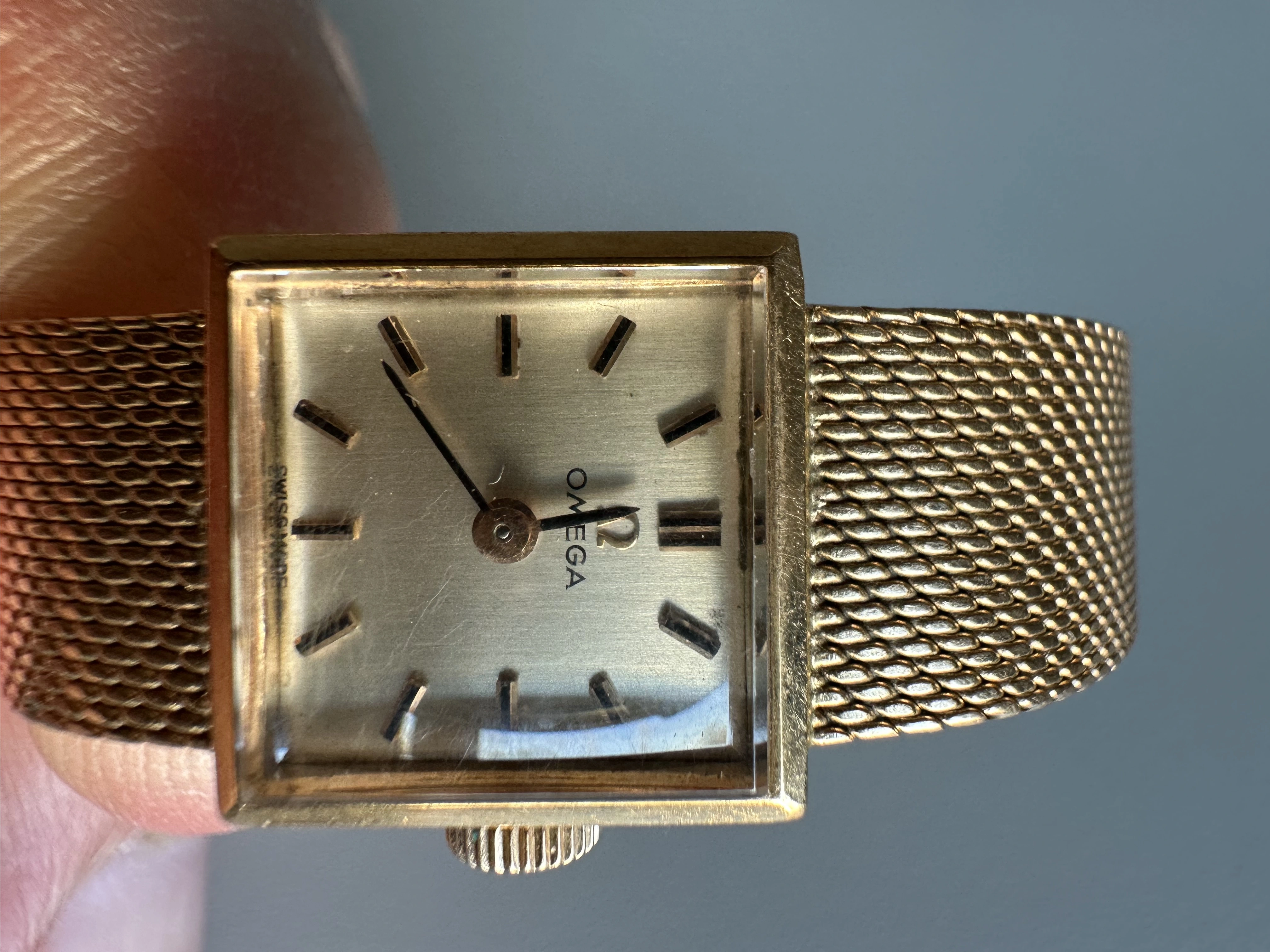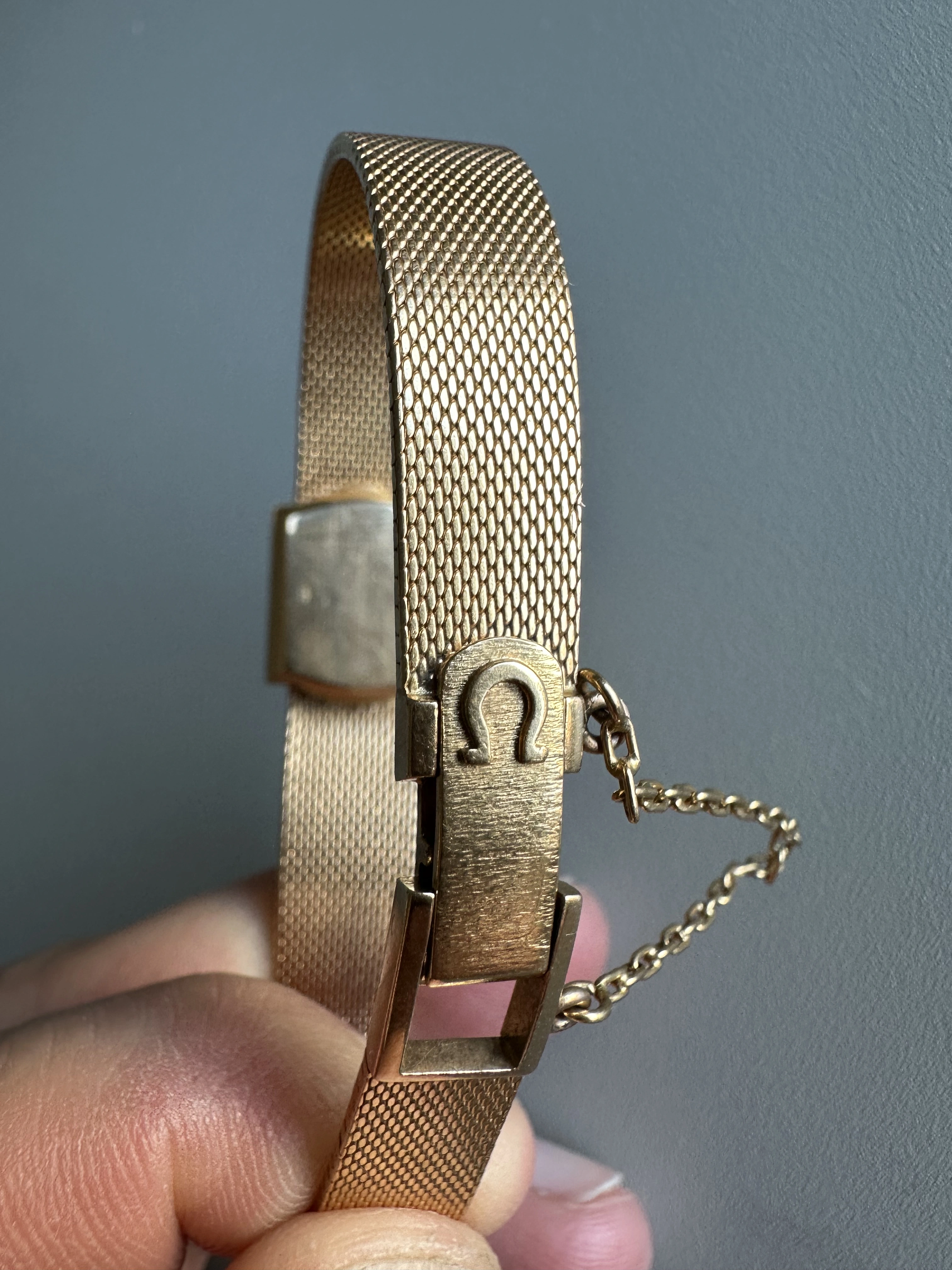It looks to be a genuine Omega "Ladies Cocktail Watch" in solid gold, possibly 18 carat, but I can't see the hallmark clearly.