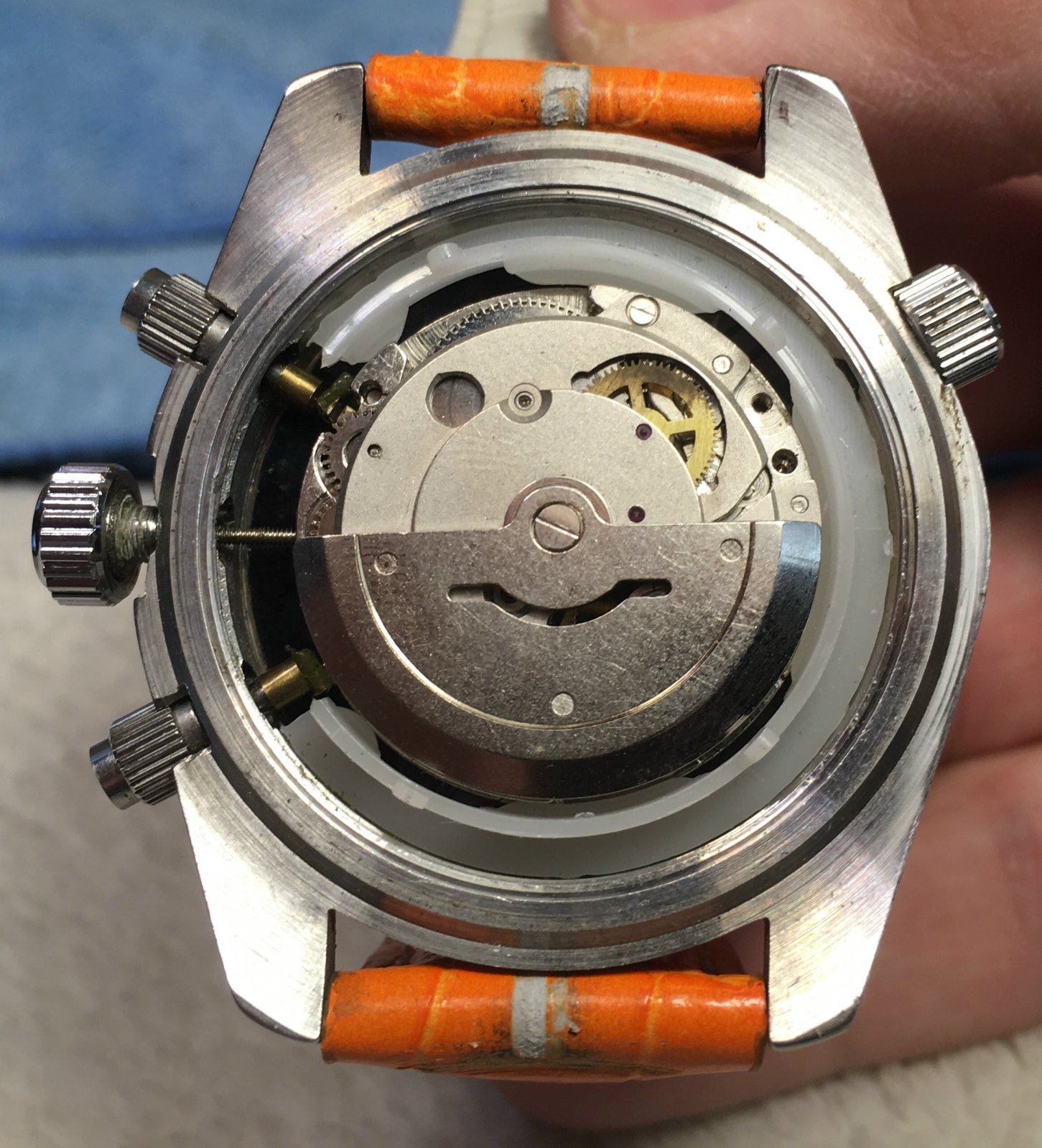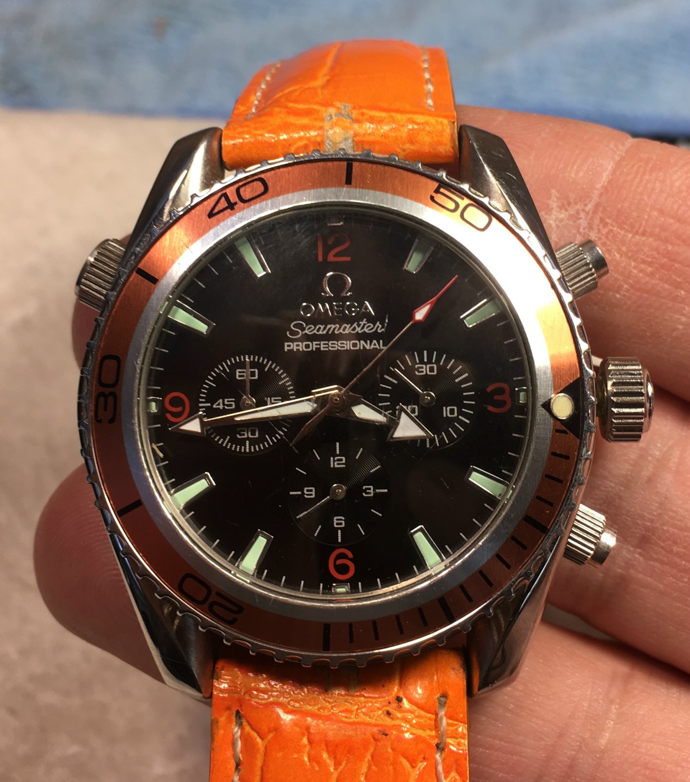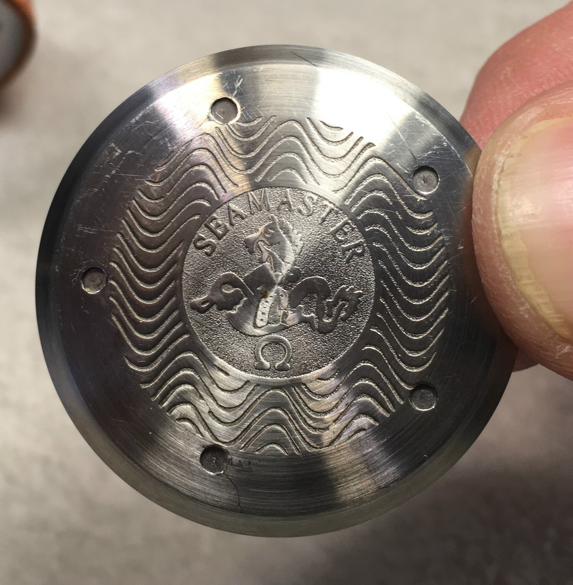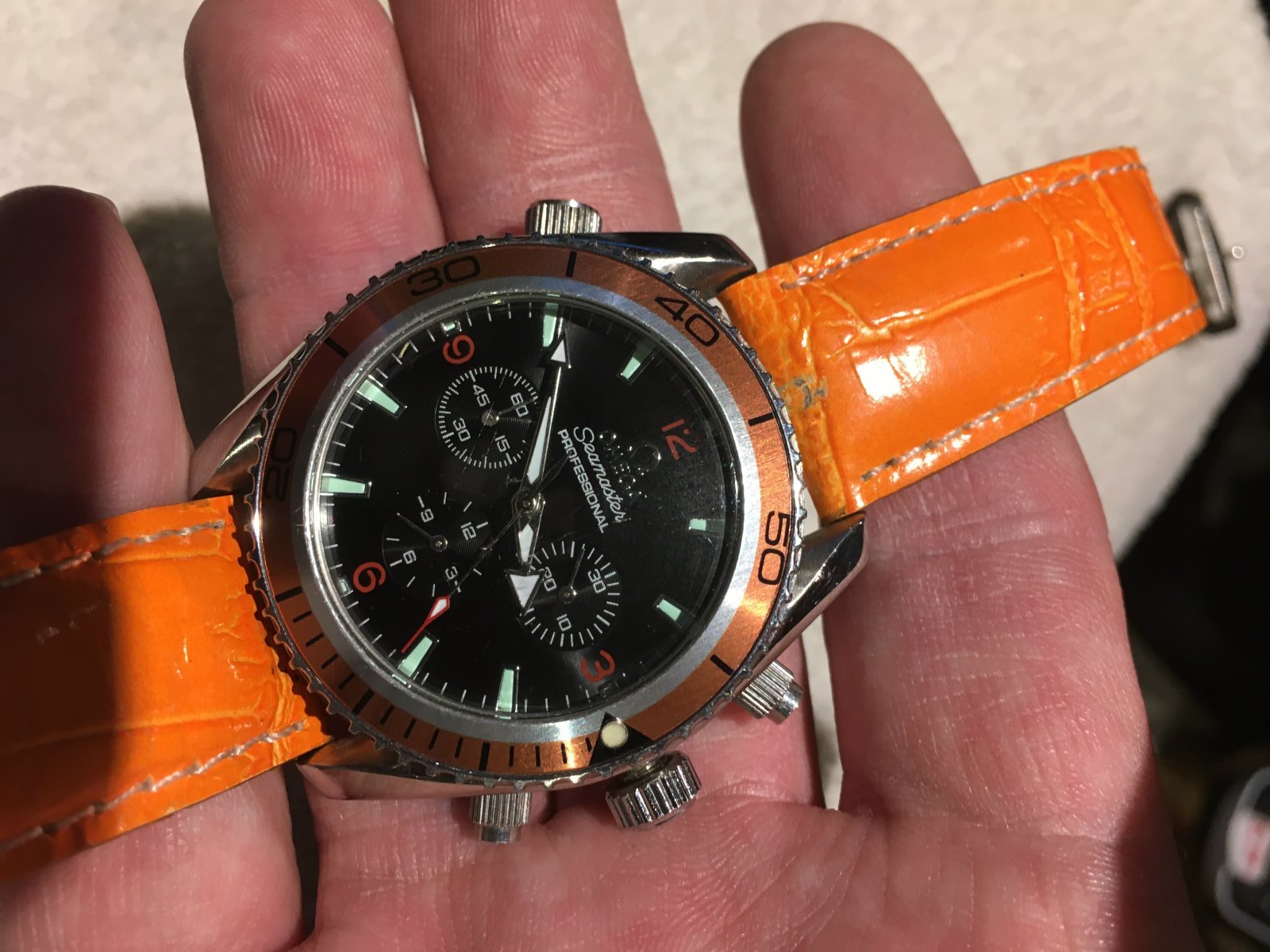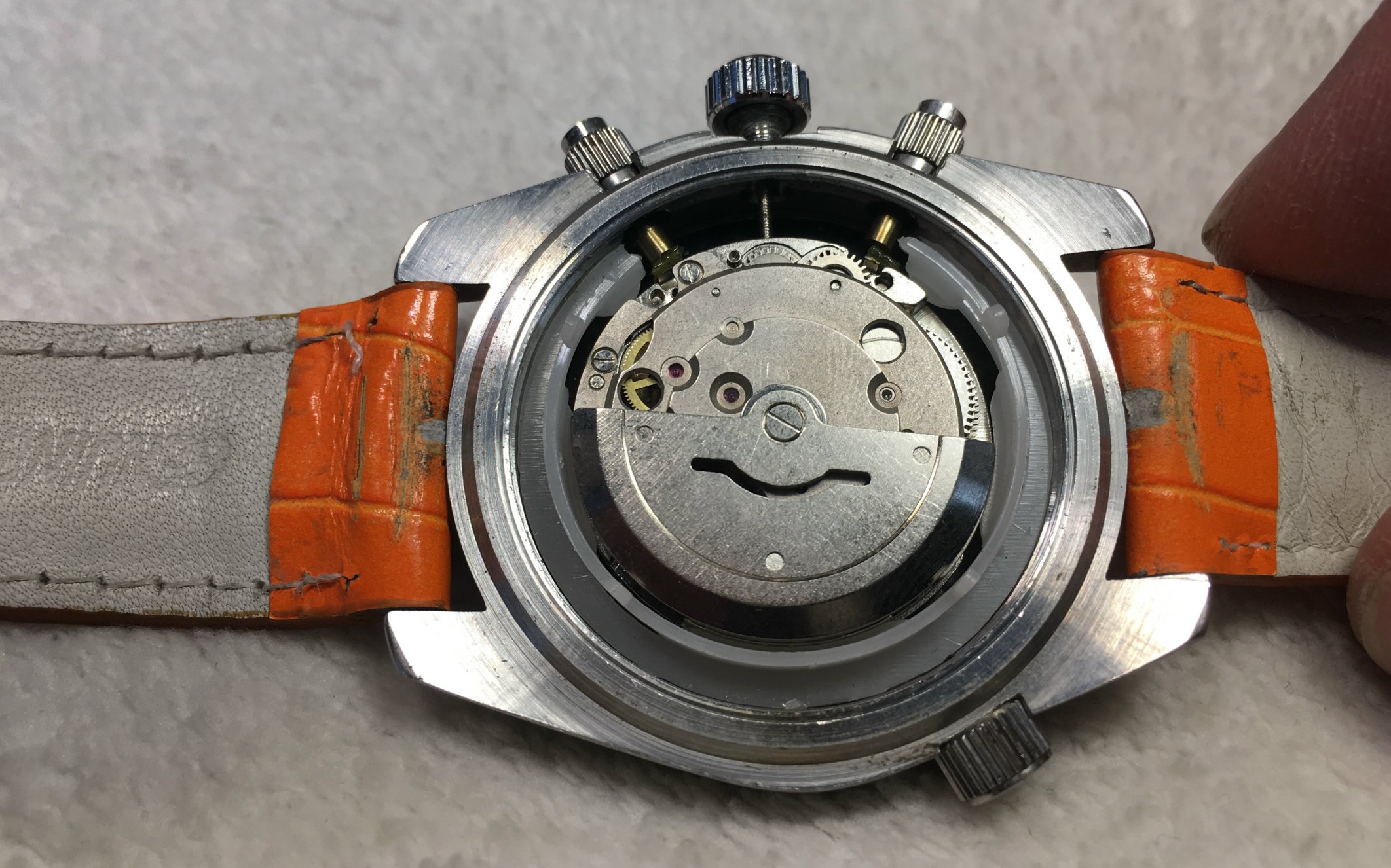 ·I found an 'Omega Seamaster Professional' with orange leather band at a consignment store, and am trying to verify authenticity. There are absolutely no serial numbers or numbers of any kind that I can find on the exterior or inside the watch (please see attached photos).