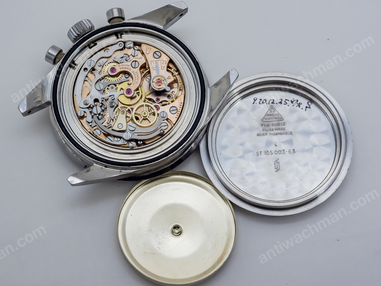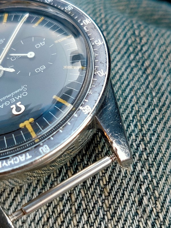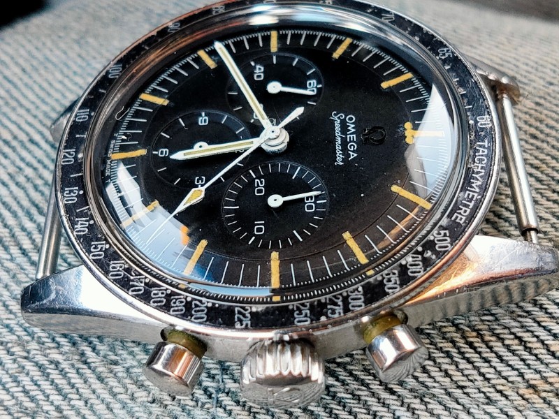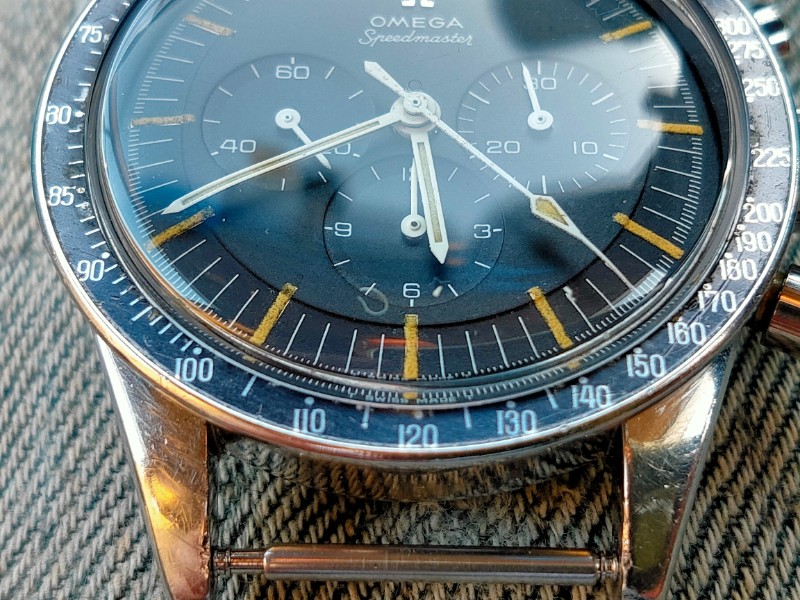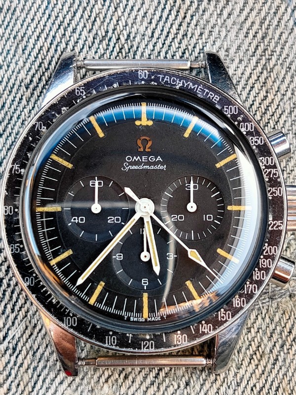 The watch itself only. There is no bracelet, box, or warranty card. There are some scratches and dents on the case. The case has scratches and dents, the bezel has scratches and dents on the tachymeter part, and there are paint flakes. The dial is relatively clean for a 105.003, although the luminous area has deteriorated over time. As for the hands, there are some age-related deterioration in the whole, especially on the second hand, which can be confirmed with a loupe as a kind of stain. The back cover has a shallow engraving but is clearly visible. The manual winding function and stopwatch are all in good working order.