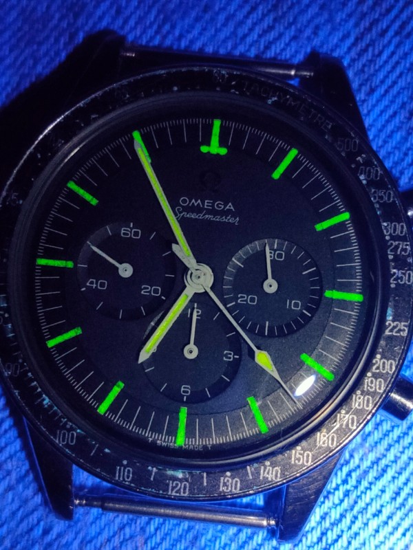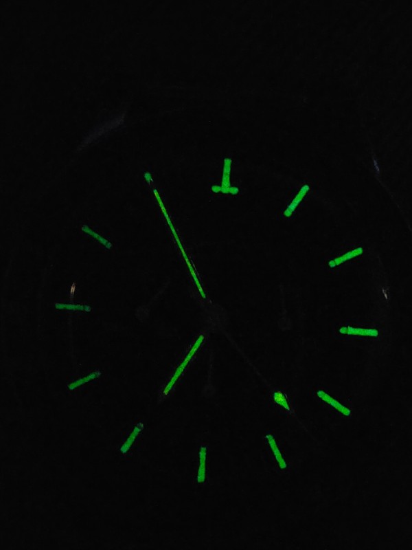 ・The indexes and hands glow when exposed to UV light. When the UV light is removed, it dims after a few seconds. I think the indexes and hands are tritium.