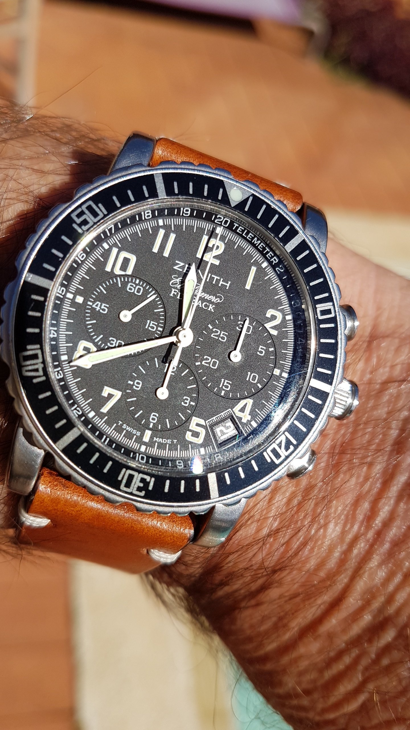 -you're wellcome. As a black chrono I have my Speedmaster, a ENICAR Jet Graph and (new) a LORENZ sub Professional. So I'm happy with my white Zenith as a contrast to my other watches.