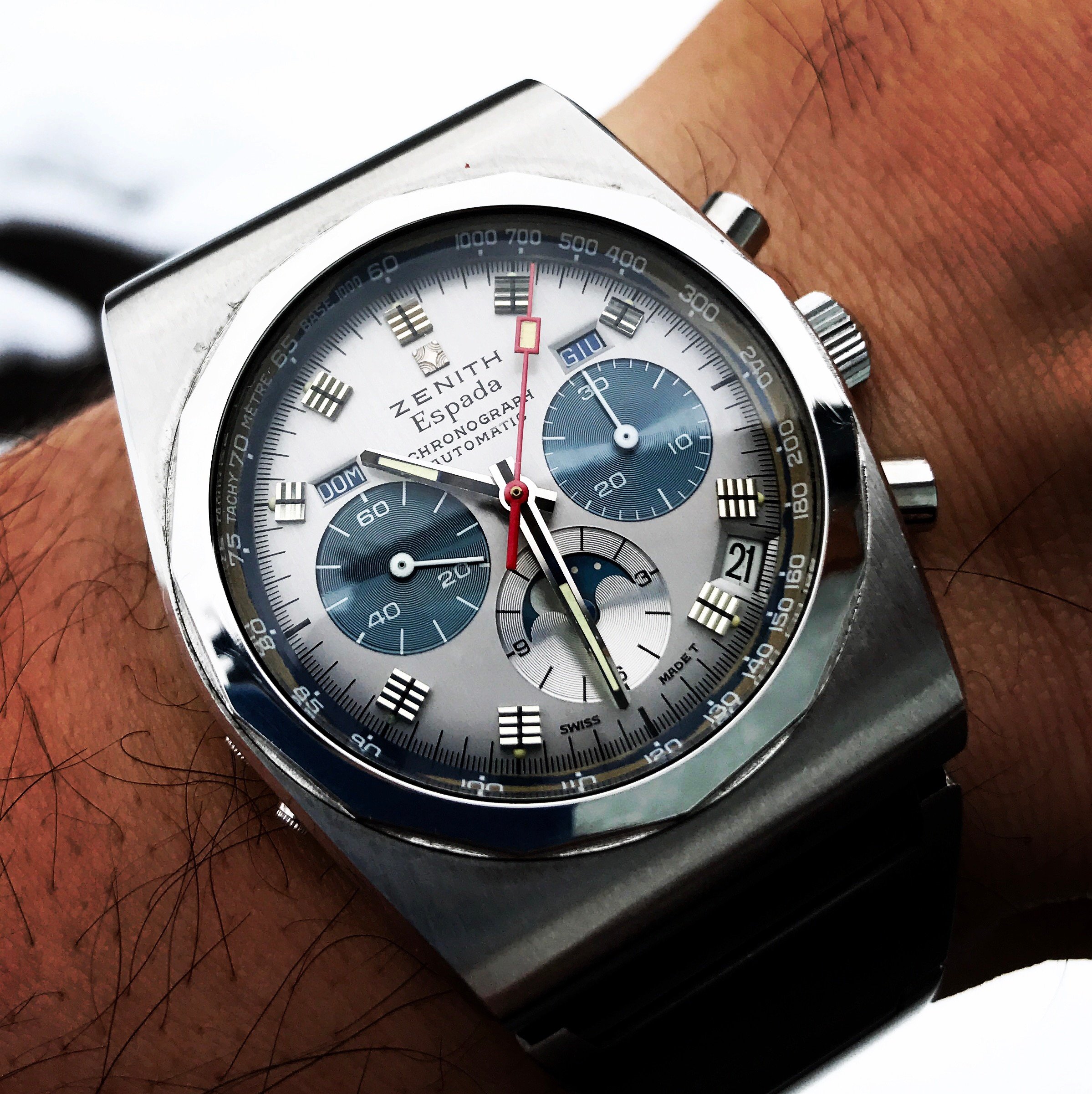 This one is weighty and comfortable, subtle in low light with the black dial and just the sub-dial edges glowing ghostly catching the light. And the (not really) Movado moon is dim.