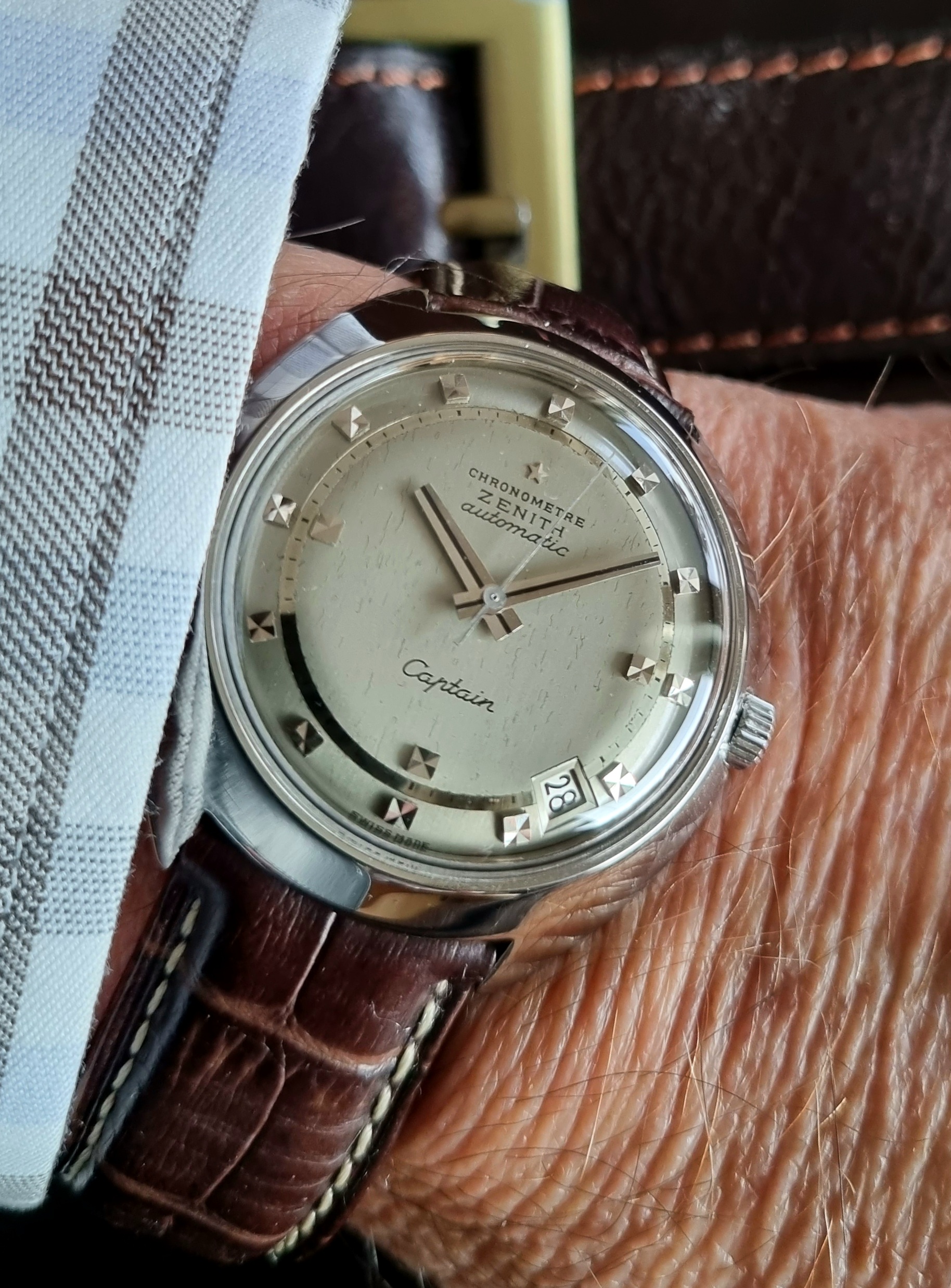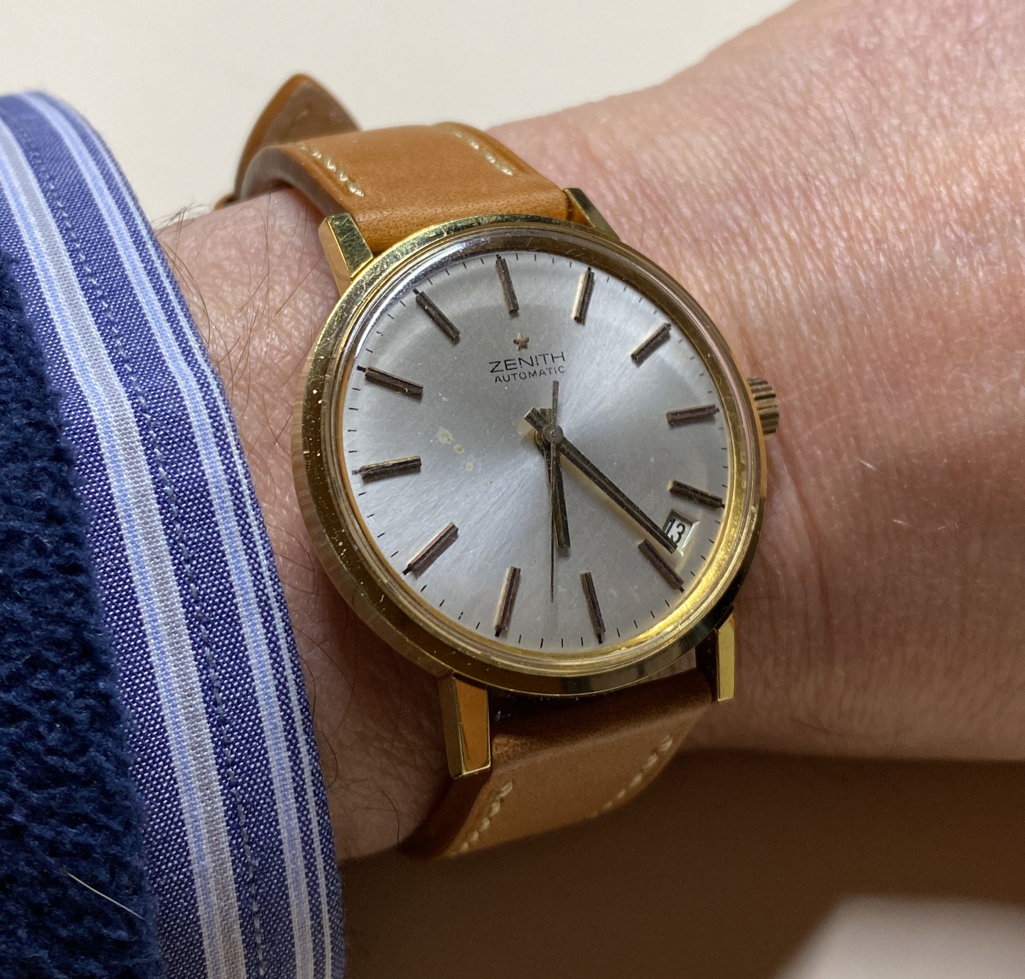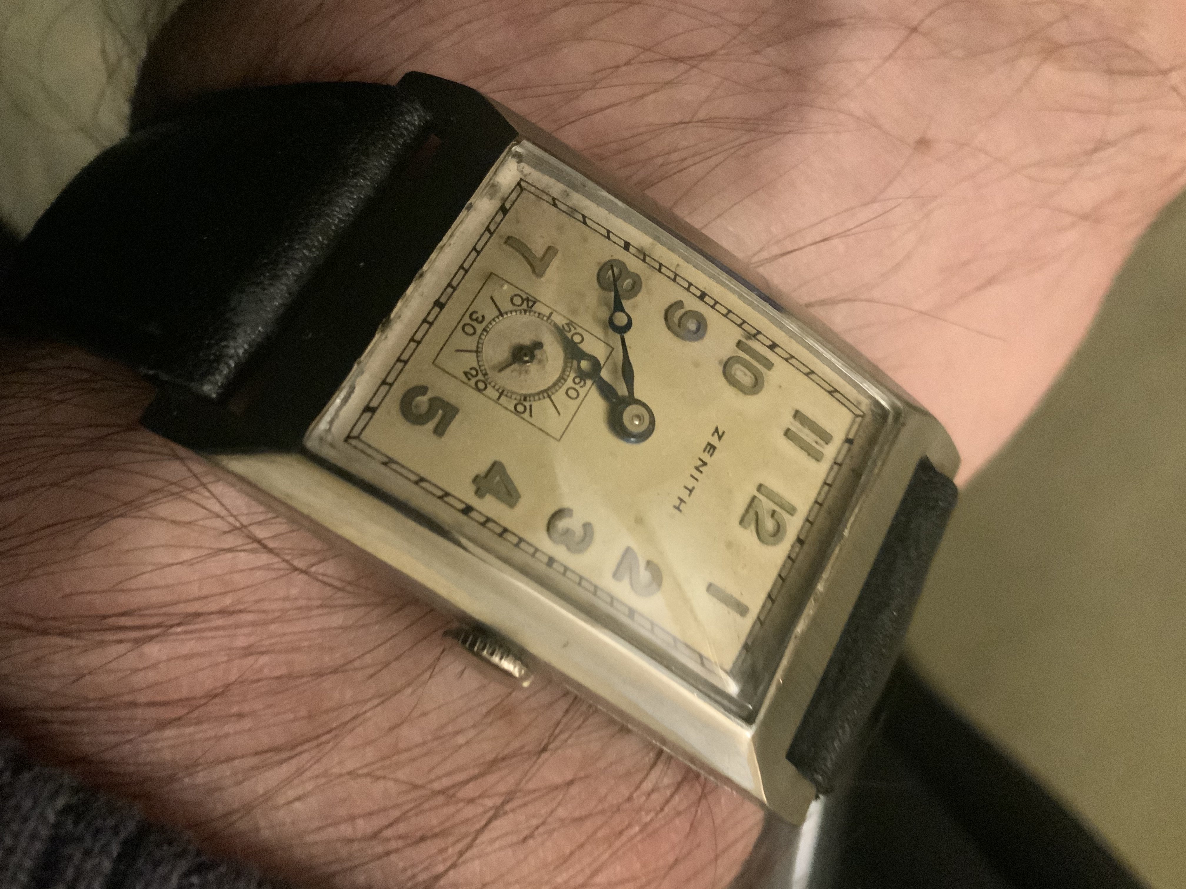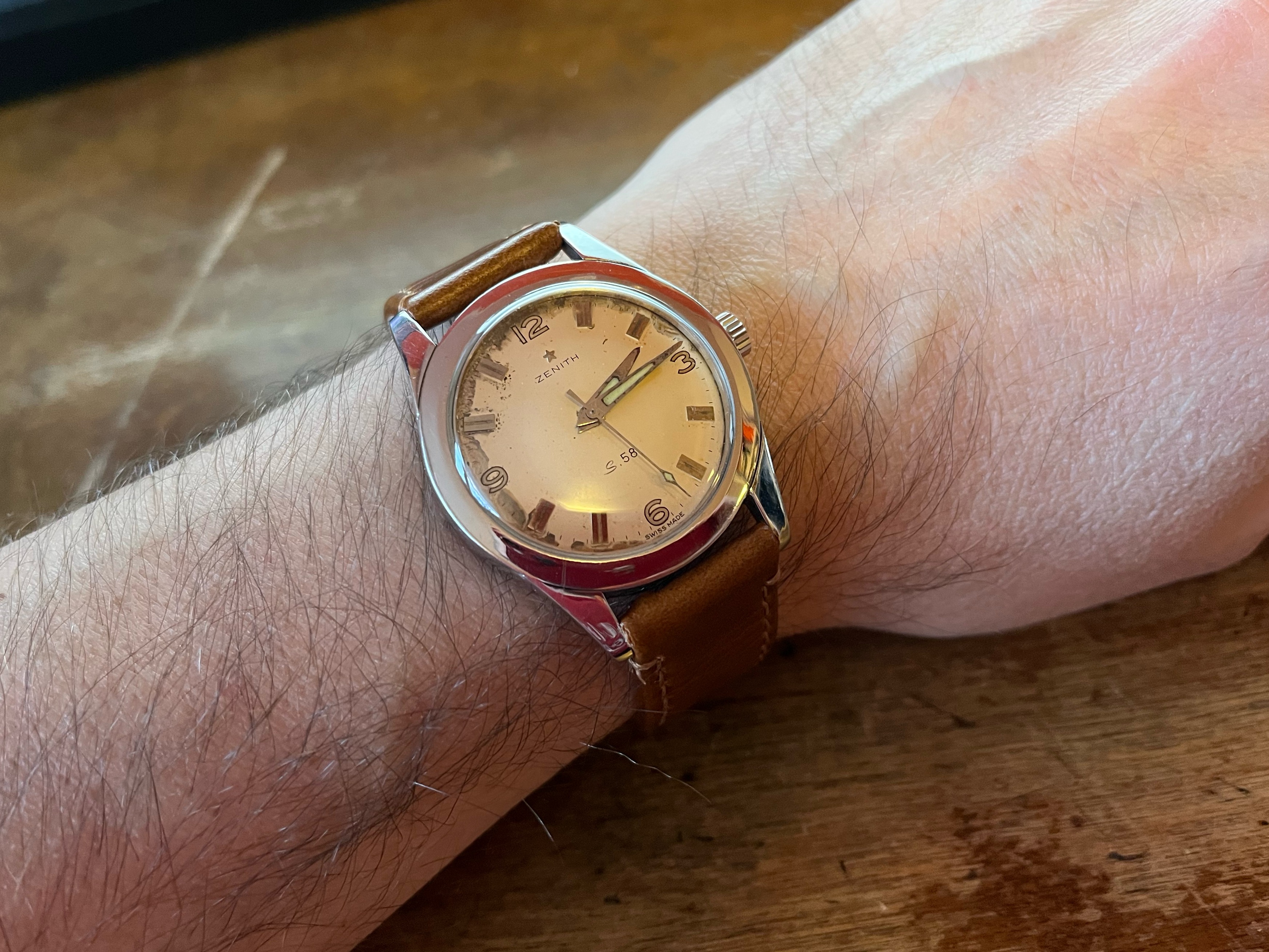 Posts 197 Likes 1,131 Mauzer ·Nov 30, 2021 Nice to see some vintage Zenith watches here. Here's 1/2 vintage Zenith I got: Cal. 106-6, oversized model (37mm), from 1955-1956 Some damage on the dial, but still like the overall appearance and wearability of the watch.