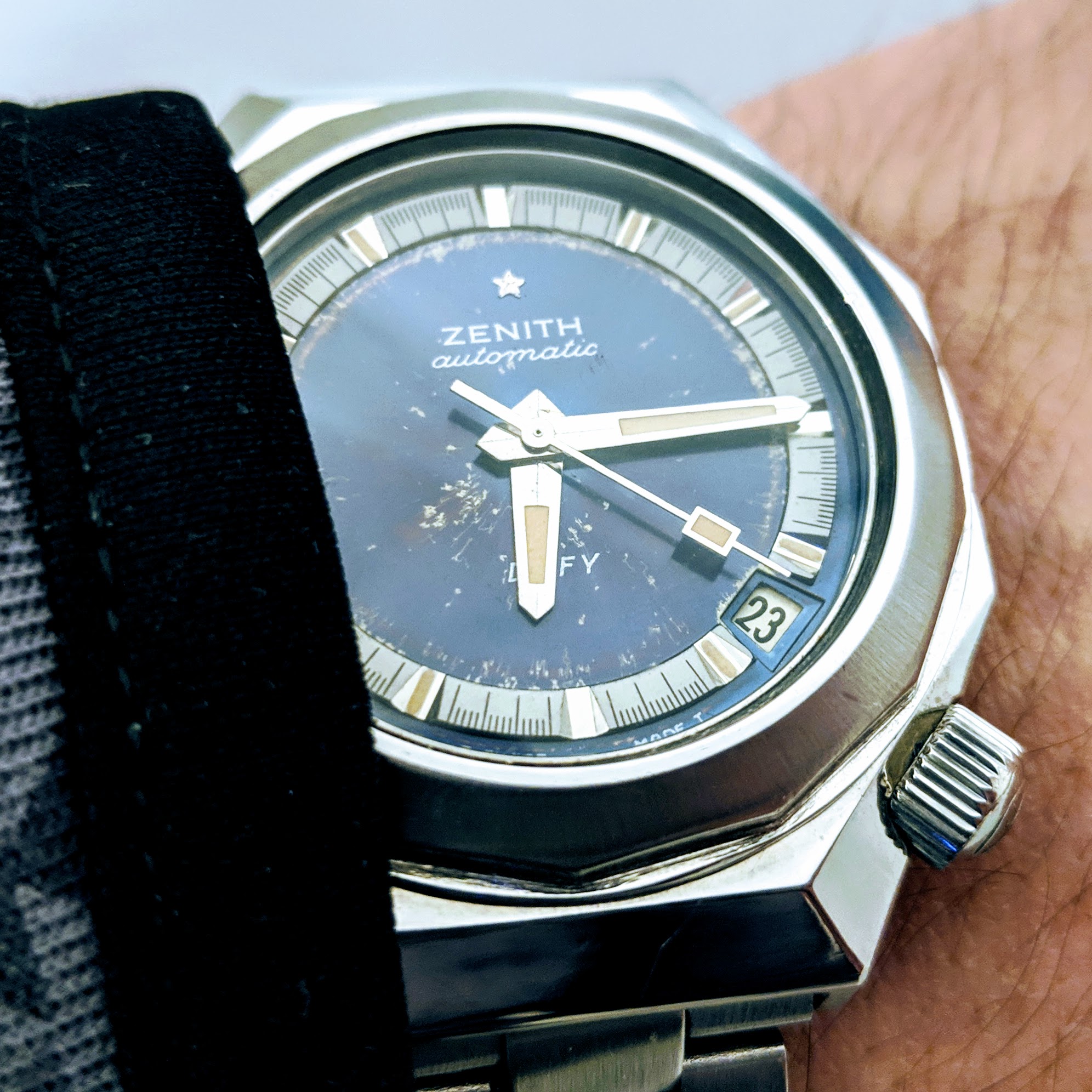 I really like that case design, it's super cool and looks awesome with the black dial. The Defy 'problem' is related to water ingress? My recently acquired Defy has similar corrosion of the hands, lume and dial. I'm waiting for my watchmaker to take a look inside, but am interested in whether the seals are OK, or not...