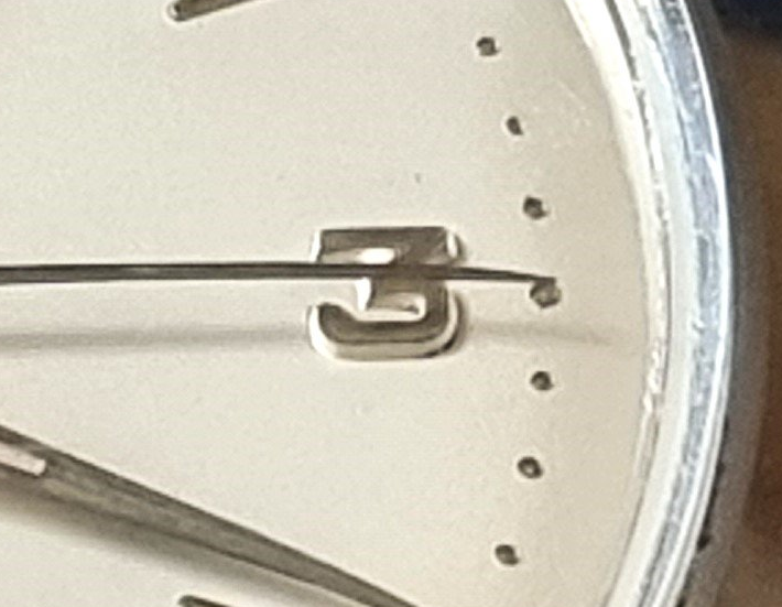 There is another difference between this early dial variation and the vast majority of subsequent ref. 666 dials that is worth noting: the indices are embossed, rather than having been "applied". Embossing is a cheaper process, as applied indices are, with rare exceptions, more finely sculpted, more robust (either steel or gold), and make a higher-class impression to the eye.