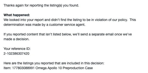 eBay doesn’t care. I’ve reported many watches that were clearly fake and I’ve never once seen them taken down.