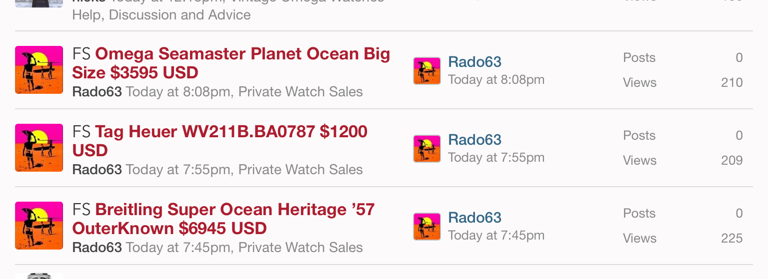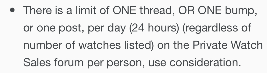 - There is a limit of ONE thread, OR ONE bump, or one post, per day (24 hours) (regardless of number of watches listed) on the Private Watch Sales forum per person, use consideration.