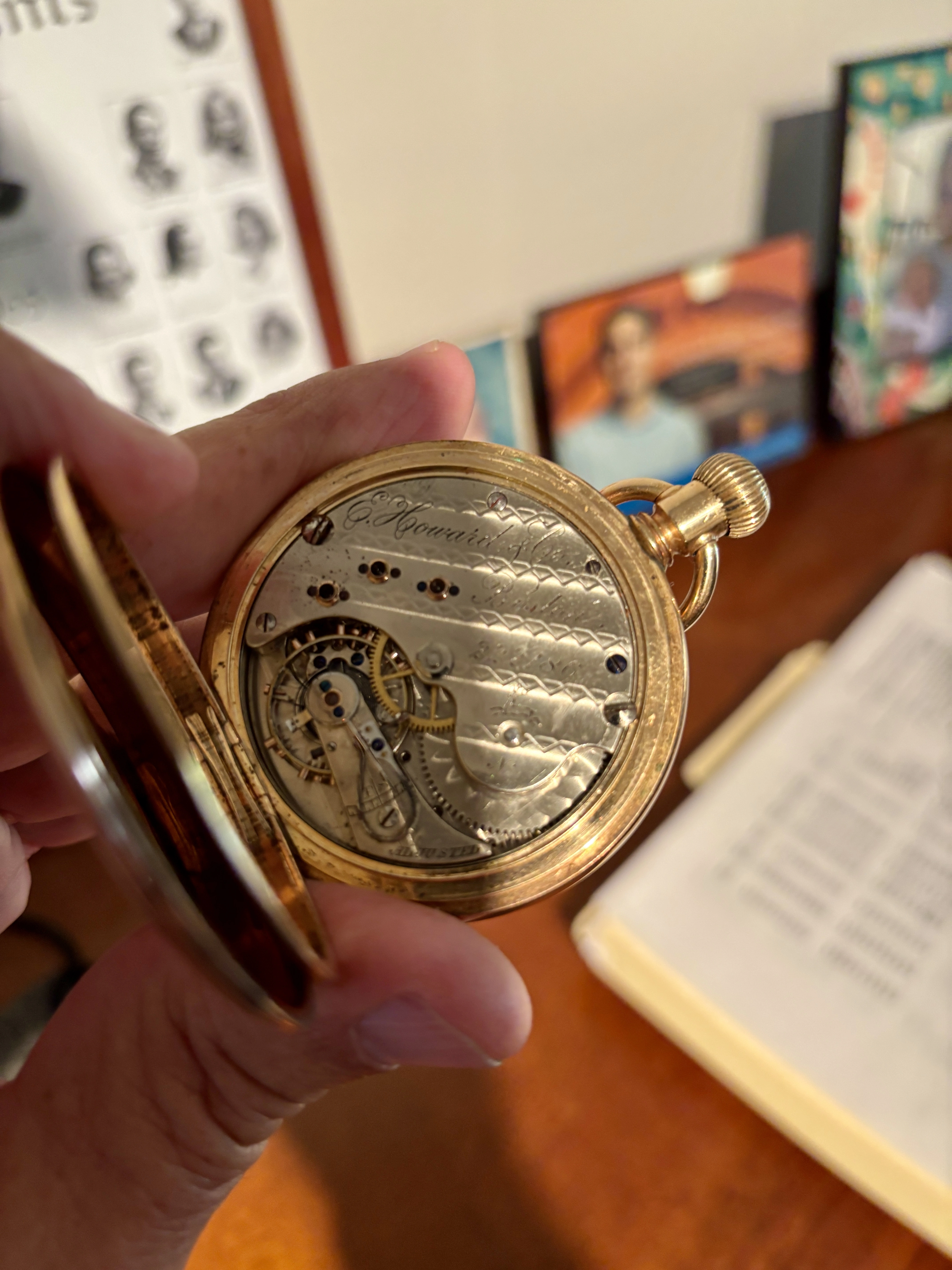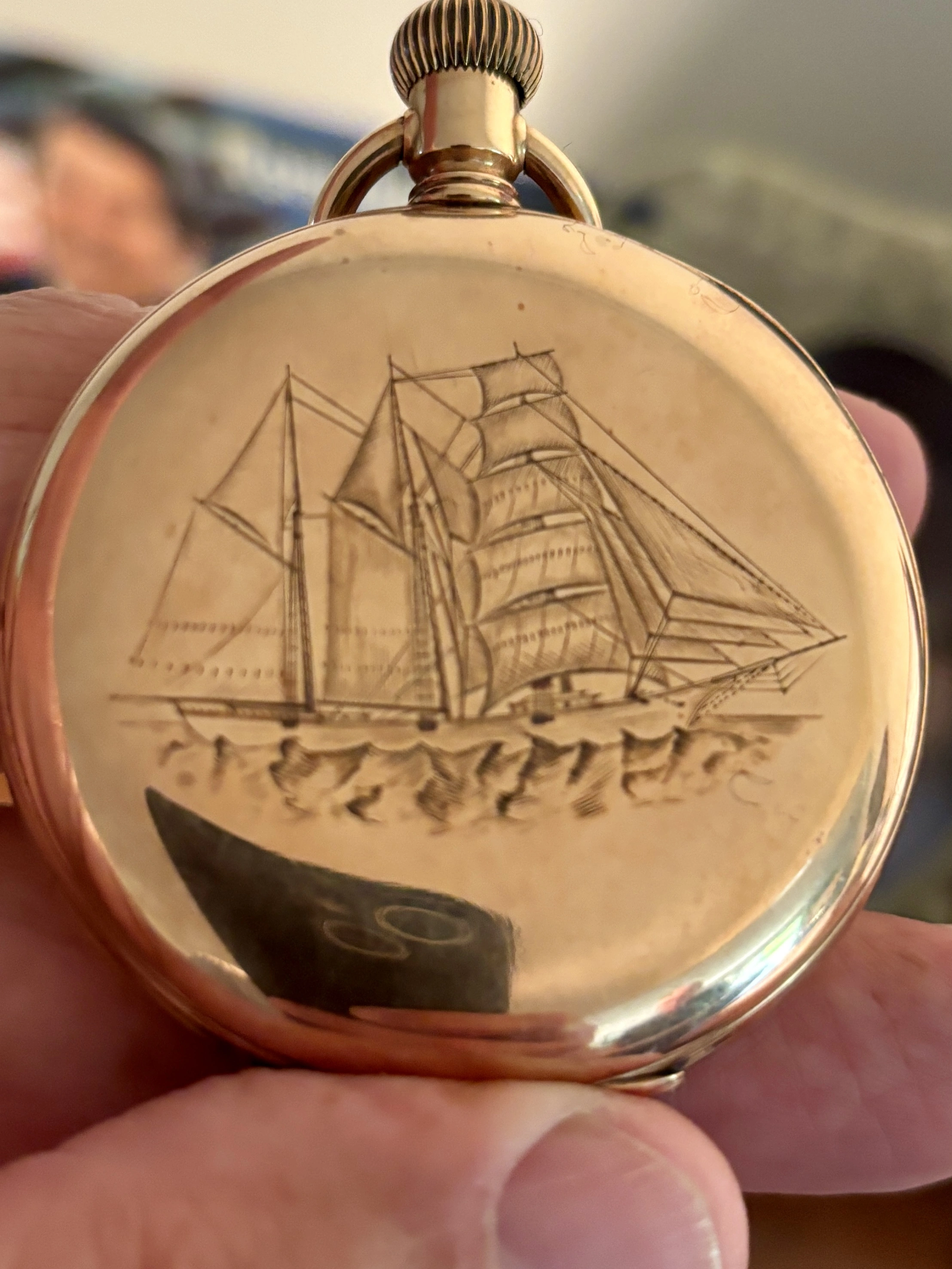 ··Color Commentator for the Hyperbole.Greetings… This very cool watch is in amazing condition but isn’t running. Its been in my friend’s family, mothers side, for a century or more. I’ve advised him to take it to our local watchmaker, MJ to get it serviced. I’d very much appreciate any insights based on experience and an estimate of its value. The clipper ship seems to indicate some association with shipping but his genealogy efforts show no associations in the family tree. He plans to leave it to his son but I am pushing him to get it serviced now. (He jokes that he has ten years left) … Thanks!