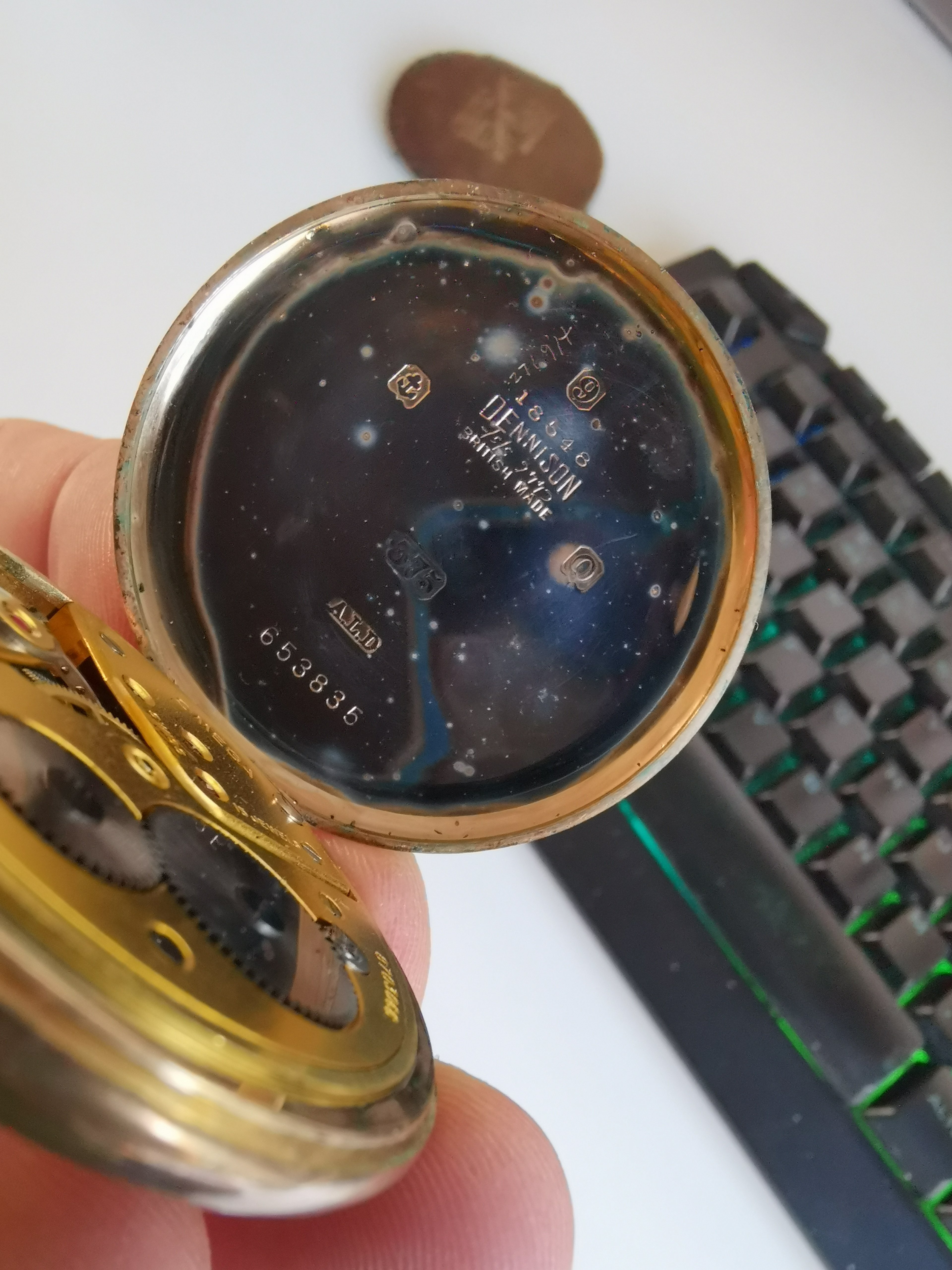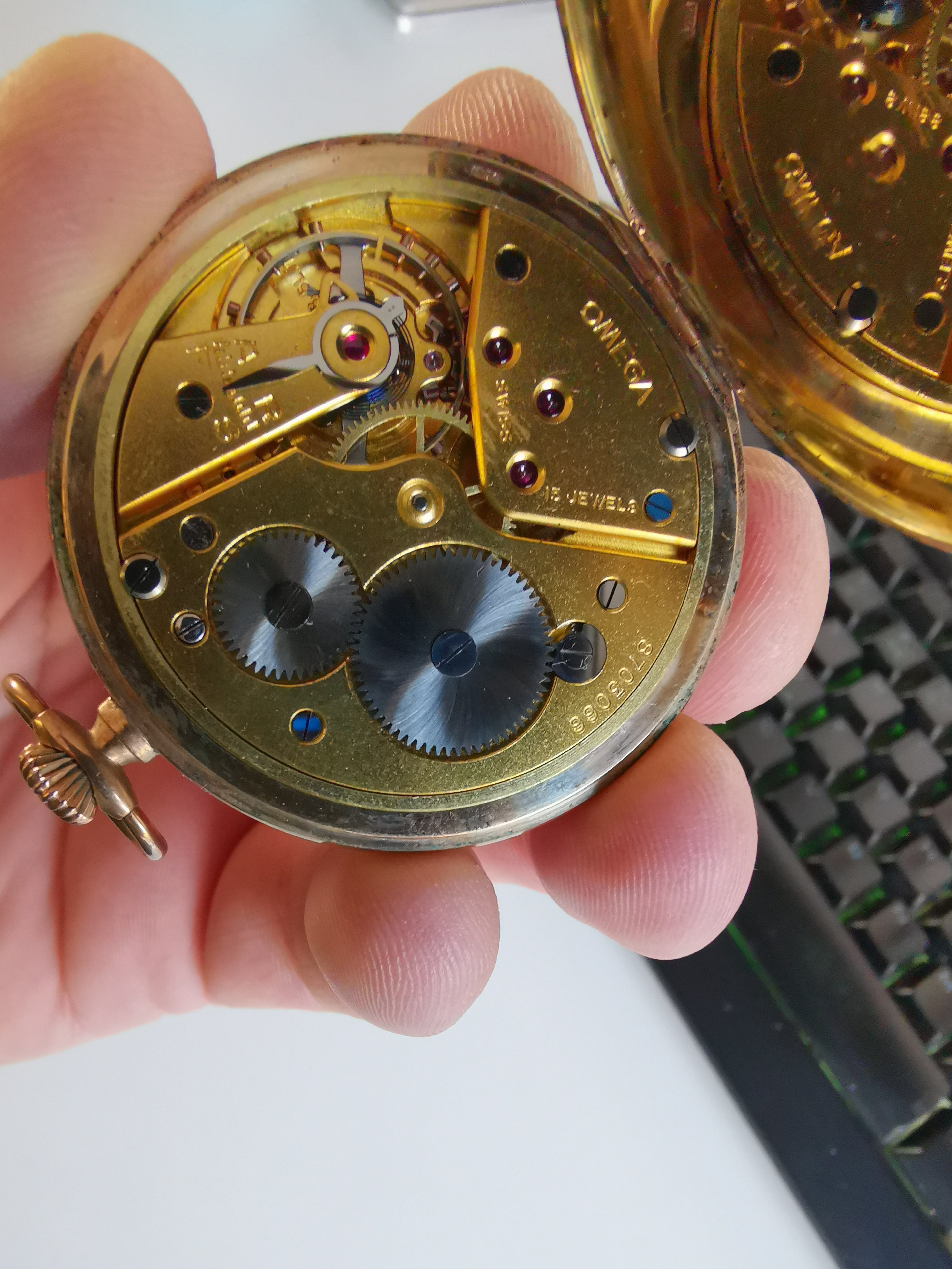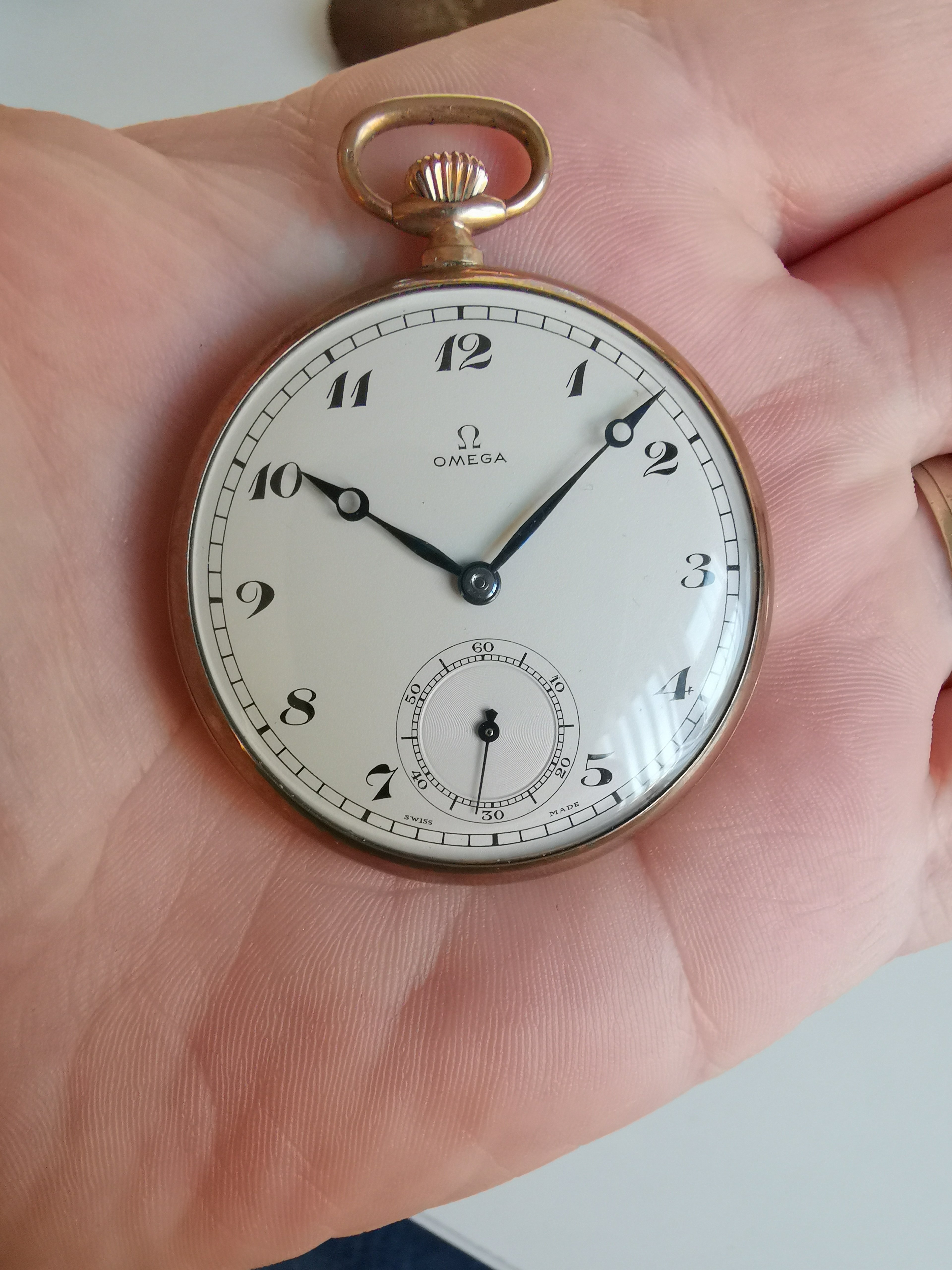 Movement is Omega calibre 38.5L, 15-jewels. Case by Dennison, 9 karat gold (.375), hallmarked Birmingham, England, circa 1939-40. Made for the market in Great Britain. Your movement became calibre 160, but yours has the calibre # 38.5L marked beneath the balance wheel. Bi-metallic, temperature compensating balance wheel, blued steel Breguet (overcoil) hairspring. I suspect it has a vitreous enamel dial, but hard to tell from your picture. Looks to be in premium condition.