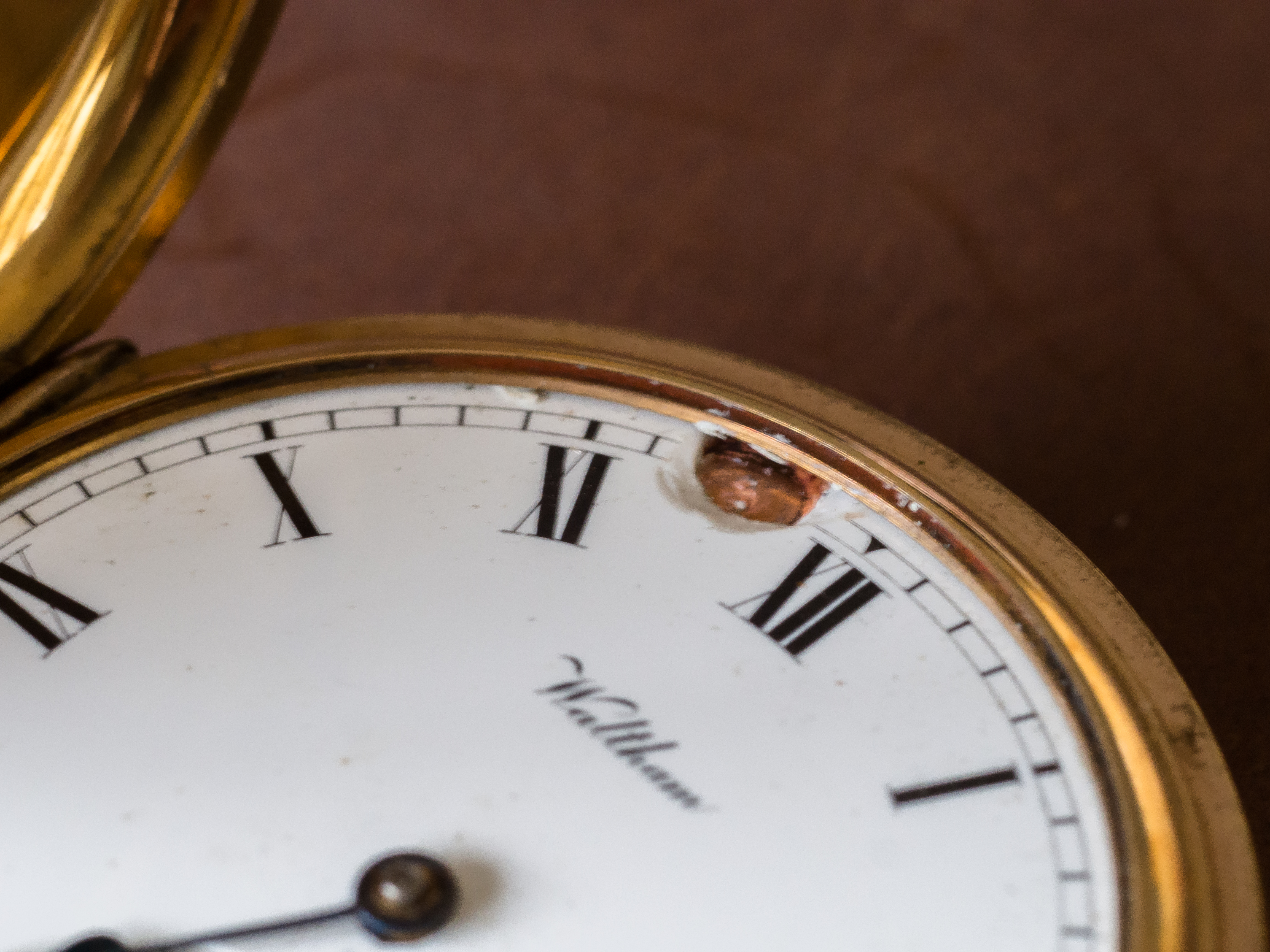 The Waltham "Traveler" is very clean and running but is missing the glass, minute hand and has a chip on the dial that would need repairing.
