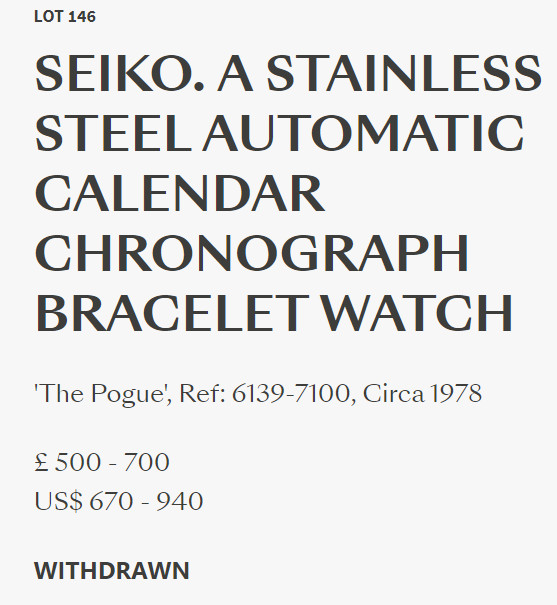 Anyway. Bonhams auctions has occasionally flogged off the odd Seiko 6139-6002 or variant (just in case you're of the opinion that you can't call a Pogue a Pogue unless it's a yellow 6139-6005). Here was one that hammered in London in September 2021: