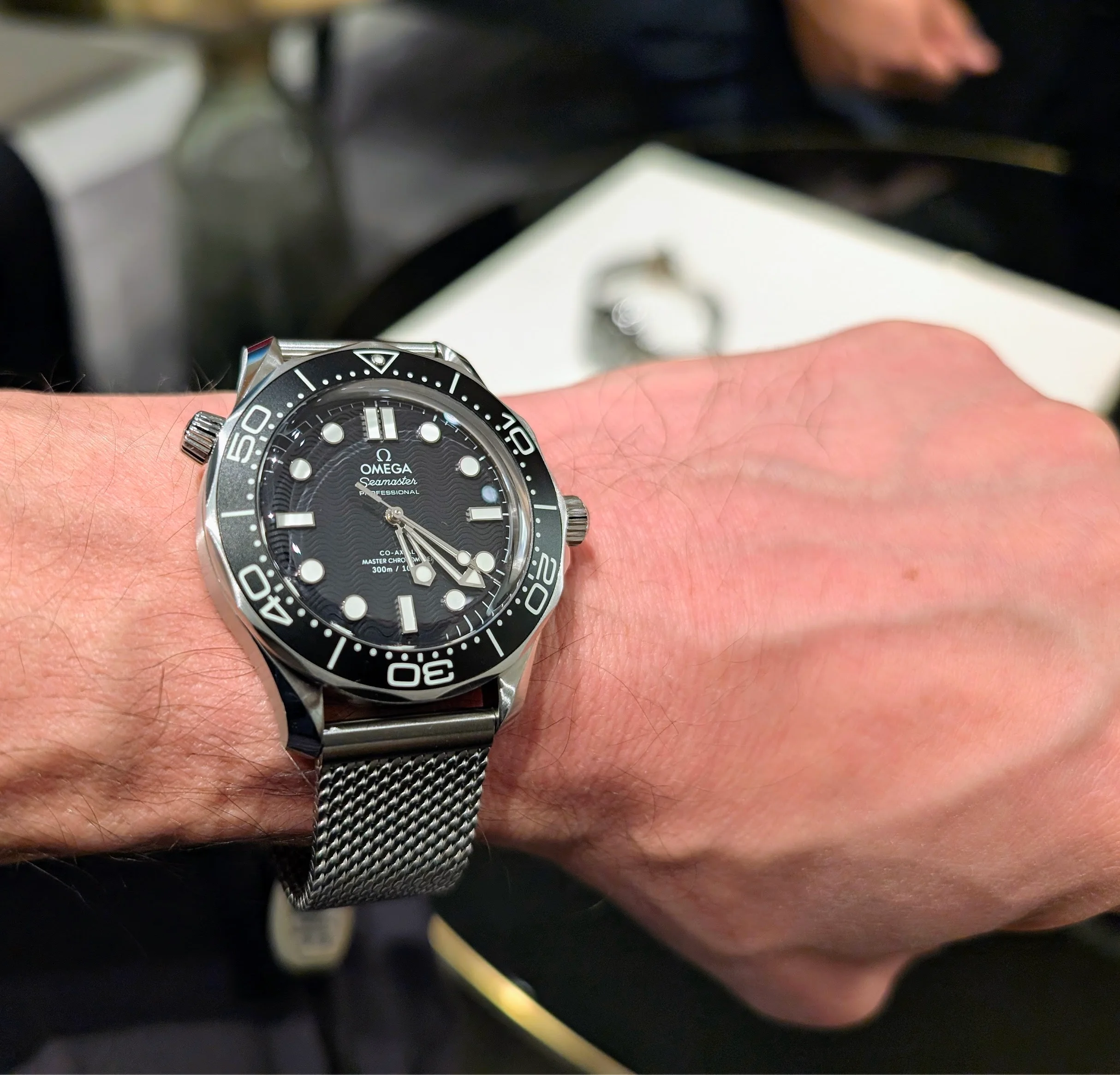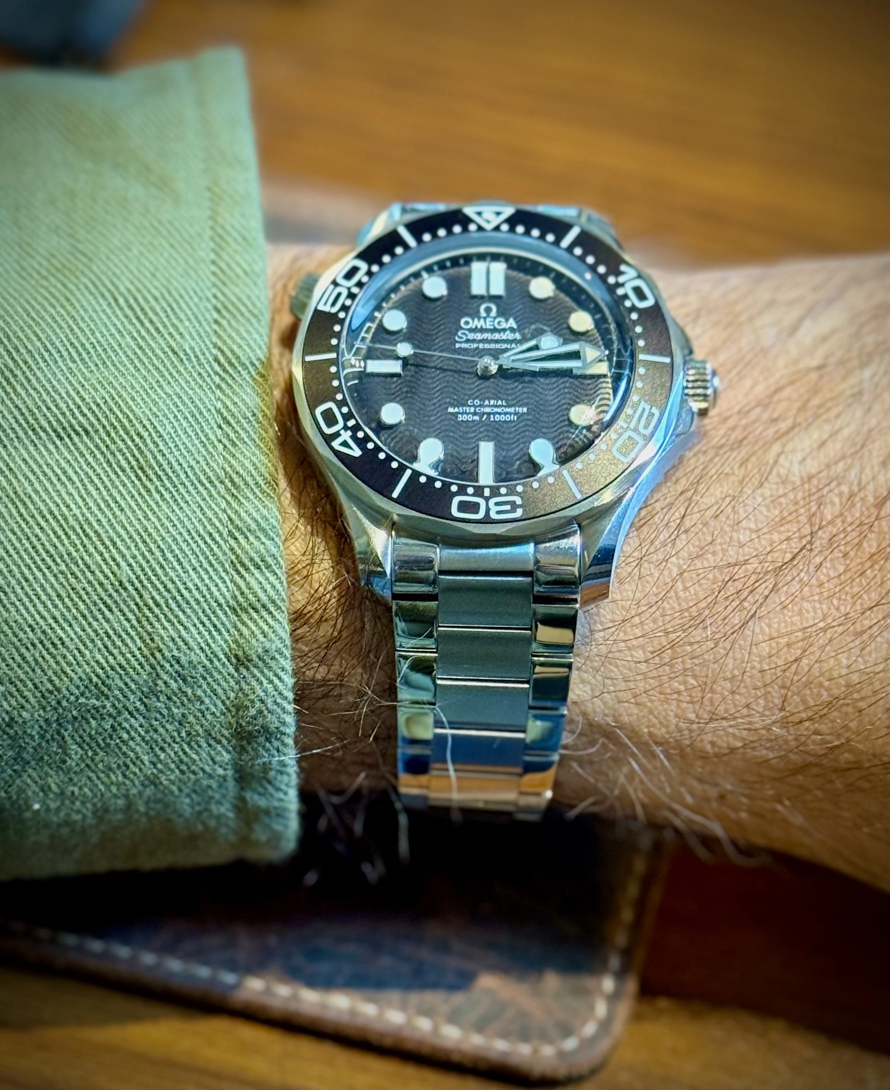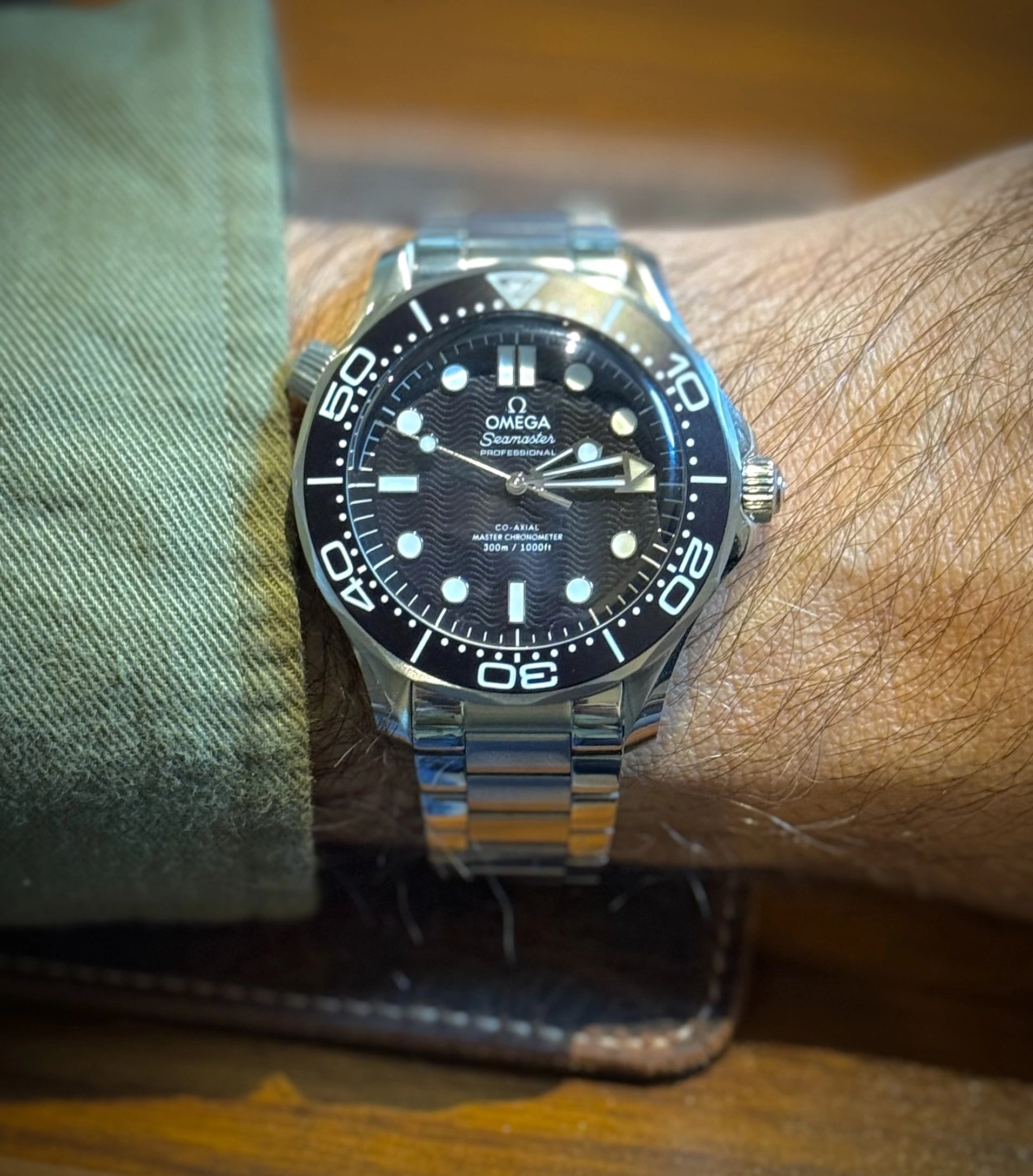 And here it is with the Forstner contemporary flat link bracelet (and their new adjustable clasp). Until Omega offers a similar flat link bracelet for the SMP 300M (similar to the Heritage 300, which I have and love, but is 21mm lug width), this will be how I wear it. Super happy with it.