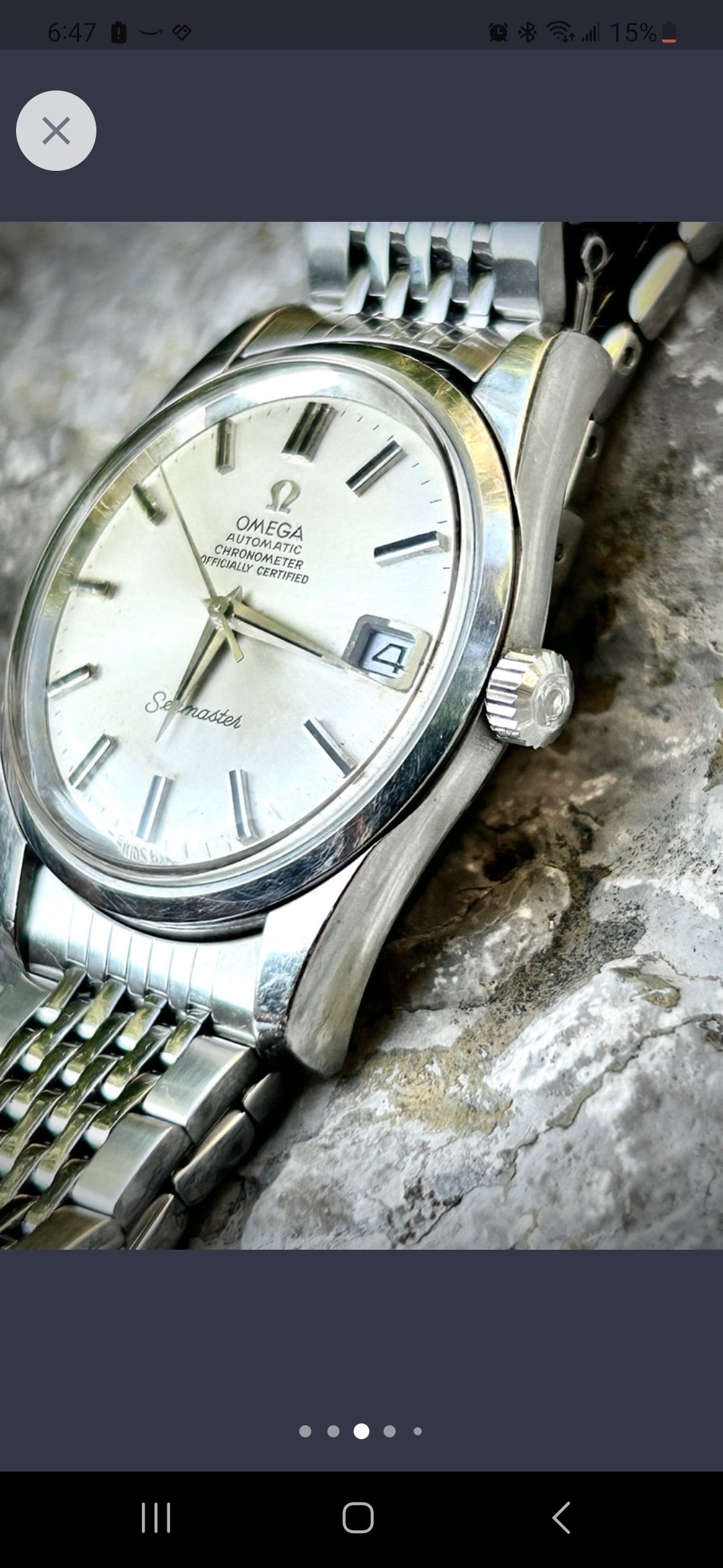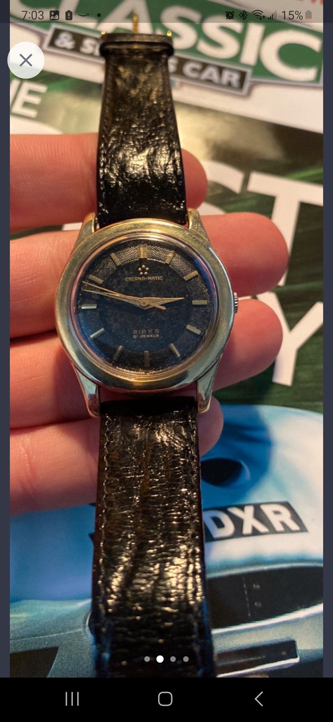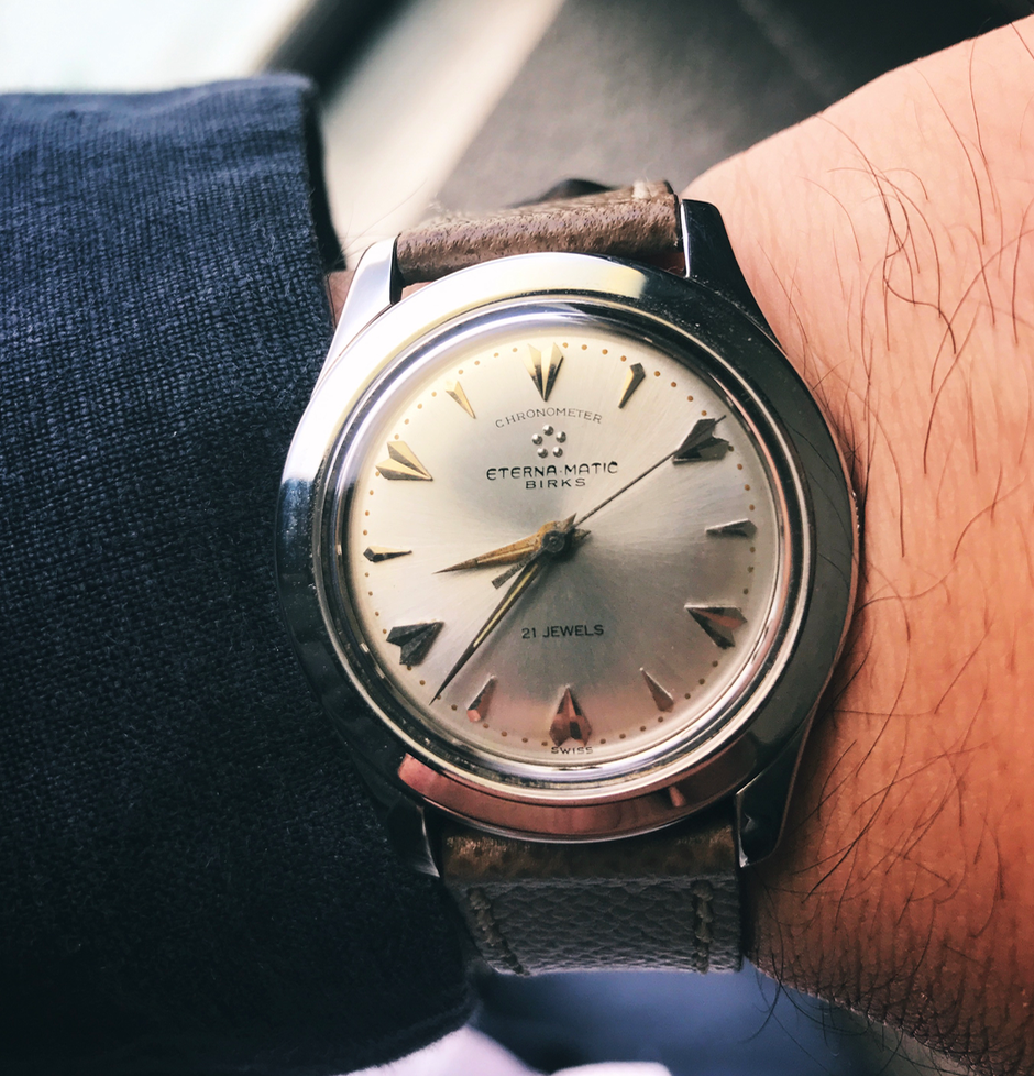 this cool Eterna - Birks came up, but far away so I can't inspect. It has a black, pie pan, waffle, two tone dial which I think is unique and quite striking.