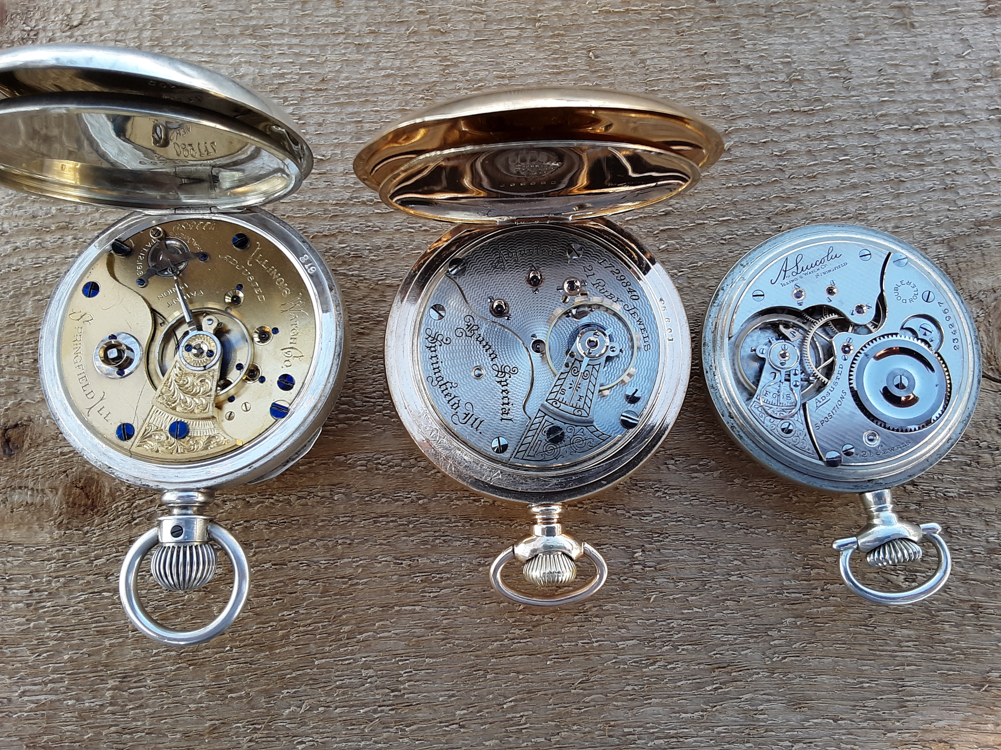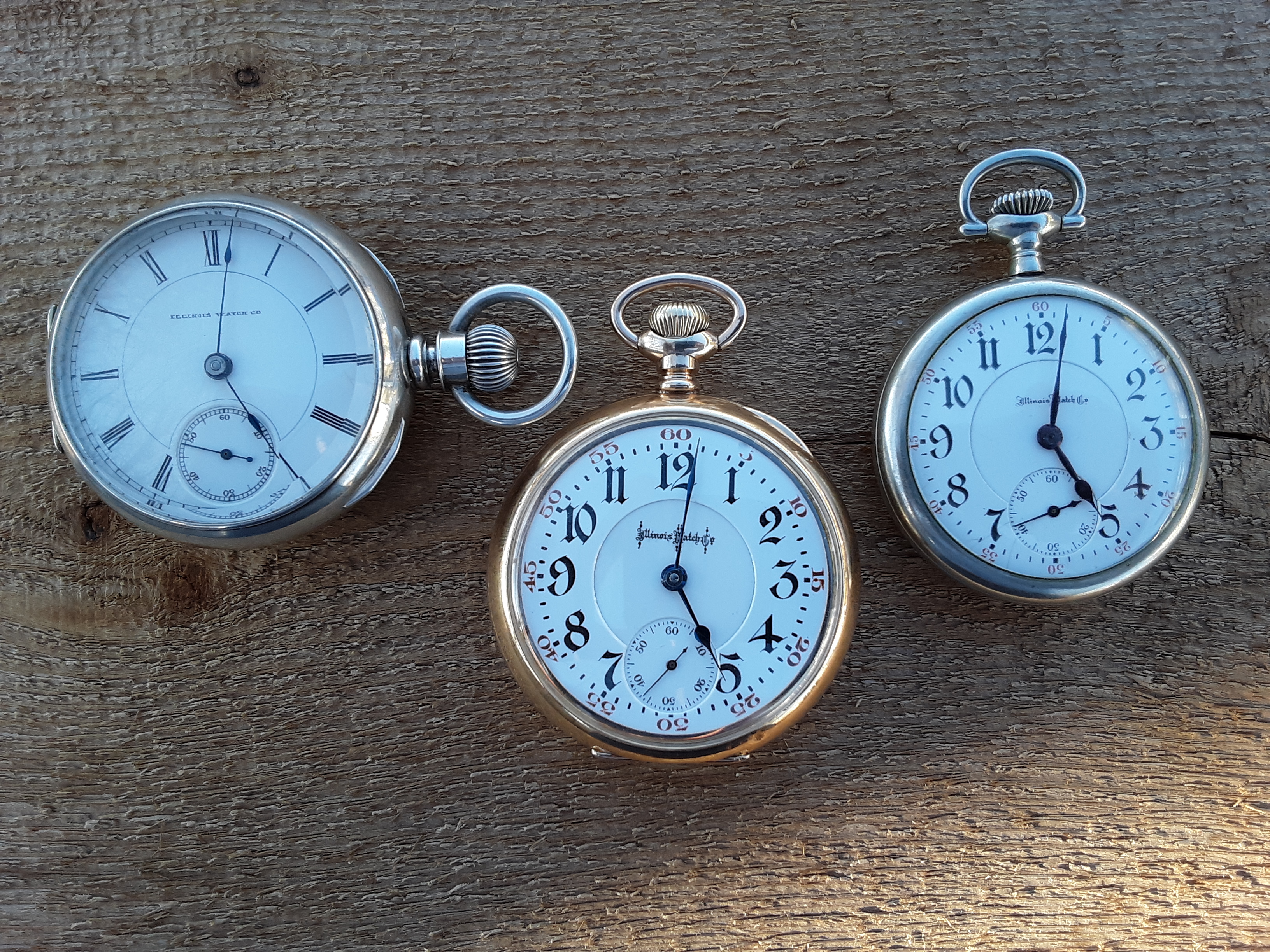 Three of my pre-war (that's the Great War) Illinois railroad approved pocket watches. From left an 1887, model 2, grade 5; a 1904 model 6, grade Bunn Special; and a 1911 model 5, grade A. Lincoln.