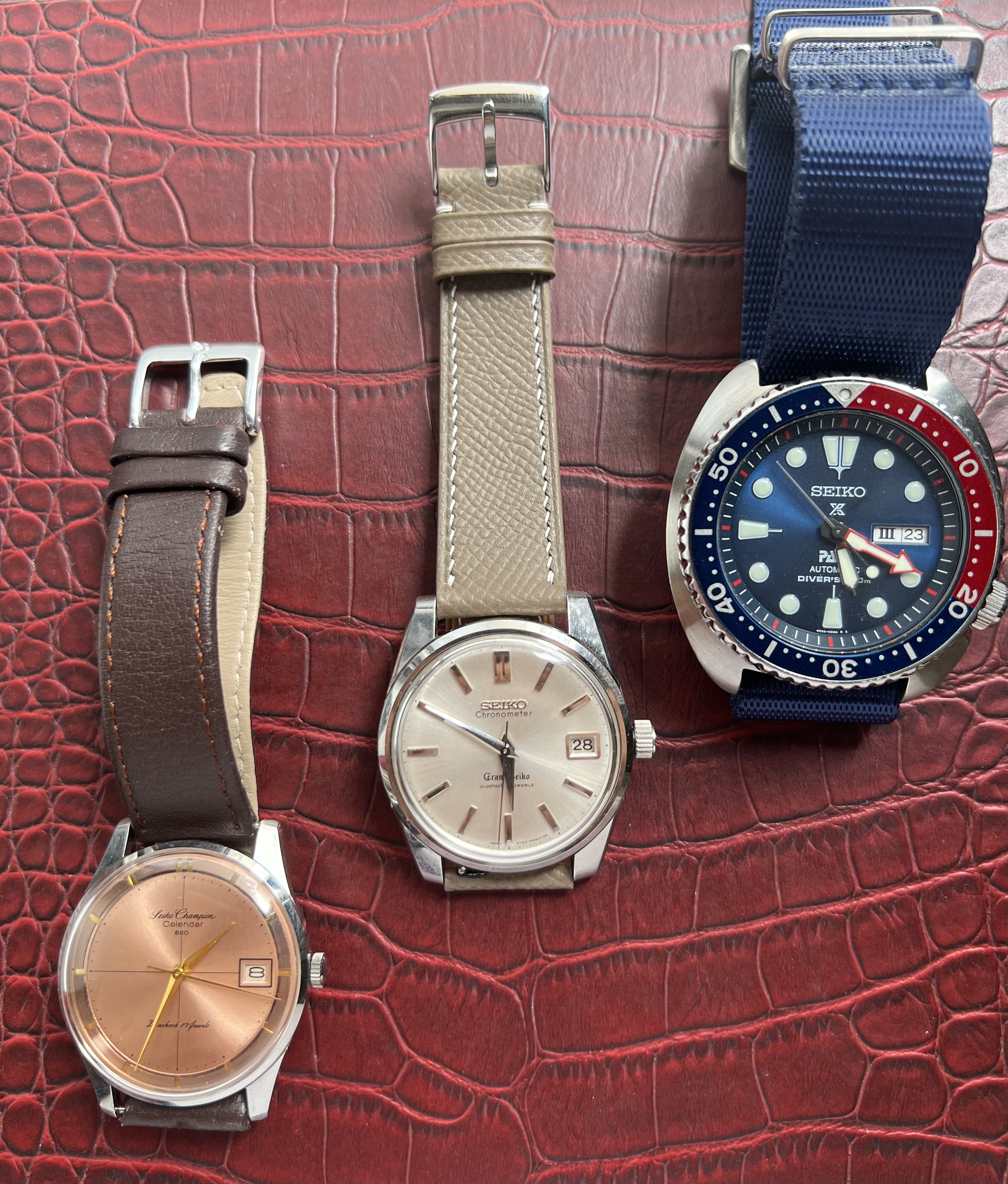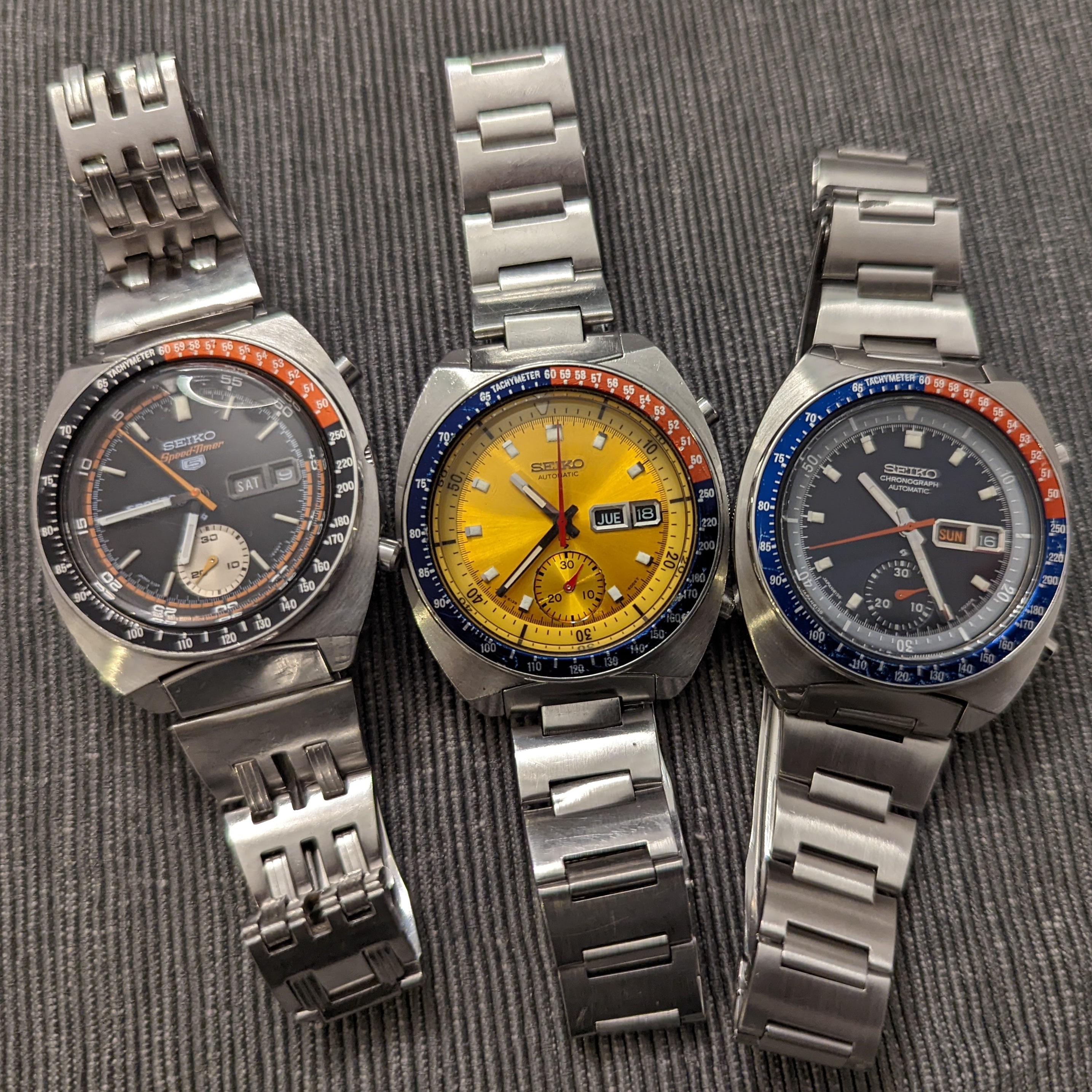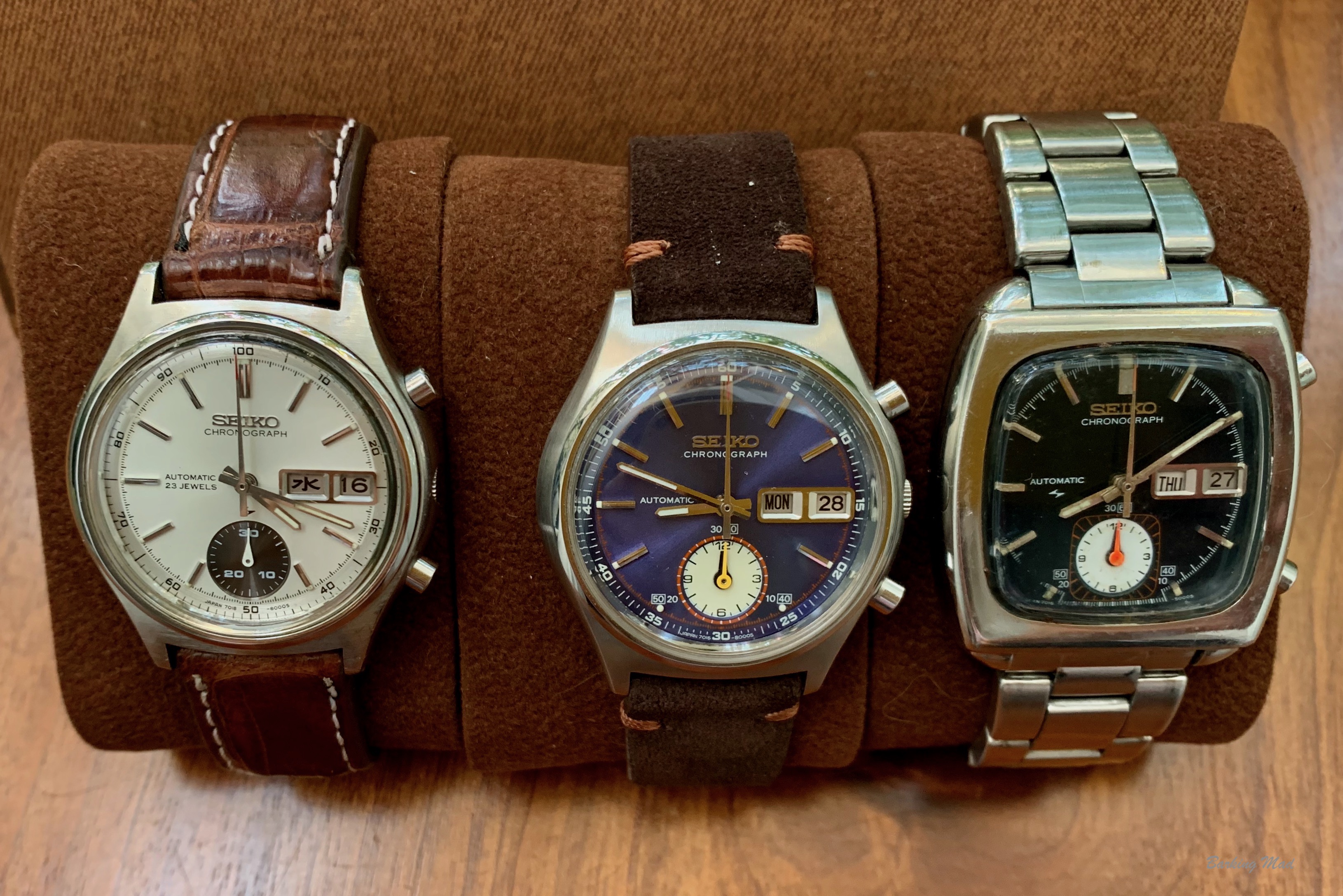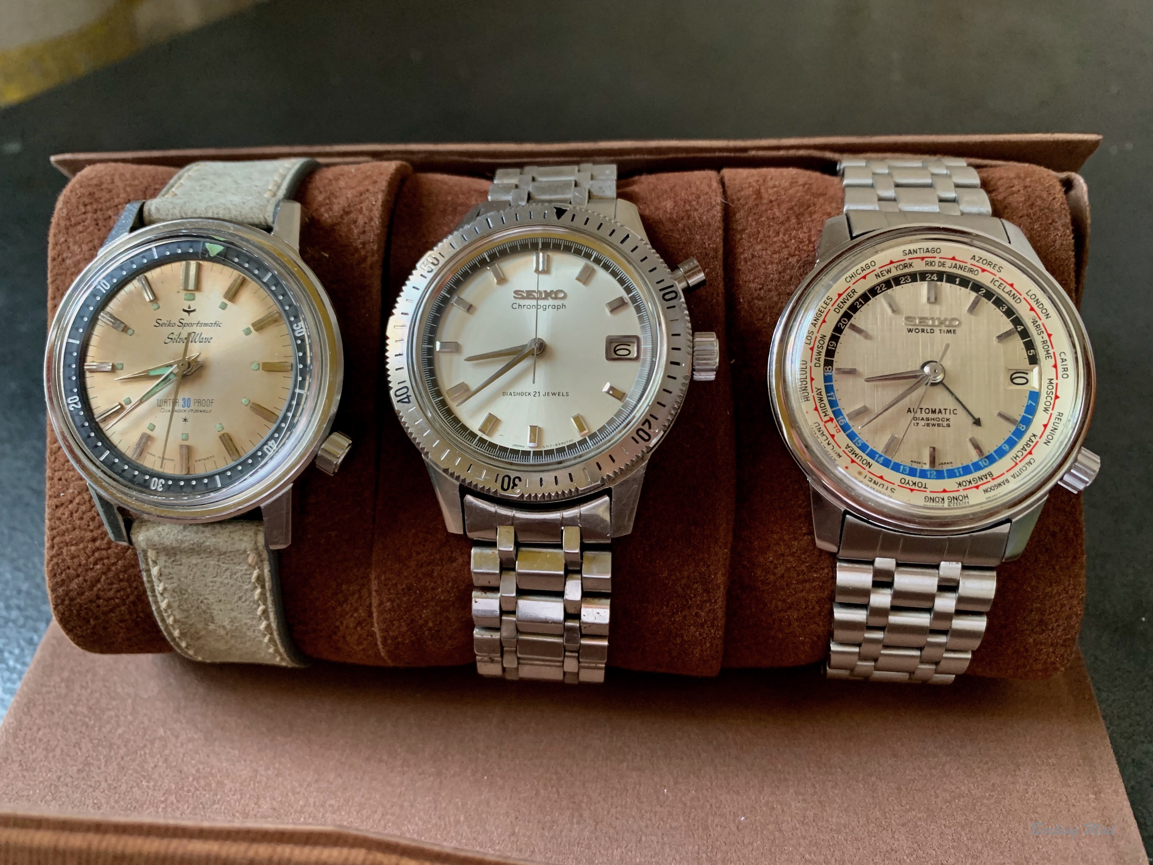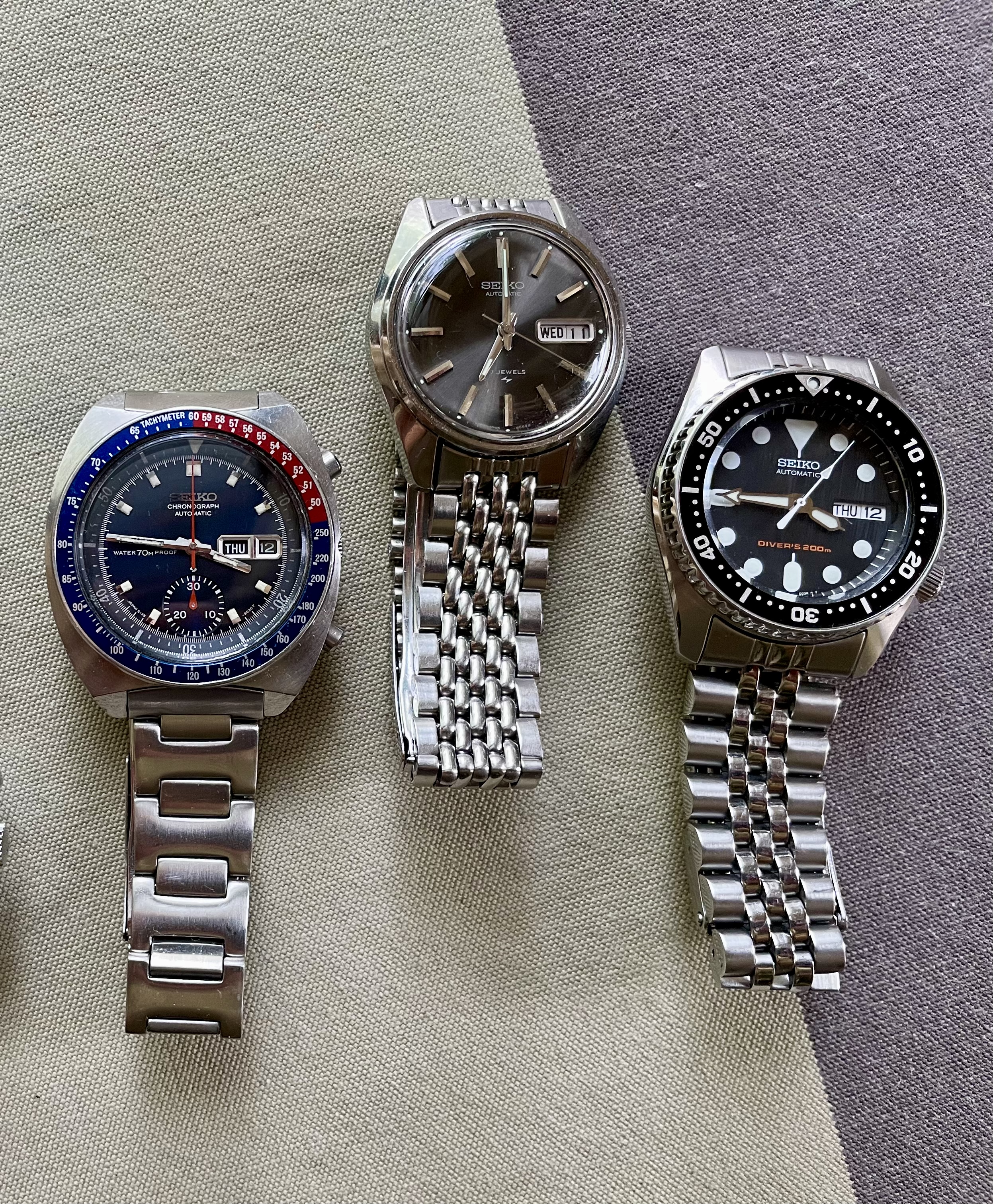 And in the spirit of Dan鈥檚 original post, 3 Seikos. Chrono, dress, dive:
