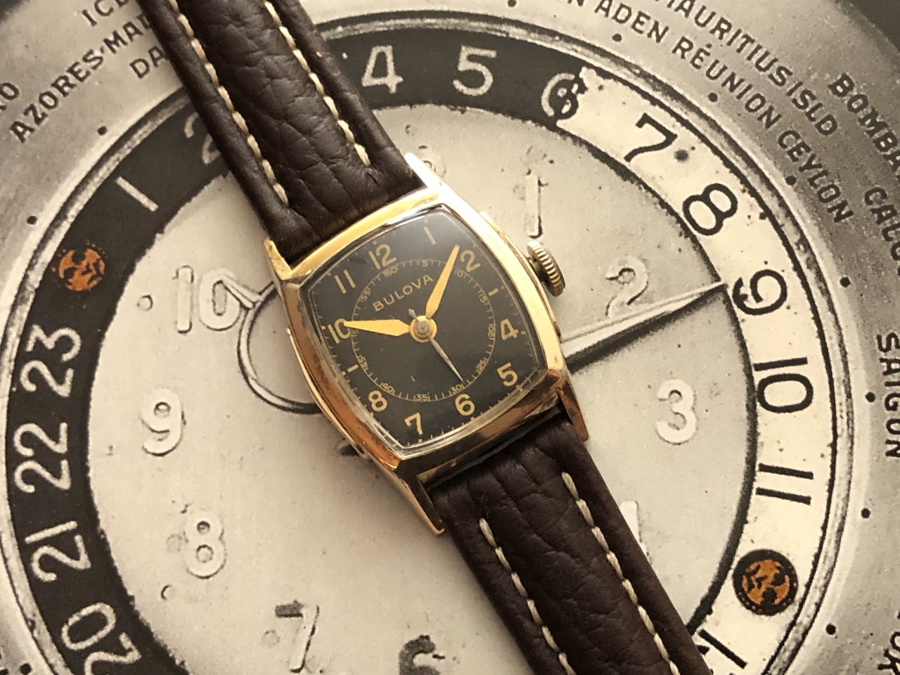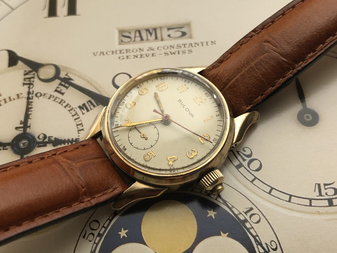 Three Bulova "tool" watches: 1942 single pusher chronograph, reputed to be the smallest production chronograph movement; 1943 "Medical Officer", powered by one of Bulova's early center sweep seconds hand movements cal. 10BA; and, a 1968 "Snorkel".