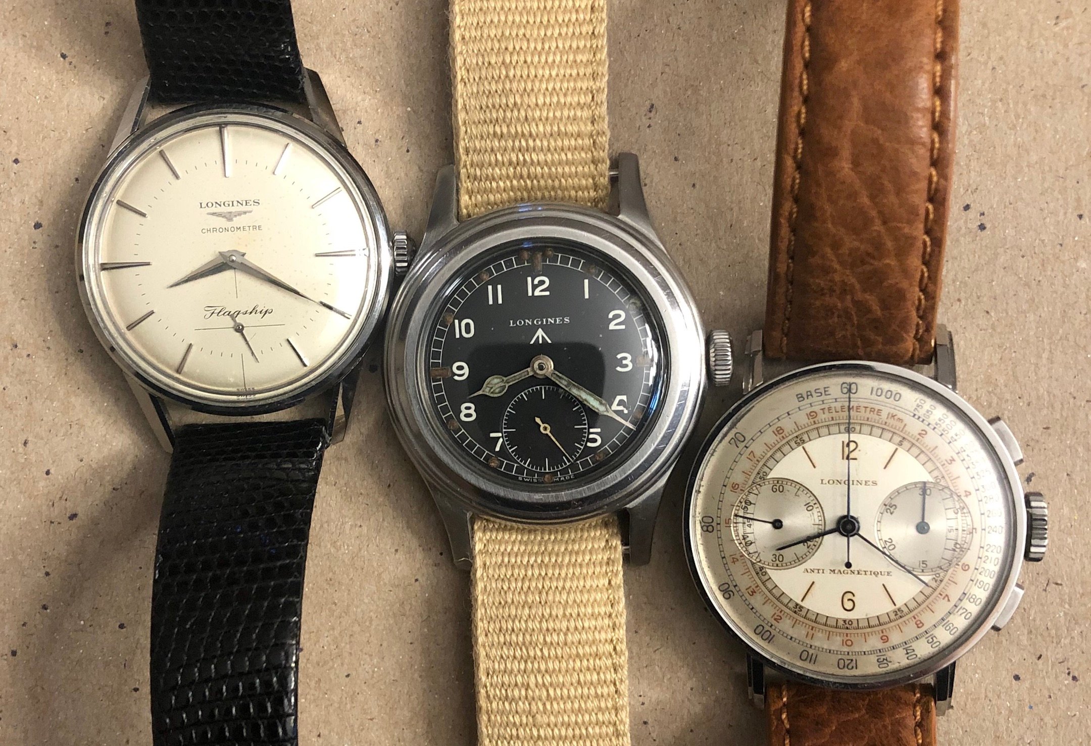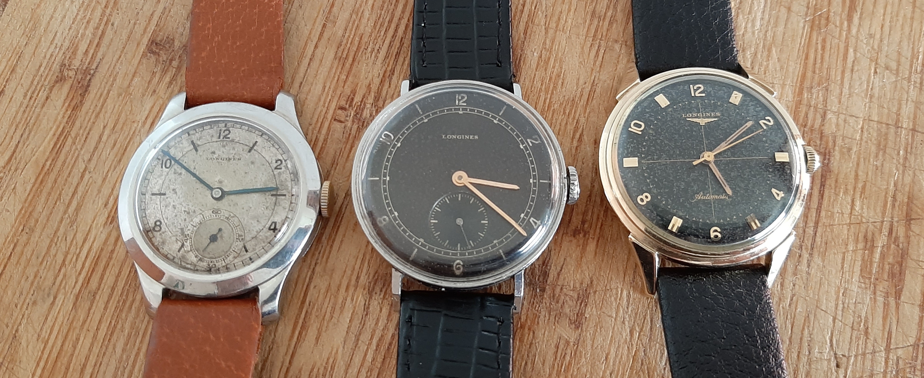 A vintage Longines grouping from the 40s and 50s: dress chronometer, military, and chronograph.