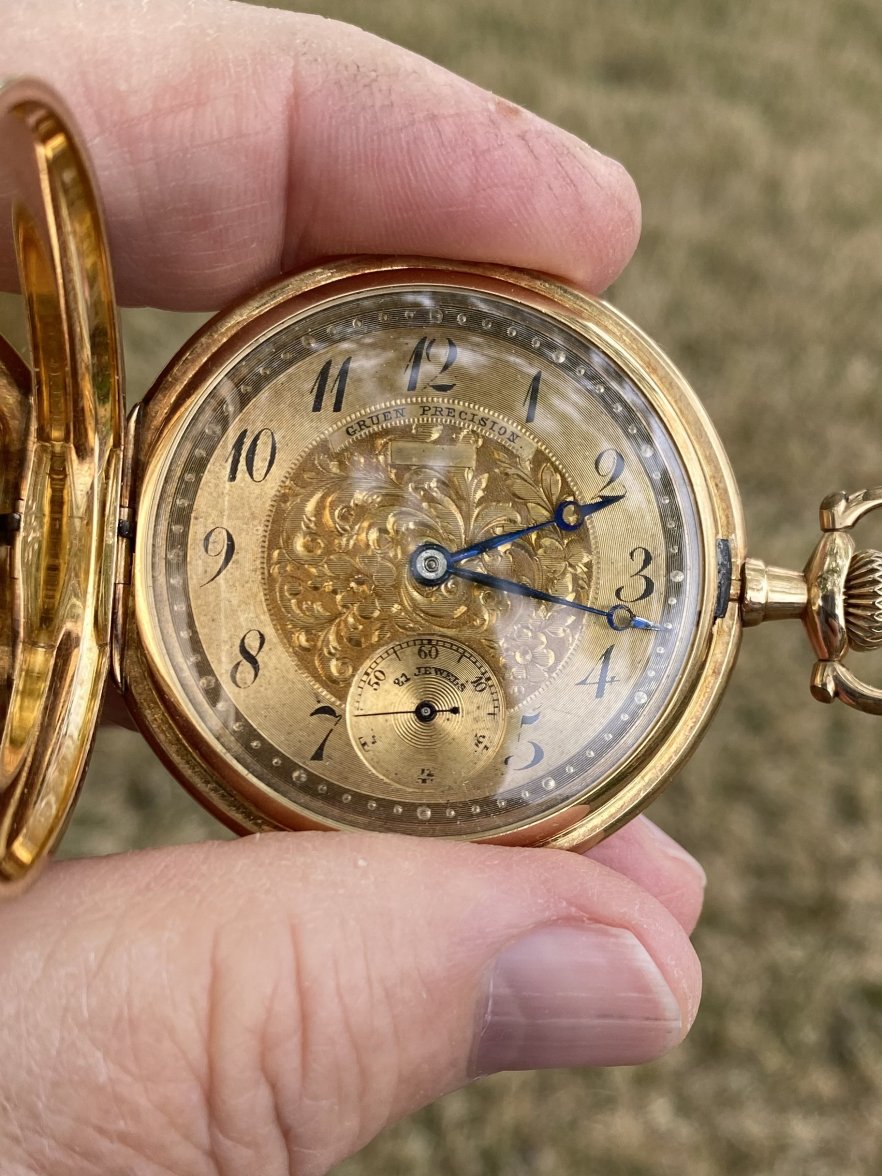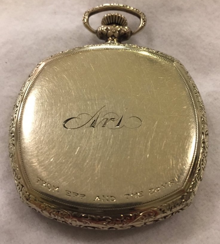 c1921 grade 315 Elgin in an 18k green gold-filled case. A gift to to Art from “Eff and the boys”.