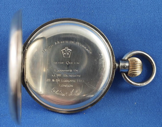This engraving doesn’t celebrate a previous owner, but I can say that the watch belongs to the great grandson of a previous owner. This owner was English, and the watch may even have belonged to someone in the family, before him. You will notice that the engraving Watchmaker by Warrant to the Queen! Anyone want to guess which queen? The case and movement are both Swiss made, and the case is stamped 0.935 (silver) which was not a legal standard in Switzerland when the watch was made. The Swiss made 0.935 silver watch cases for the market in England. This case has a Swiss standard mark for 0.935 which the Swiss established for the alloy in 1887. That standard mark is inside the case back. The standard mark amounts to two larger standing bears, and one smaller standing bear. That means this watch was made after 1887, but before Queen Victoria died in 1901.