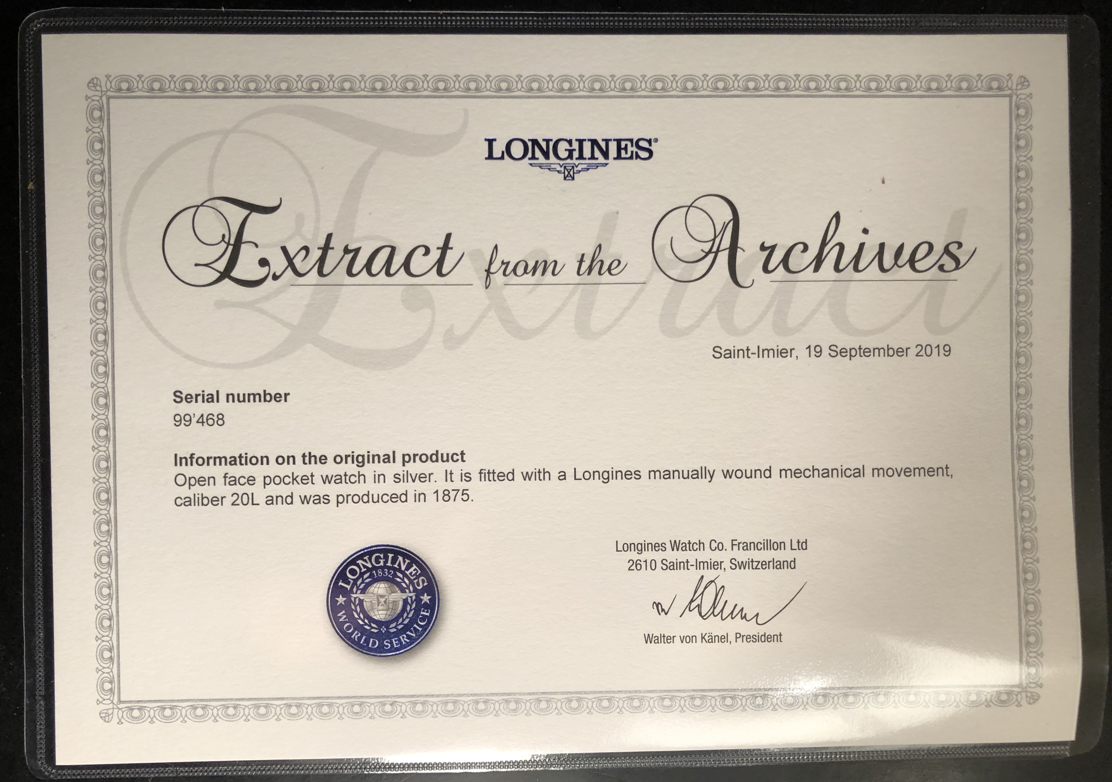 In the letter, it is mentioned that I have the second oldest Longines movement in the Netherlands! And seeing the serial numbers and years, it was a close call (especially seeing the difference from no. 2 to no. 3 on the list...)