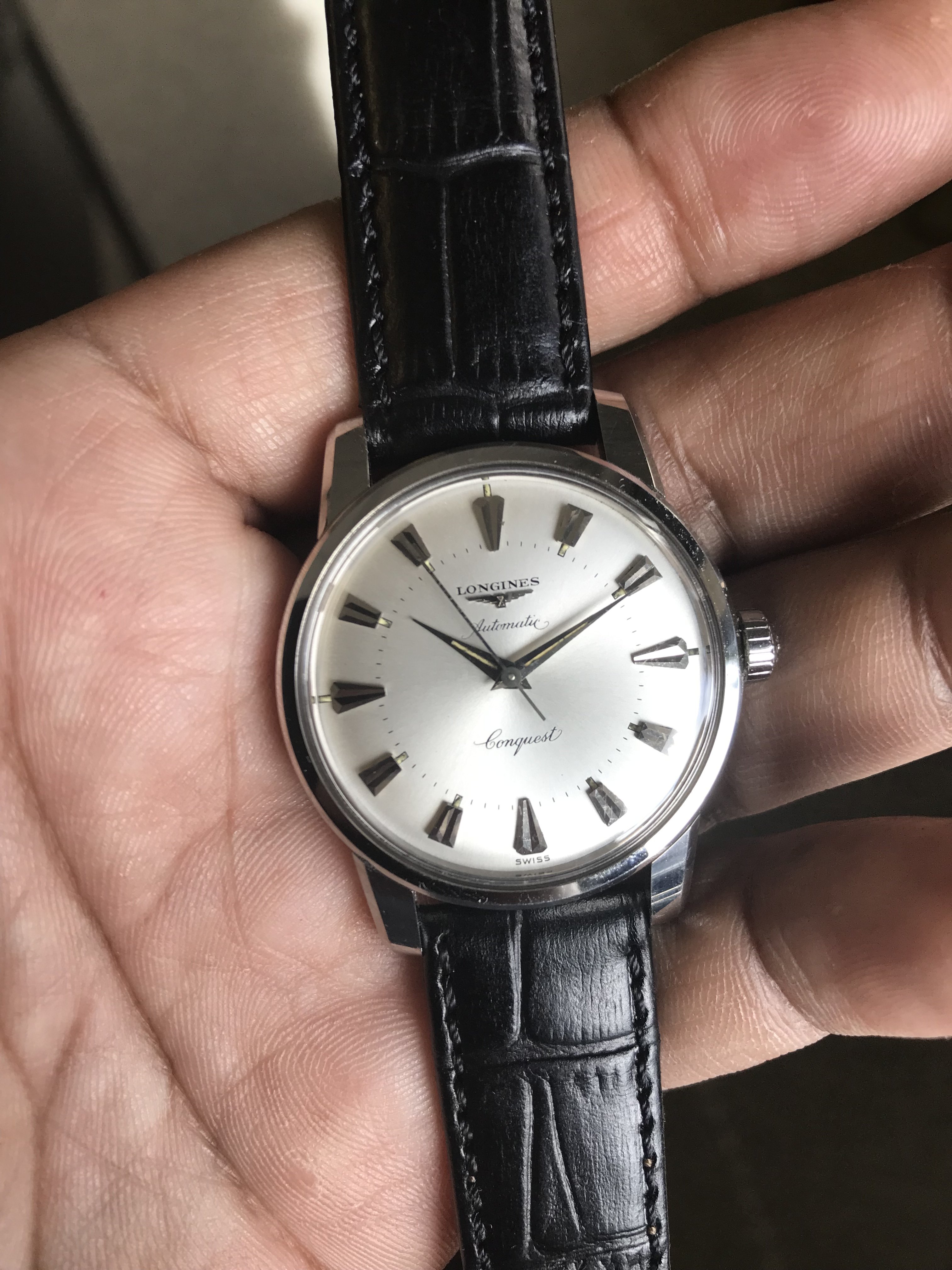 Good evening ΩF. This is my new to me Conquest. As you can see it is in beautiful condition. That said I have not been able to find another late 50s (Ref 9000) example that doesn’t have the faint contrasting ring along the minute track. Of the dials I have found with the same layout/markers as mine that are also devoid of the two-tone ring, they are either a Conquest with a date complication or a later Admiral Conquest. Has anyone seen a dial like mine? I am convinced this is not a redial as are some of my local vintage enthusiast friends. But I’m interested to hear opinions on that.