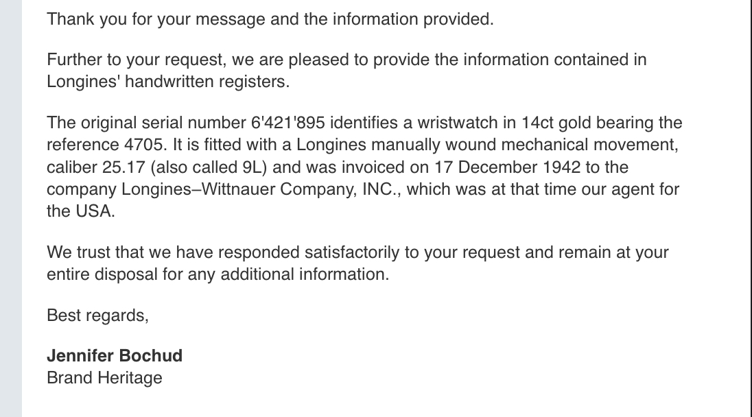 It鈥檚 definitely smaller than what I鈥檇 usually strap on, but I haven鈥檛 bonded with a watch this fast in a while. Barely feels like you鈥檙e wearing a watch and such a charming dial. Ref. 4705 invoiced to the US on December 17th, 1942. Gotta wonder who was buying a gold watch in the middle of WW2.